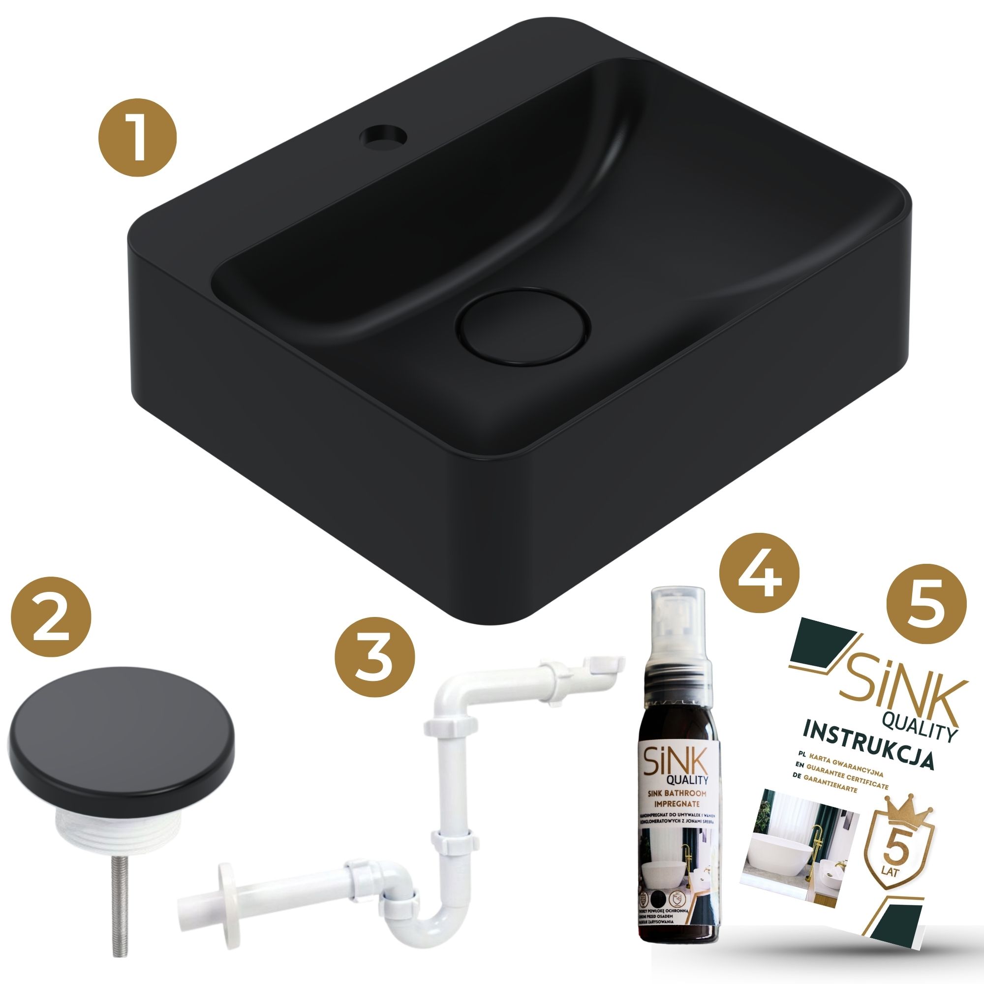 W zestawie znajduje się nowoczesny i trwały spust umywalkowy, który pasuje do każdej łazienki. Ponadto otrzymujesz dekoracyjną maskownicę GRATIS – idealną do dopasowania wyglądu spustu do stylu Twojej łazienki. Dodatkowo, do umywalki można dobrać jeden z pięciu rodzajów syfonów:
