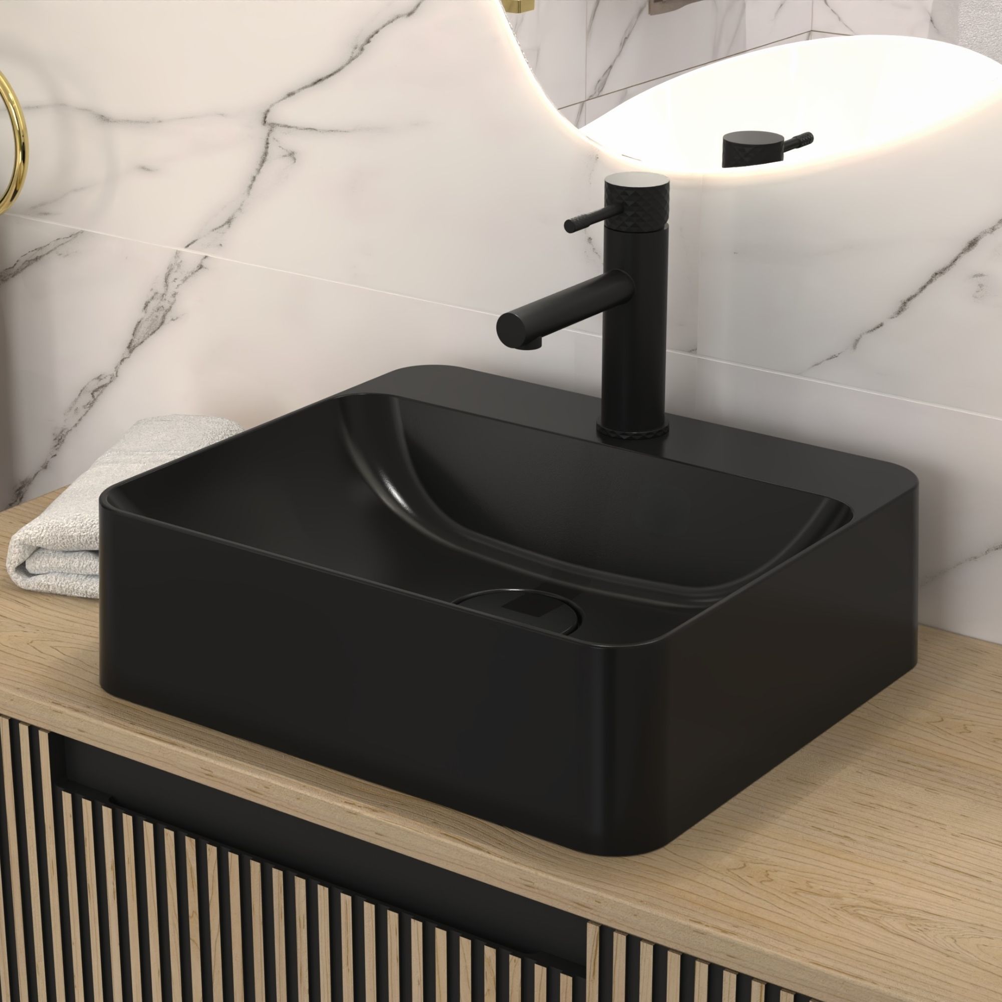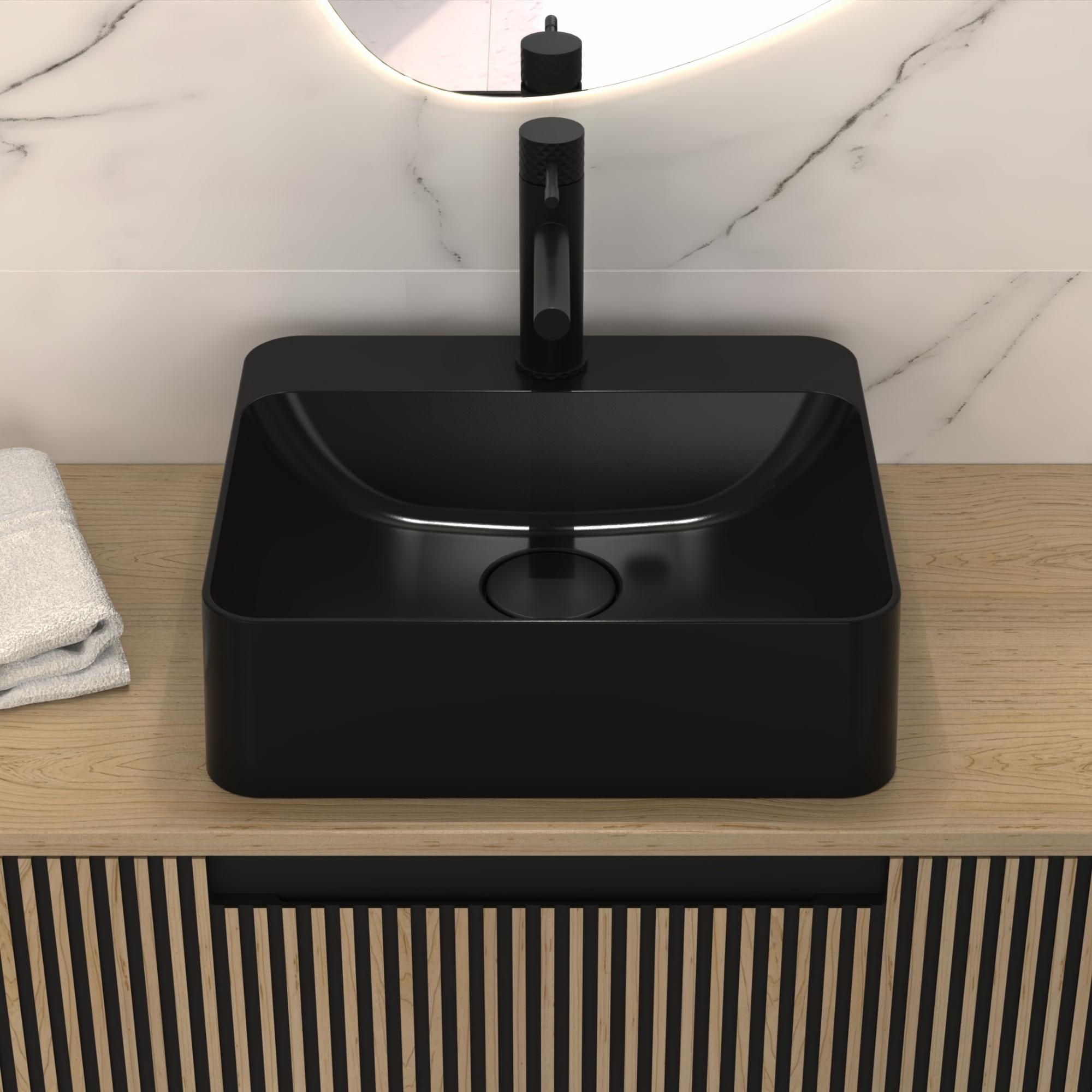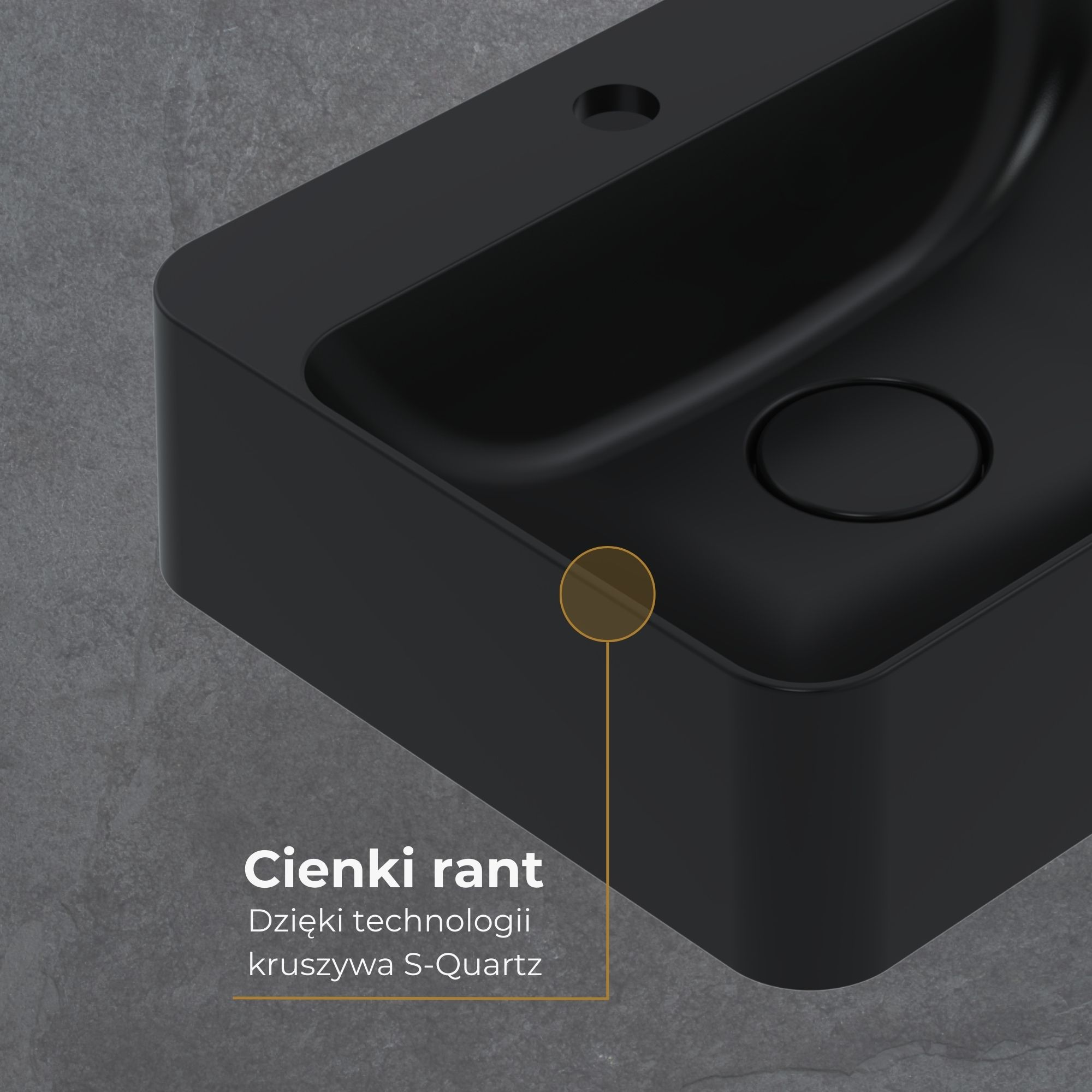S-QUARTZ to zaawansowany technologicznie materiał, stworzony z myślą o trwałości, precyzji i estetyce. Składa się z wysokiej jakości komponentów, które zapewniają wyjątkową odporność na uszkodzenia mechaniczne, zarysowania i szok termiczny. Powierzchnia S-QUARTZ jest hydrofobowa – ogranicza osadzanie się kamienia i znacznie ułatwia czyszczenie. Materiał pozwala na niezwykle dokładne formowanie – z precyzją do milimetra – co przekłada się na perfekcyjne dopasowanie i nowoczesny wygląd. Satynowe wykończenie nadaje umywalce subtelnej elegancji i podkreśla głębię czerni, która nie traci intensywności nawet po wielu latach użytkowania.
