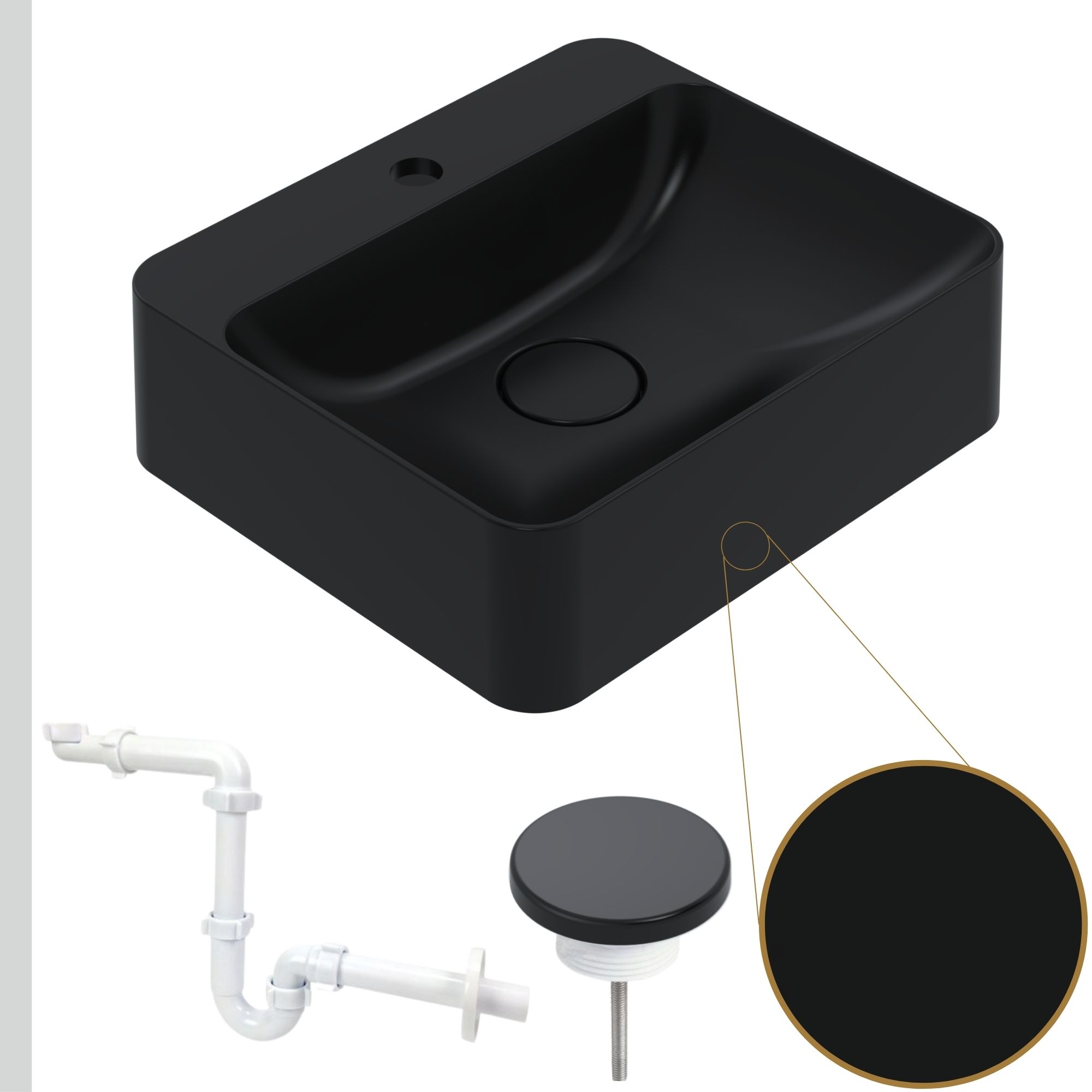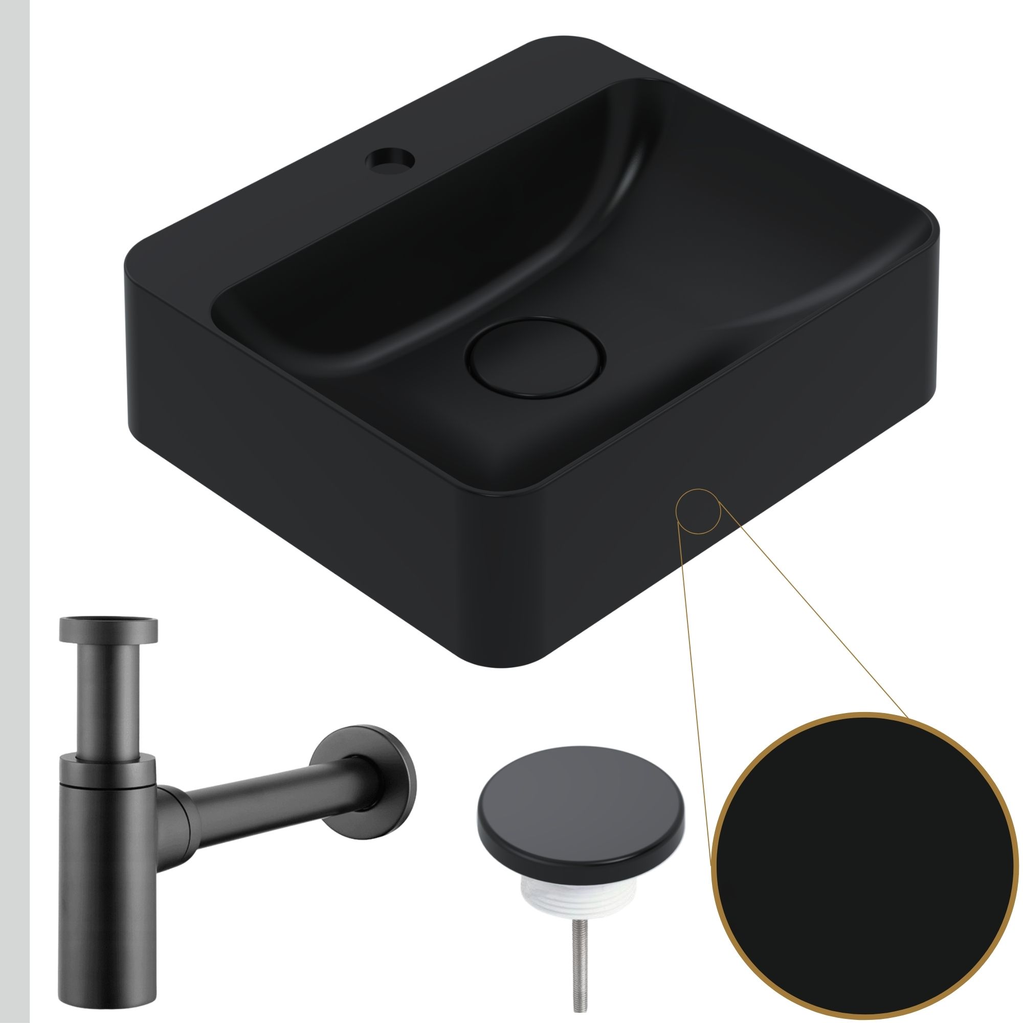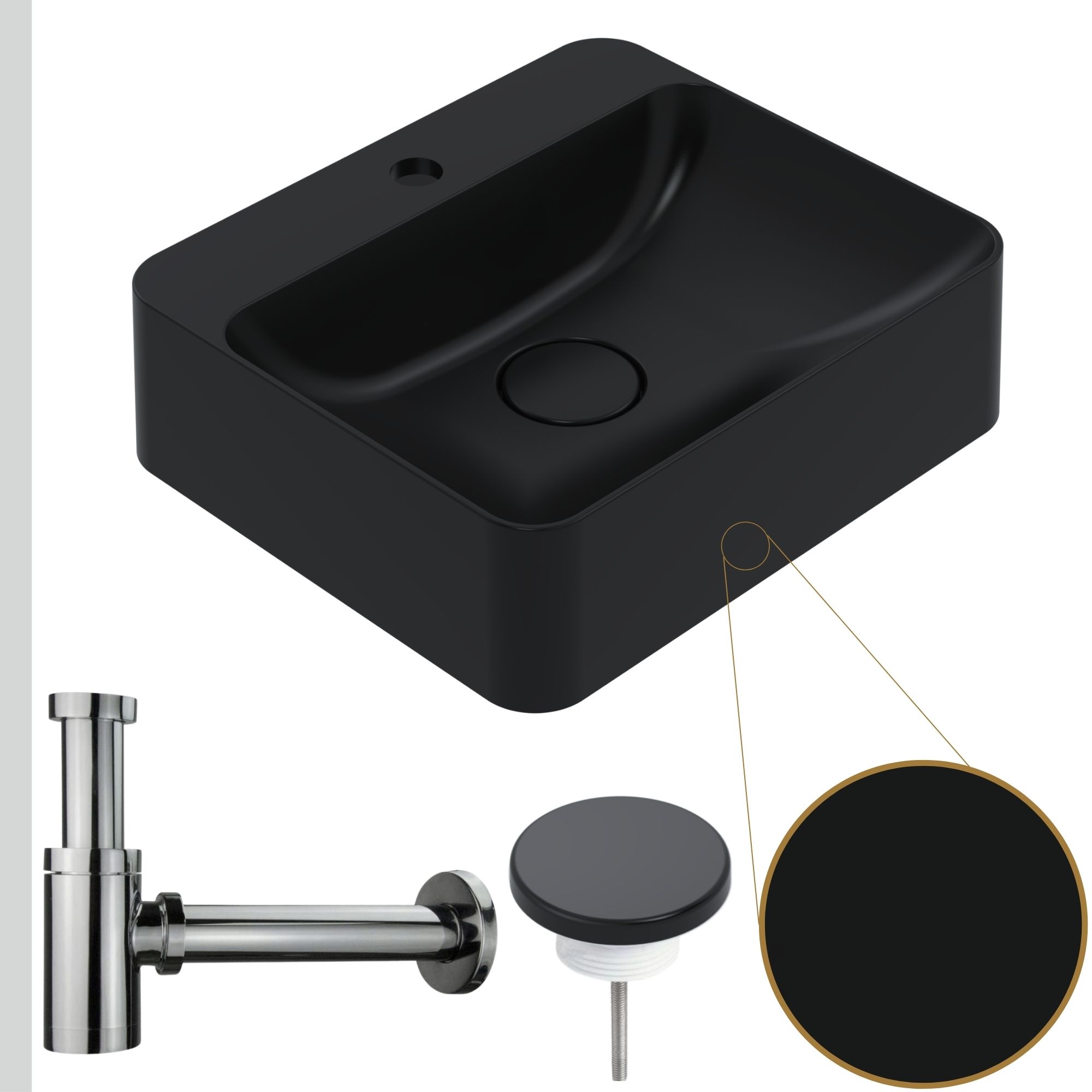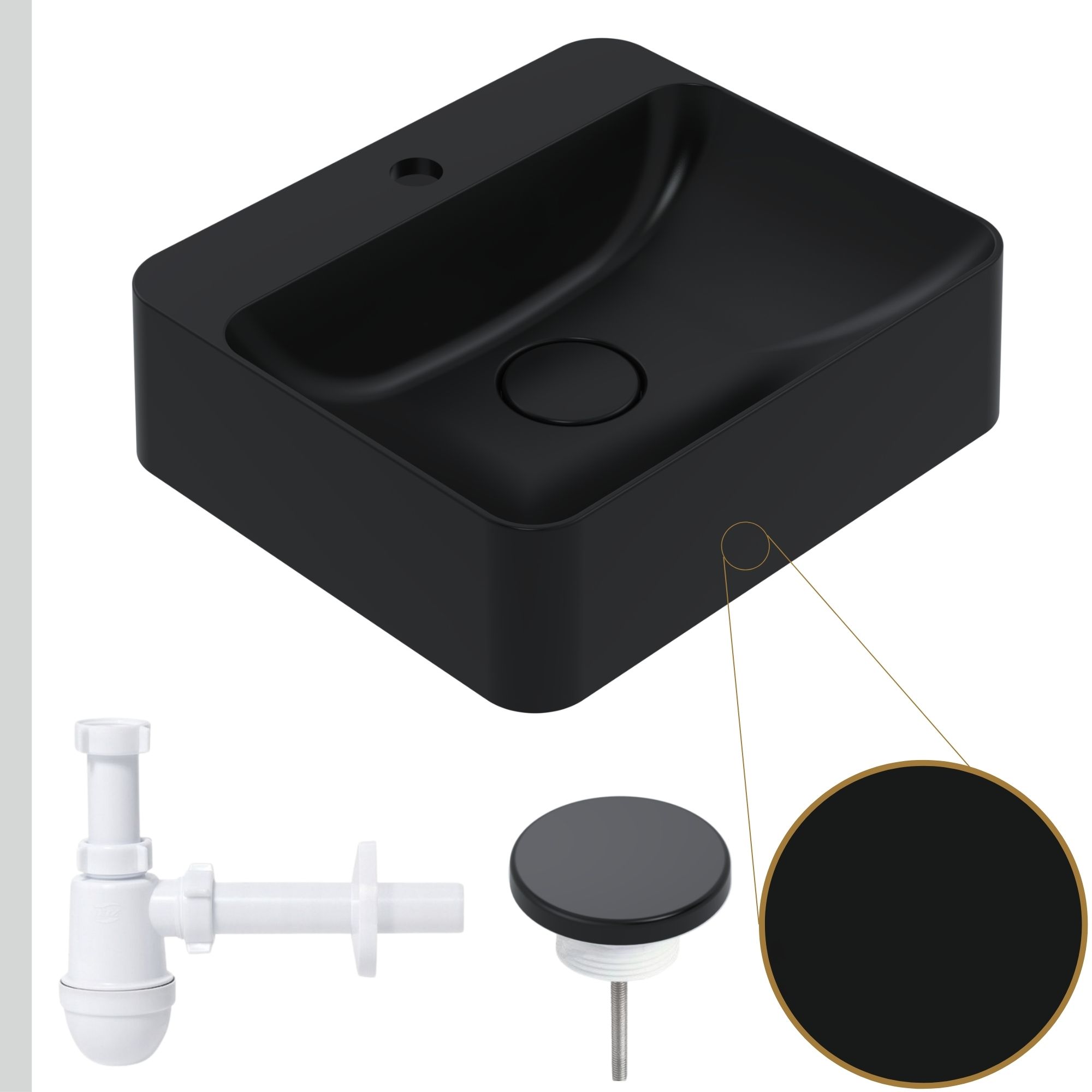 Czarna umywalka Hana z miejscem na baterię + odpływ z maskownicą + syfon