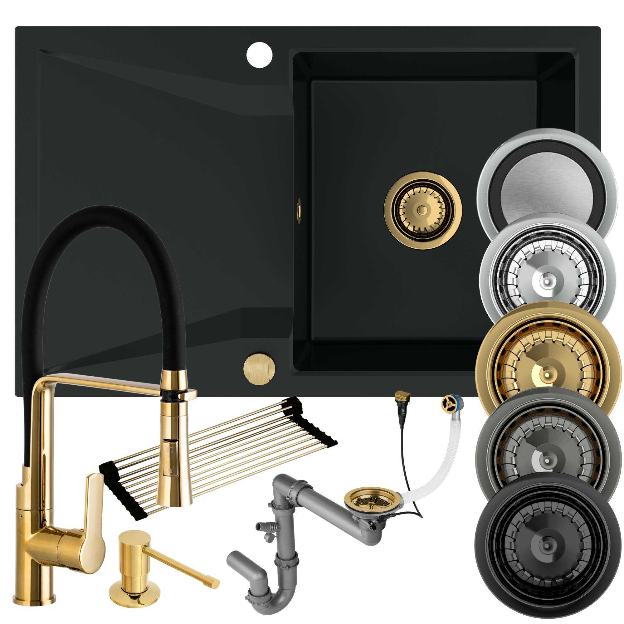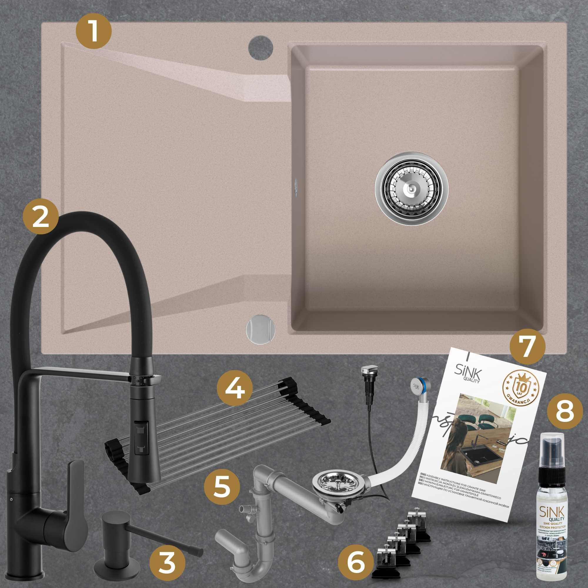 Kuchnia złota: zlew + bateria + dozownik + syfon + mata