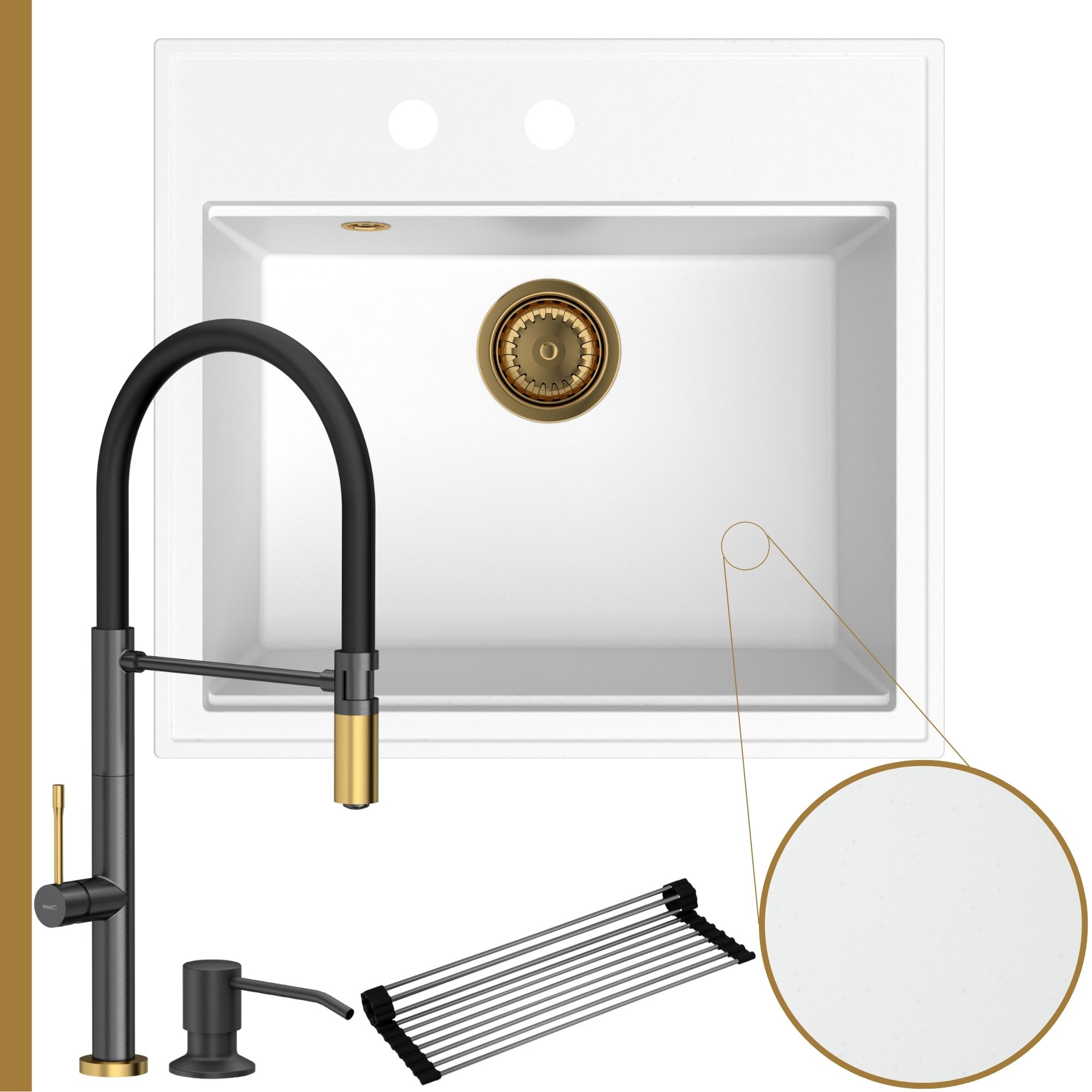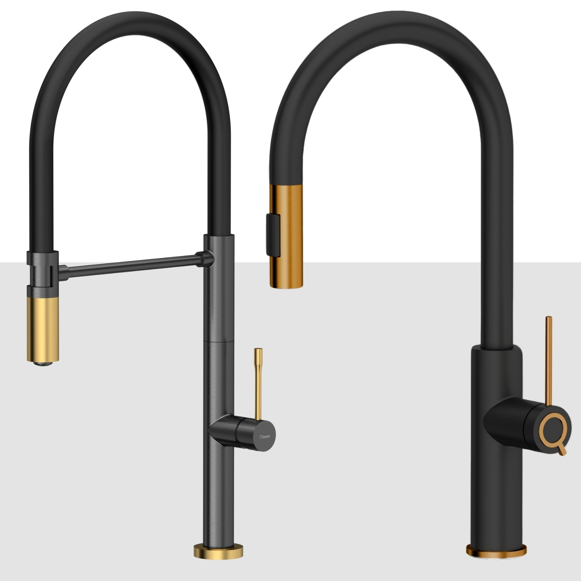 W zestawie kuchennym możesz samodzielnie dobrać baterię kuchenną według własnych preferencji. Pierwsza opcja to bateria MARILYN Q-Line w odcieniu złotym lub karbon, stanowiąca wyrazisty akcent w przestrzeni – świetny wybór dla osób ceniących luksusowe detale.