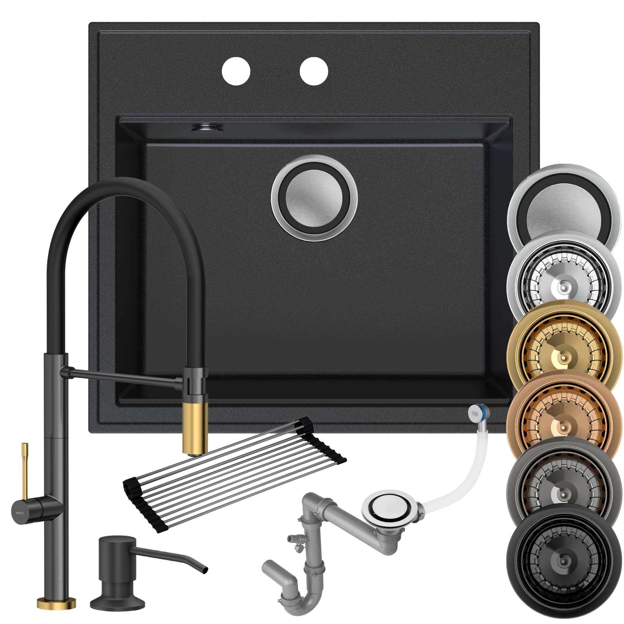 - Wybierz: jeden z siedmiu kolorów zlewu, dobierz jeden z czternastu syfonów i jeden z czterech zestawów bateria + dozownik