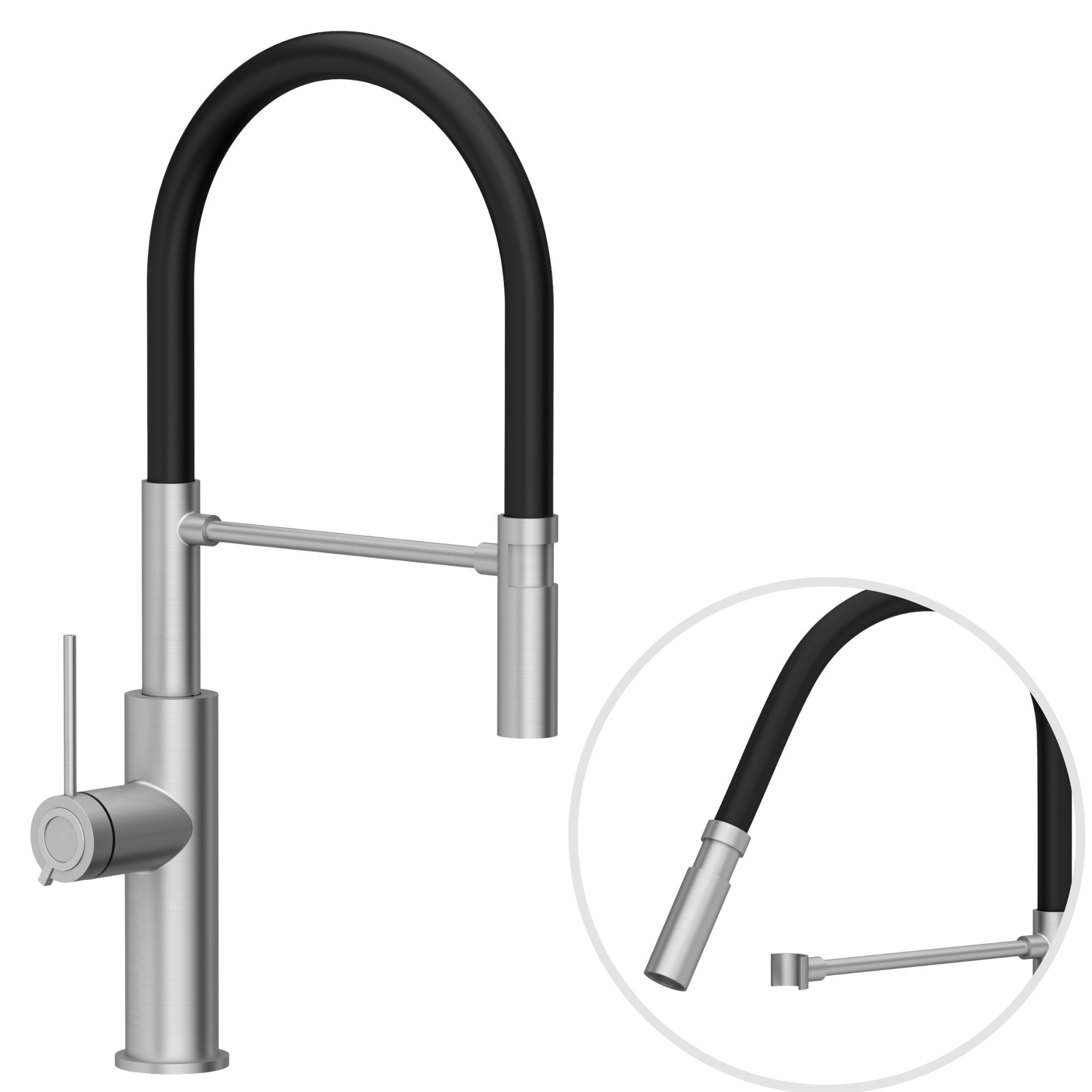 Wysoka, designerska bateria z elastyczną wylewką, która perfekcyjnie współgra ze zlewozmywakami granitowymi. Praktyczna podpora wyposażona w magnes gwarantuje stabilne mocowanie nad komorą zlewozmywaka, co maksymalnie podnosi komfort pracy i dba o nieskazitelną estetykę całego zestawu.