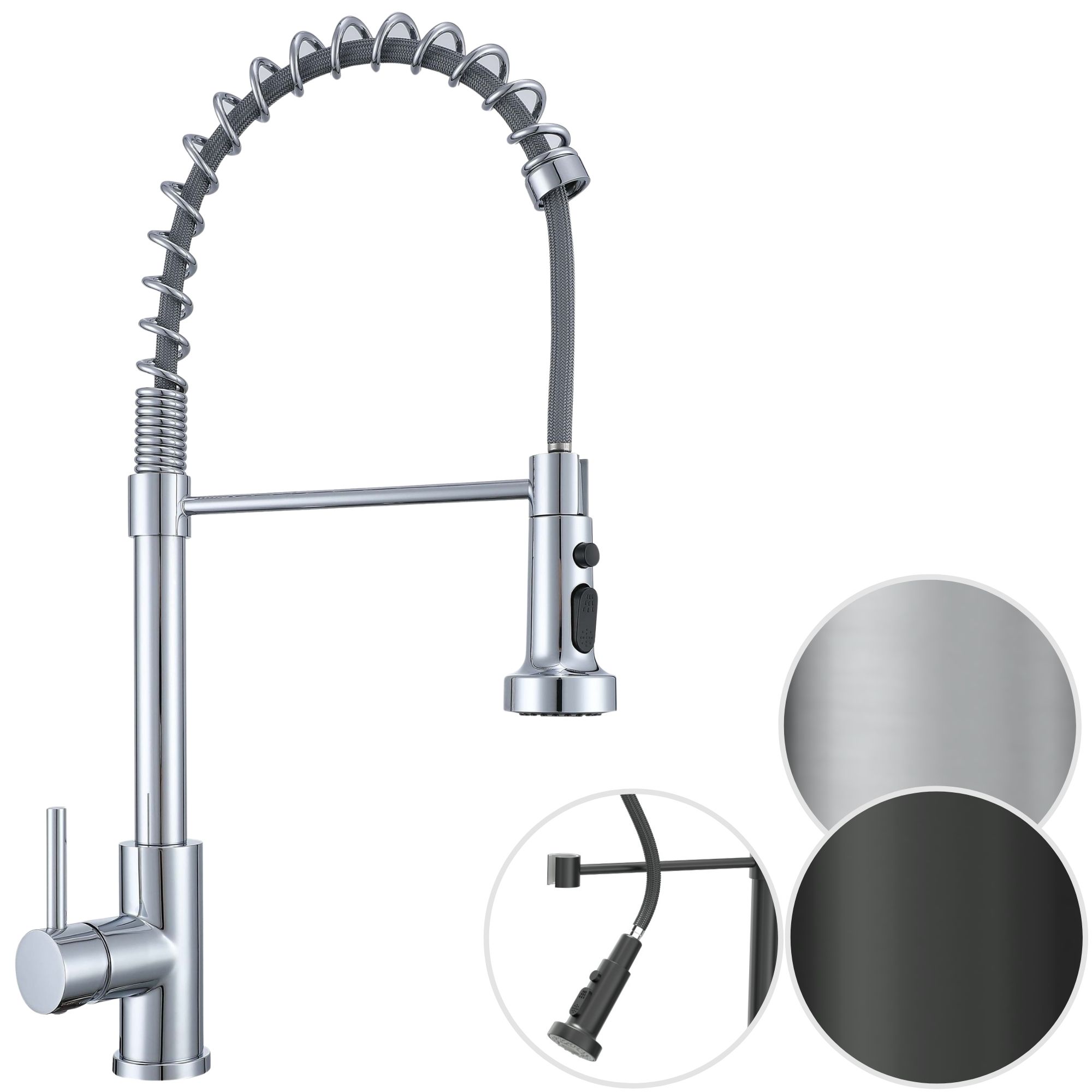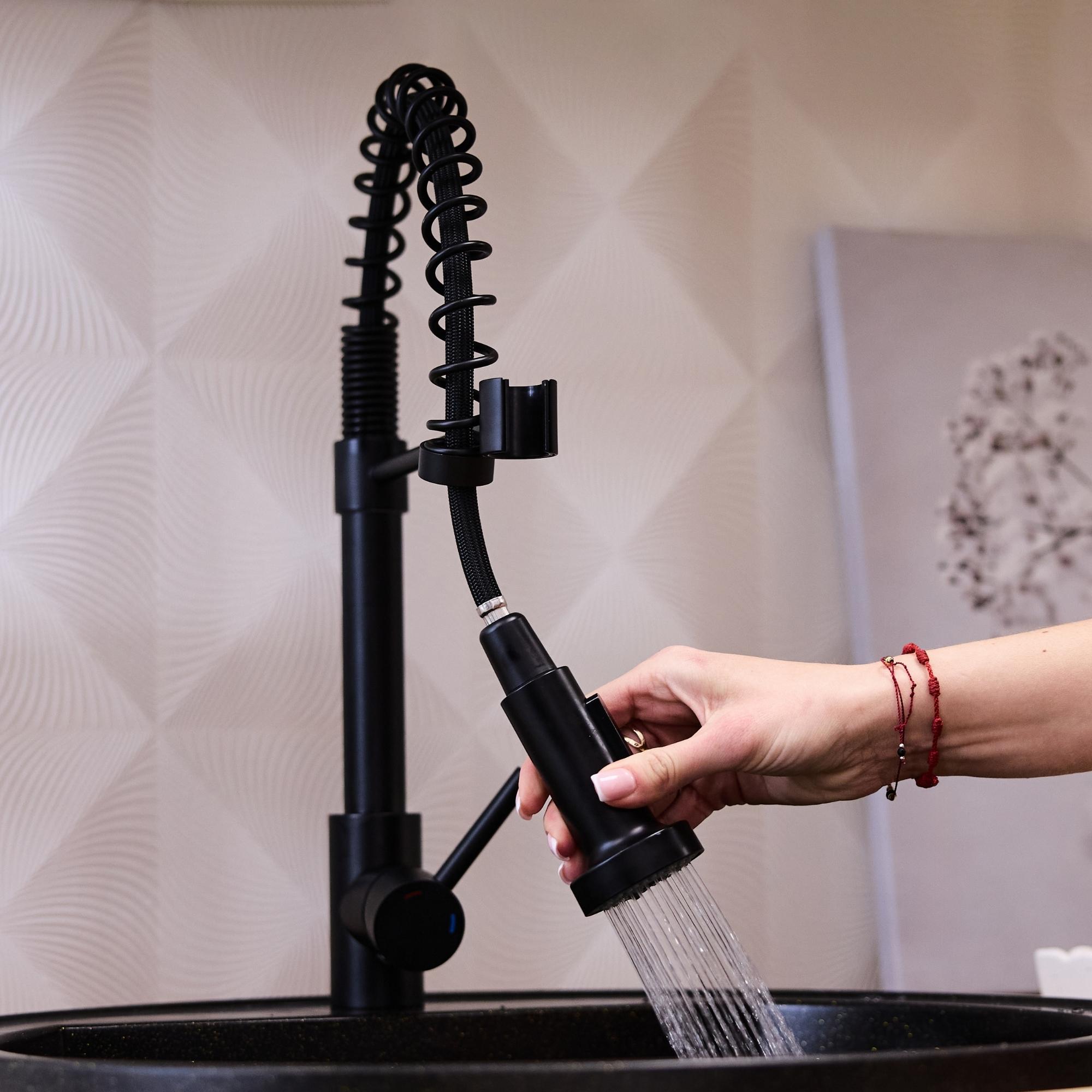 Designerska wysoka elastyczna bateria kuchenna w trzech kolorach: stalowym, czarnym lub chromowanym idealnie pasuje kolorystycznie do zlewozmywaków granitowych. Stalowy korpus połączony z elastyczną sprężynową wylewką, tworzy nowoczesne i trwałe rozwiązanie do stylowej kuchni.