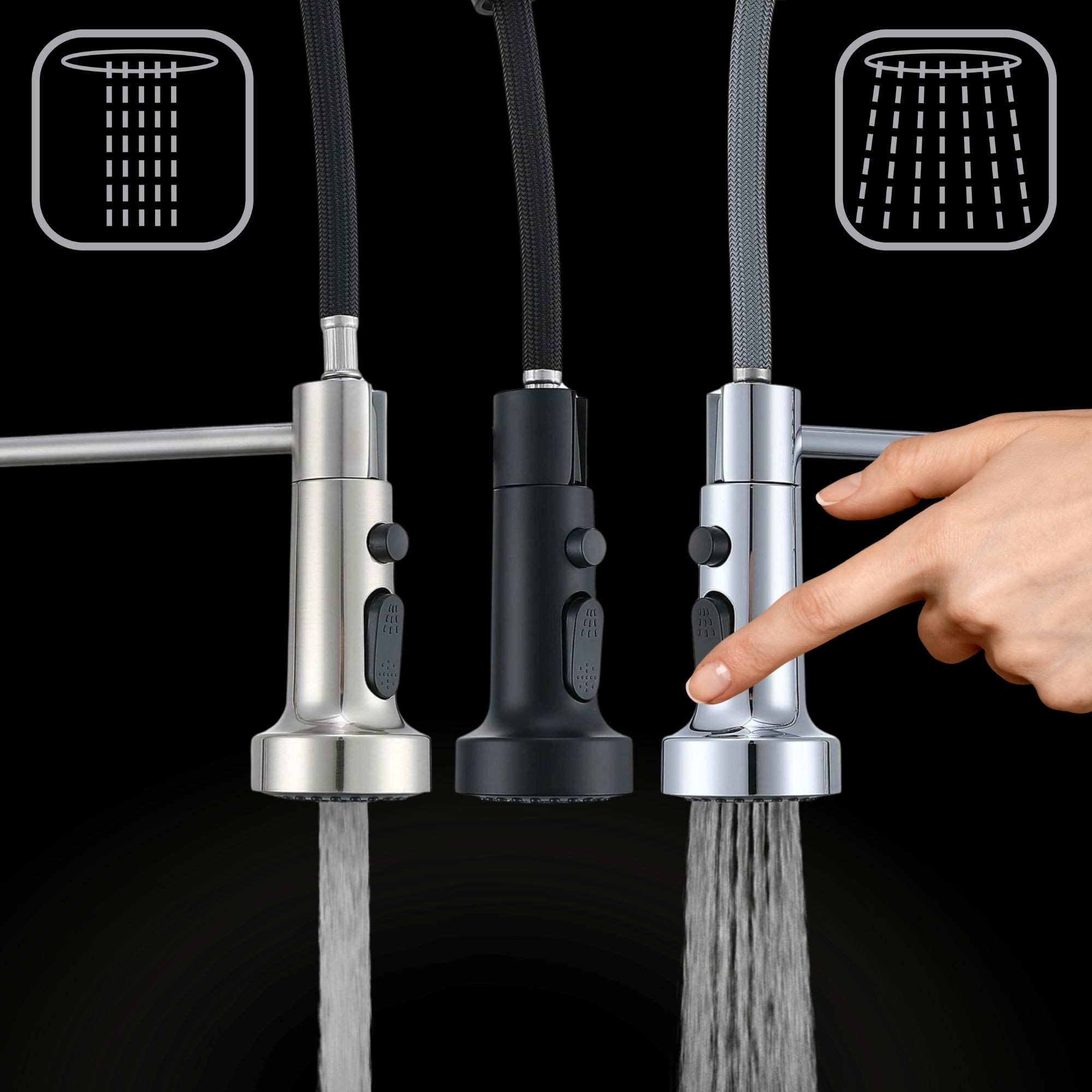 Zapewnia wygodę bez względu na kąt mocowania. Płynnie dostosowuje siłę strumienia i reguluje temperaturę wody. Uchwyt zamontujesz w dowolną stronę – prawo/lewo ręcznie lub frontalnie.