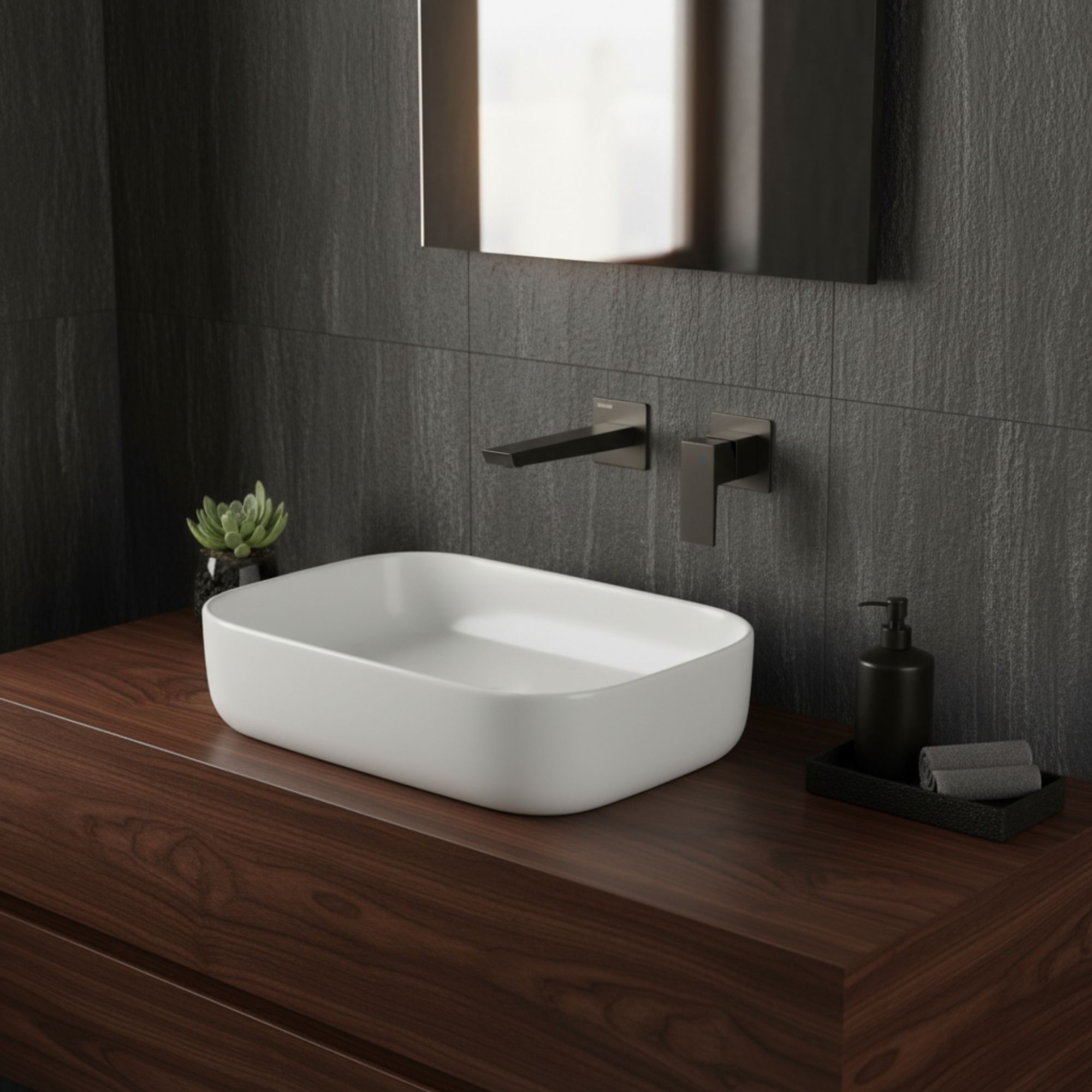 Wersja Gun Metal to propozycja dla miłośników surowej elegancji i stylu modern premium. To intrygujące, ciemnoszare wykończenie o matowej powierzchni pięknie komponuje się z ciemnymi dodatkami metalicznymi, kamieniem oraz gładkim konglomeratem, tworząc w łazience atmosferę nowoczesnego luksusu i unikalnego stylu.