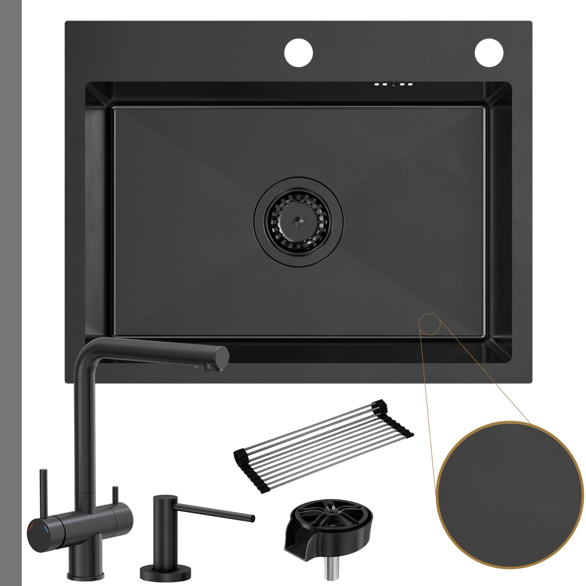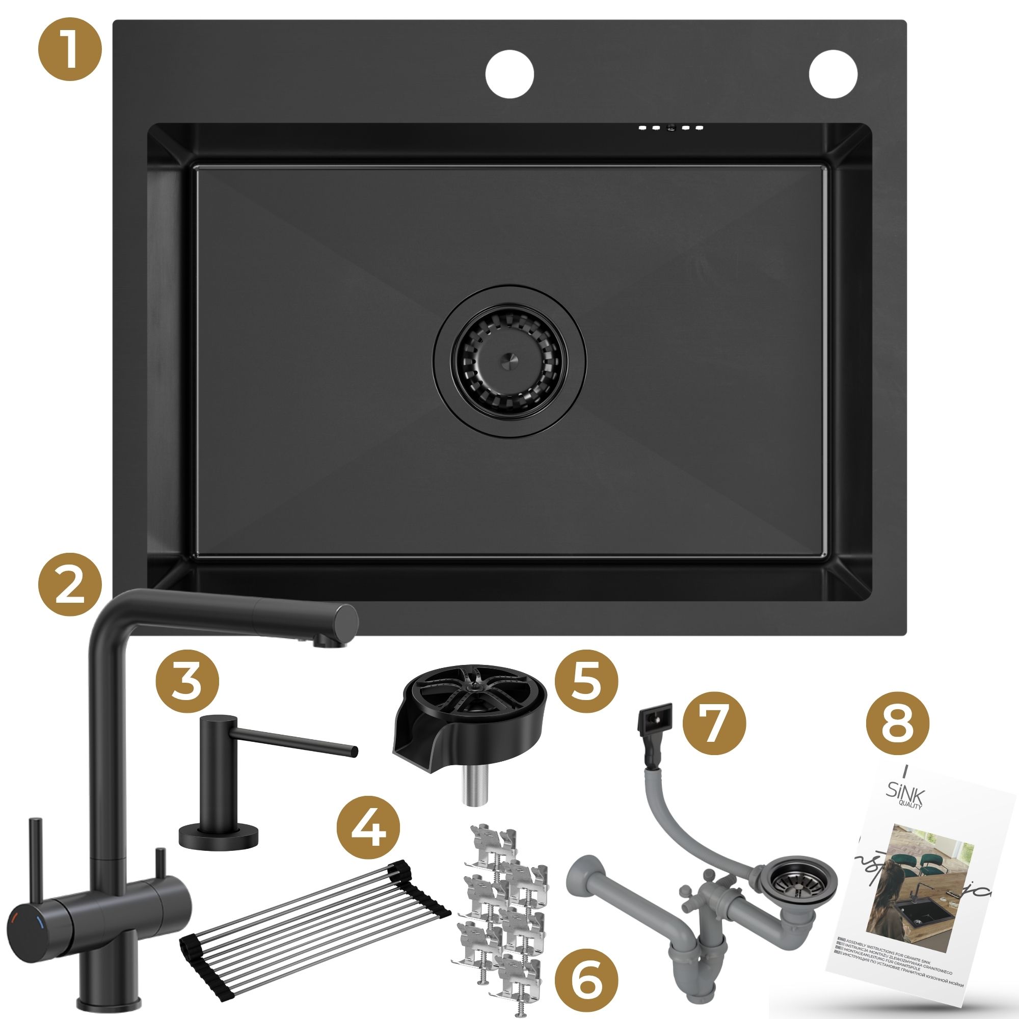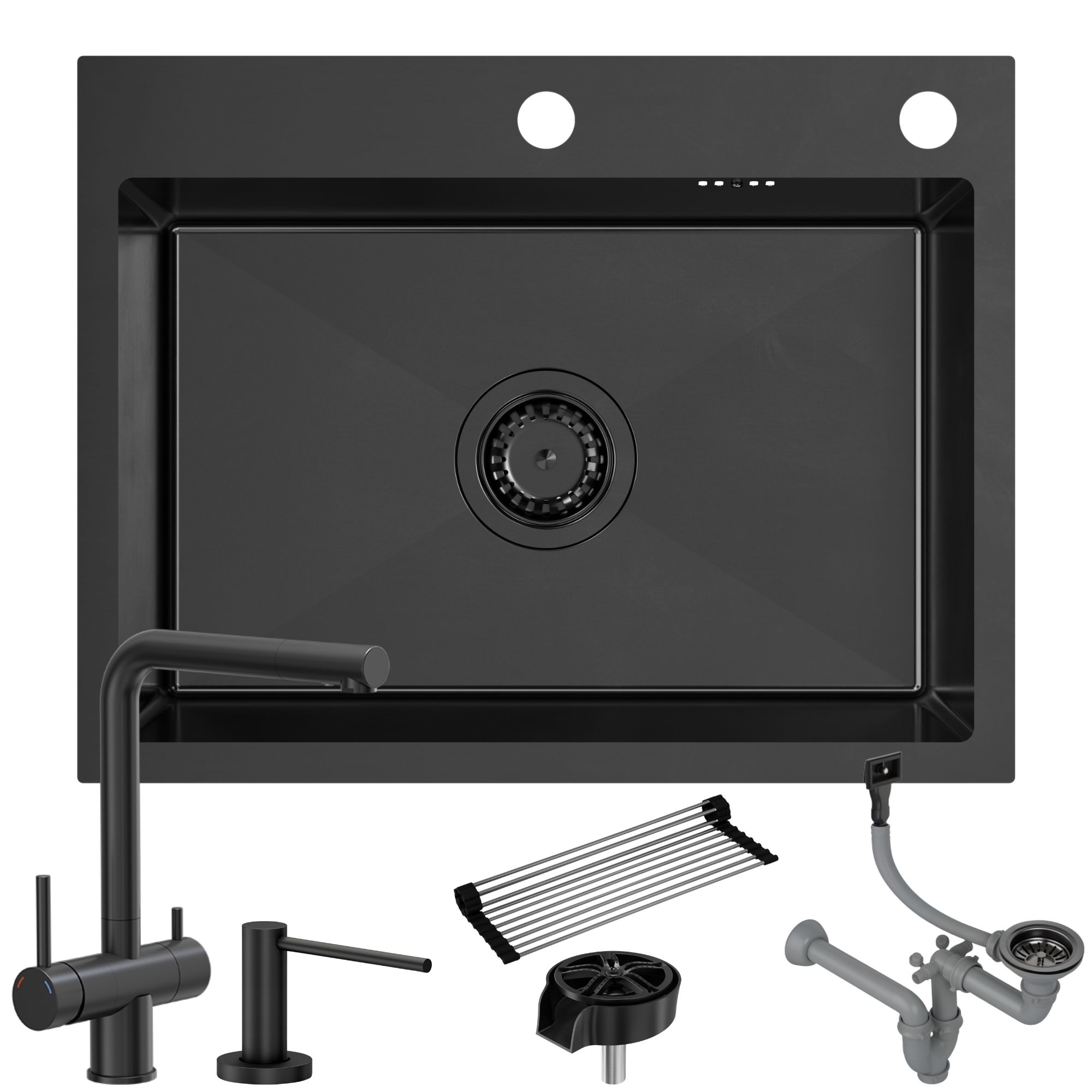Funkcjonalna kuchnia stalowa: zlew + bateria + syfon + dozownik + myjka + mata