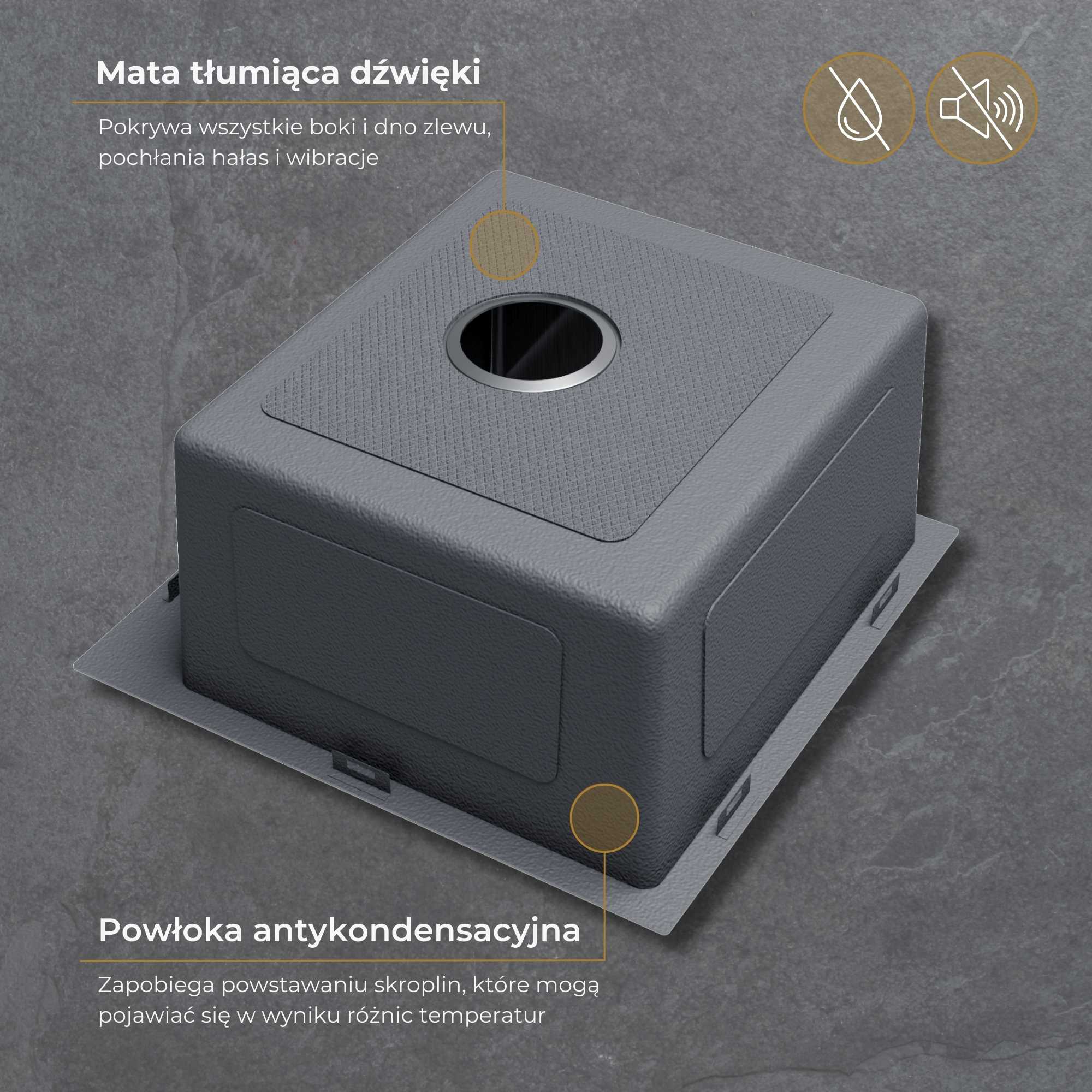 Zlew został zaprojektowany z myślą o cichym użytkowaniu podczas codziennych czynności. Specjalna powłoka i mata wyciszająca skutecznie tłumią dźwięki, ograniczając ich głośność. Dodatkowo, zmniejszone odczuwanie wibracji pozwala na bezpieczne zamontowanie młynka bez obaw o uszkodzenie zlewozmywaka.
