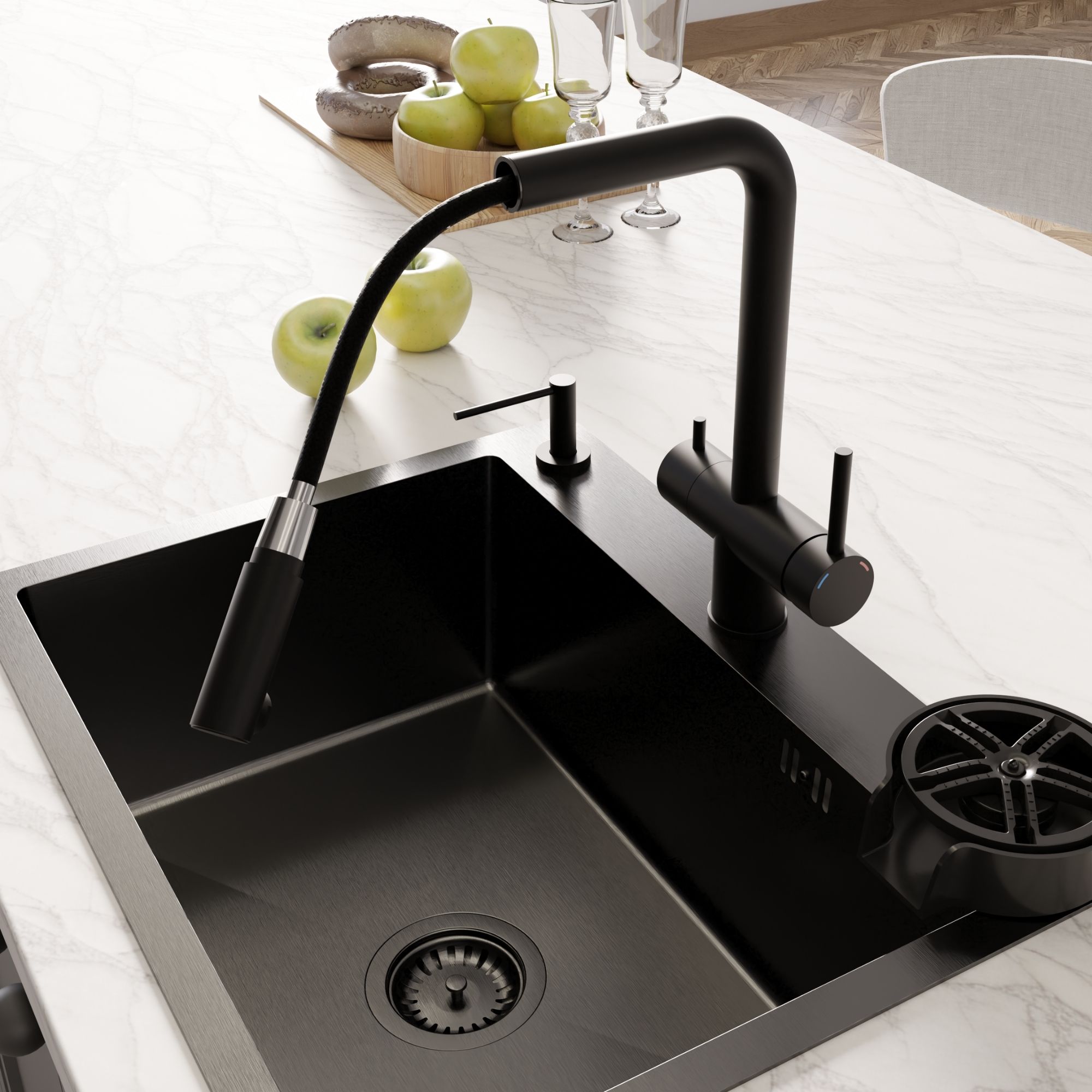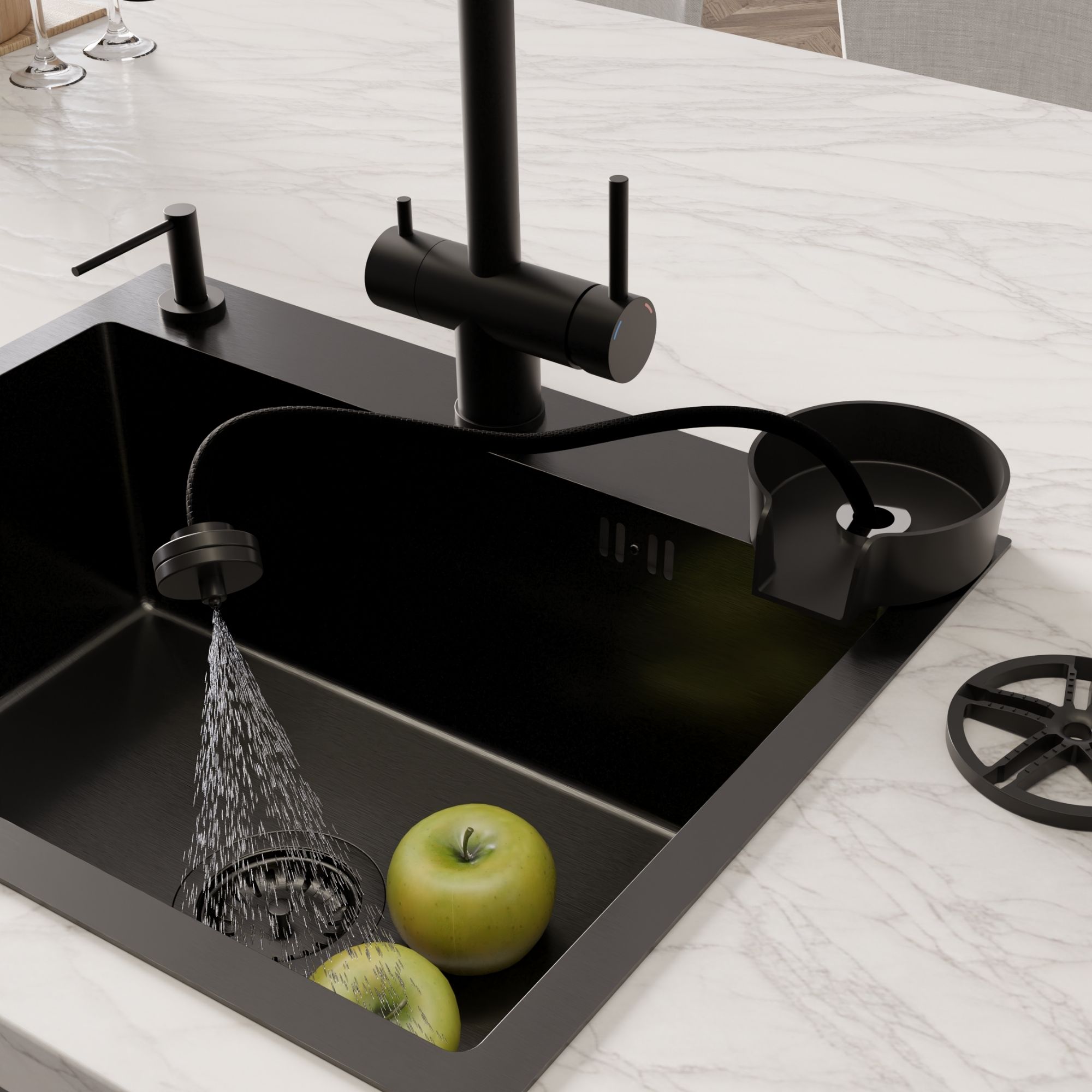 Wykończenie w głębokim kolorze pure carbon nadaje jej estetyczny, nowoczesny wygląd, który doskonale komponuje się z armaturą kuchenną. Dzięki zastosowaniu wytrzymałego tworzywa ABS, produkt jest odporny na uszkodzenia mechaniczne oraz wysokie temperatury, co gwarantuje jego długowieczność.