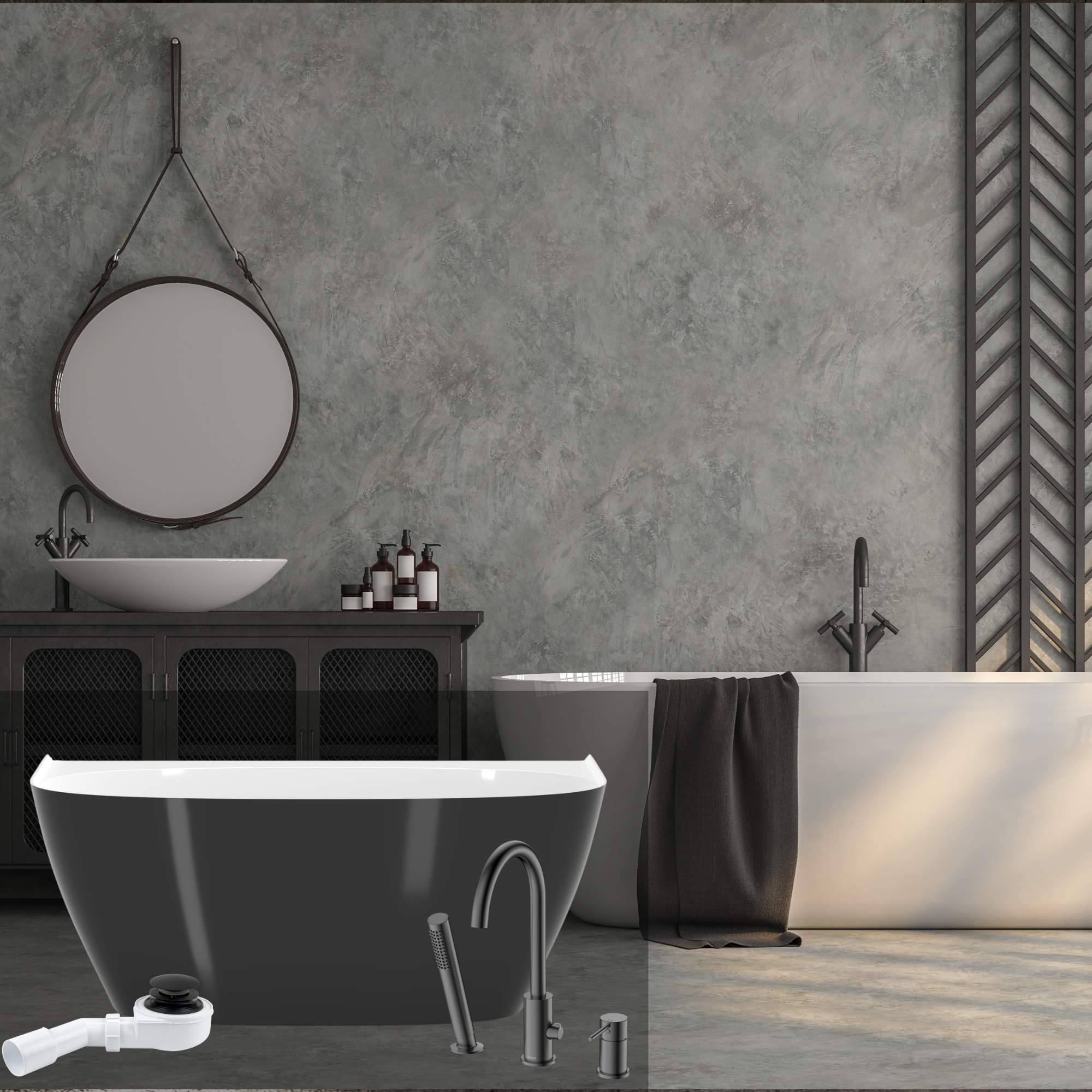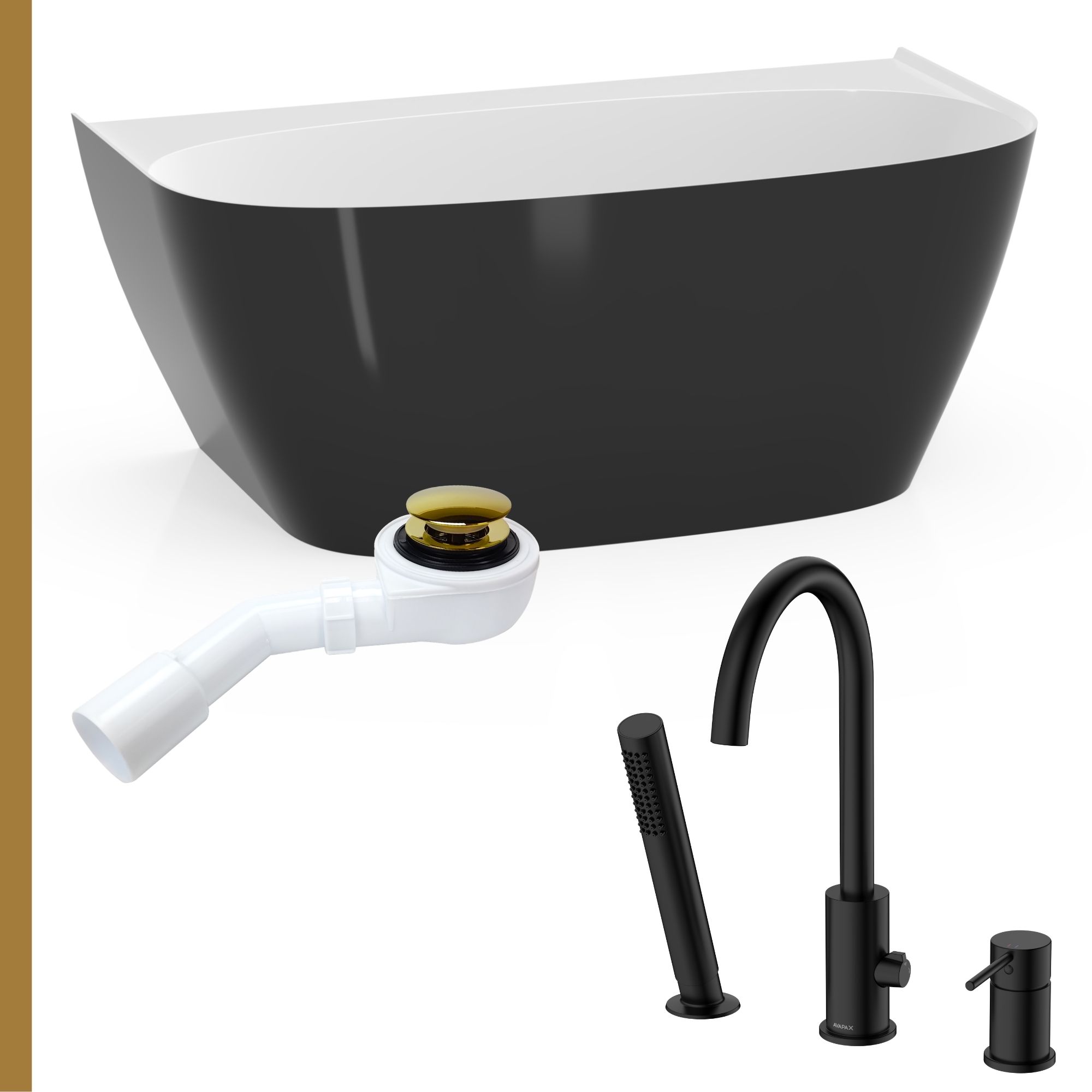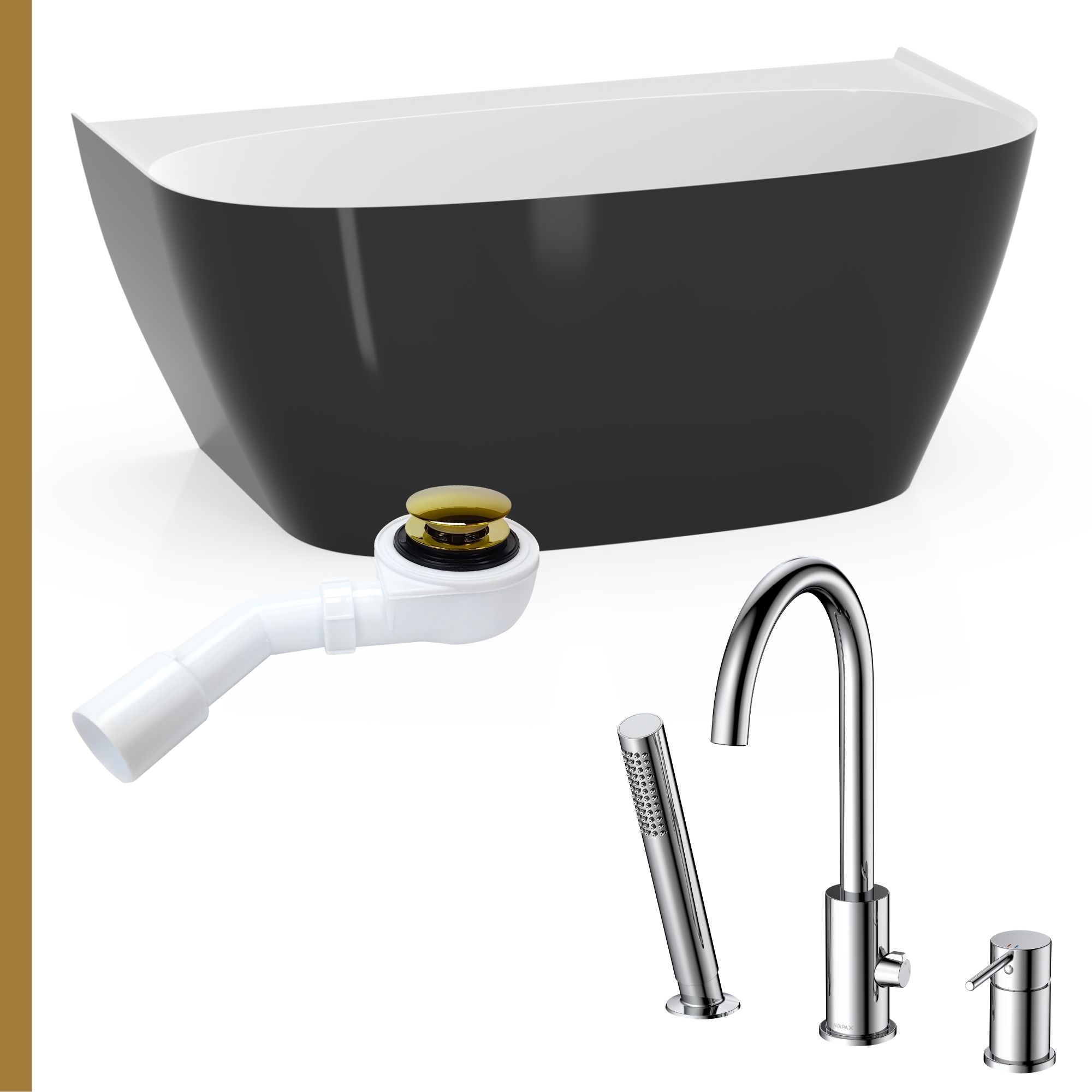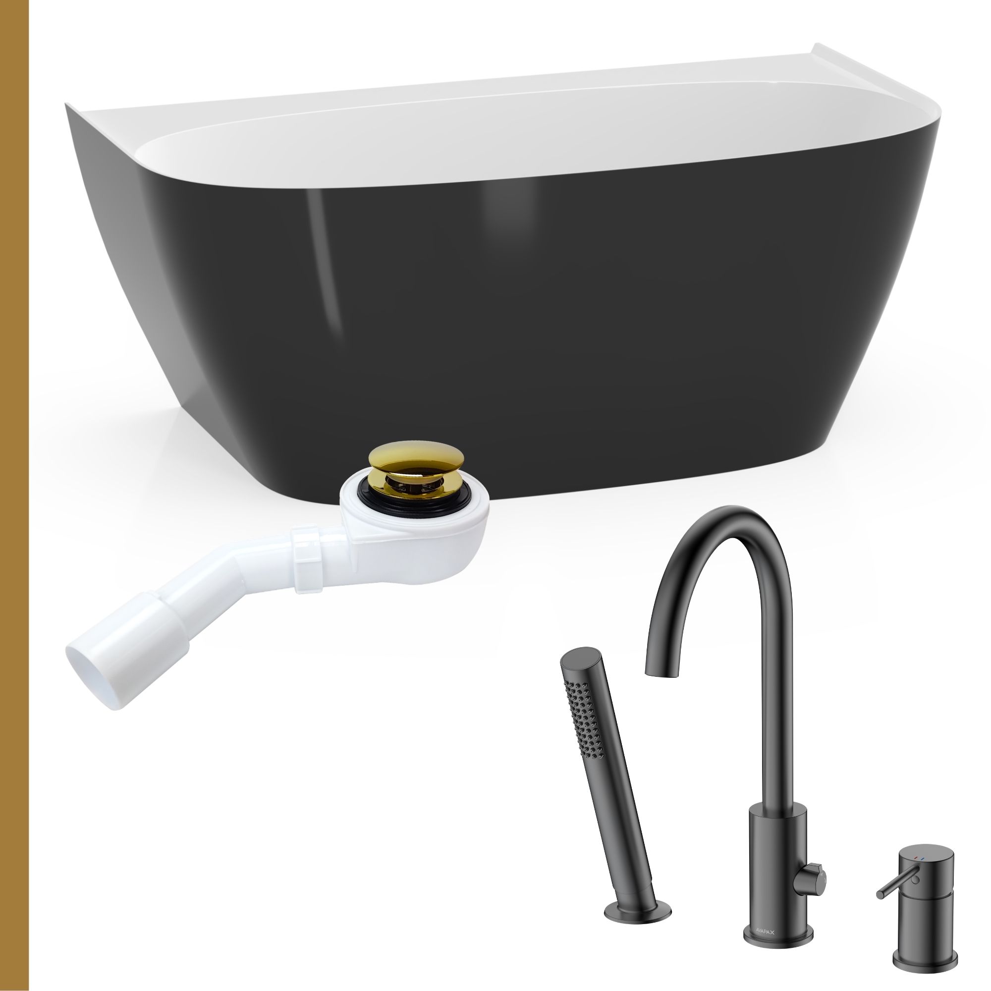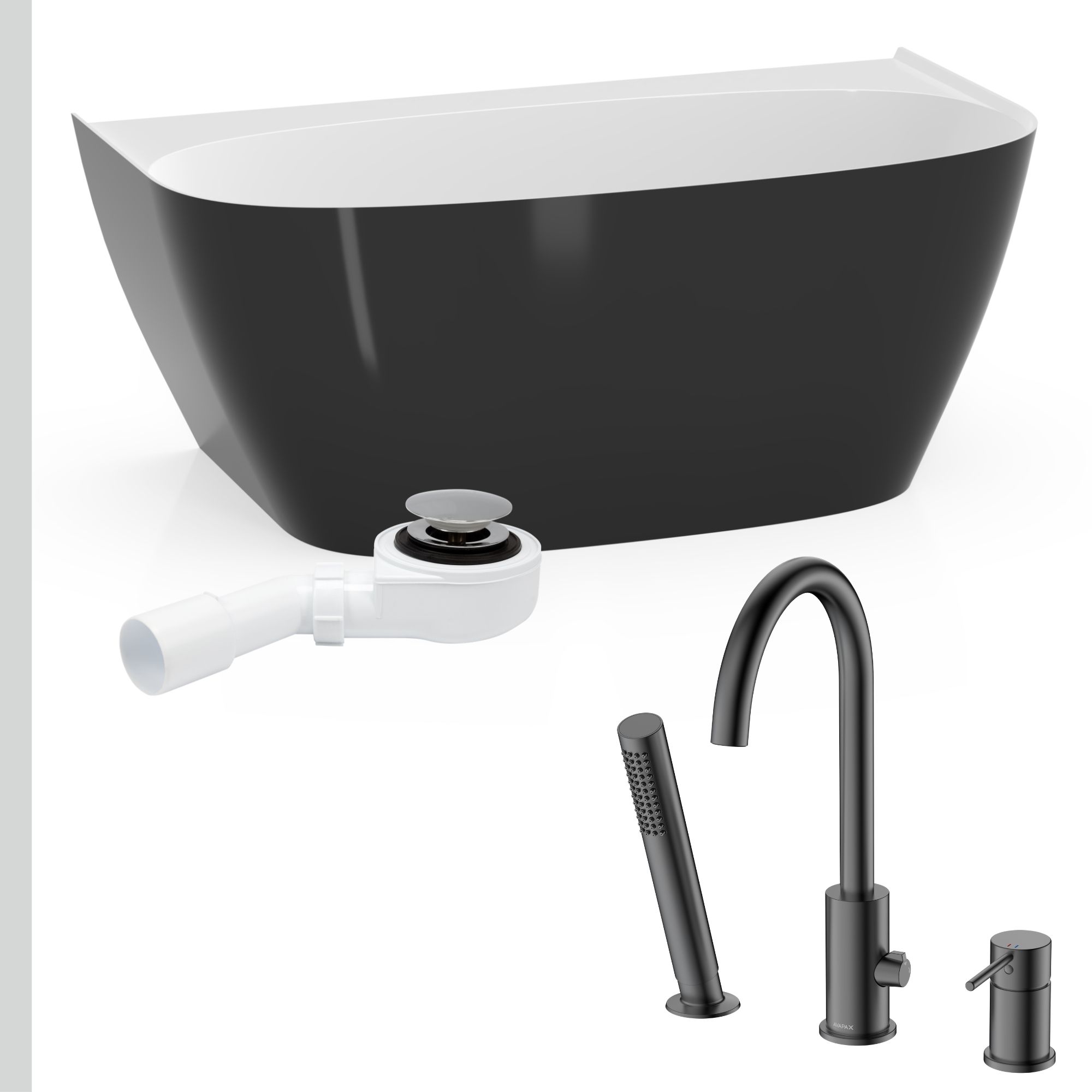 Łazienka kontrastu: Wanna Ela 150 czarno-biała + syfon + bateria wannowa 3-otworowa Ultimate