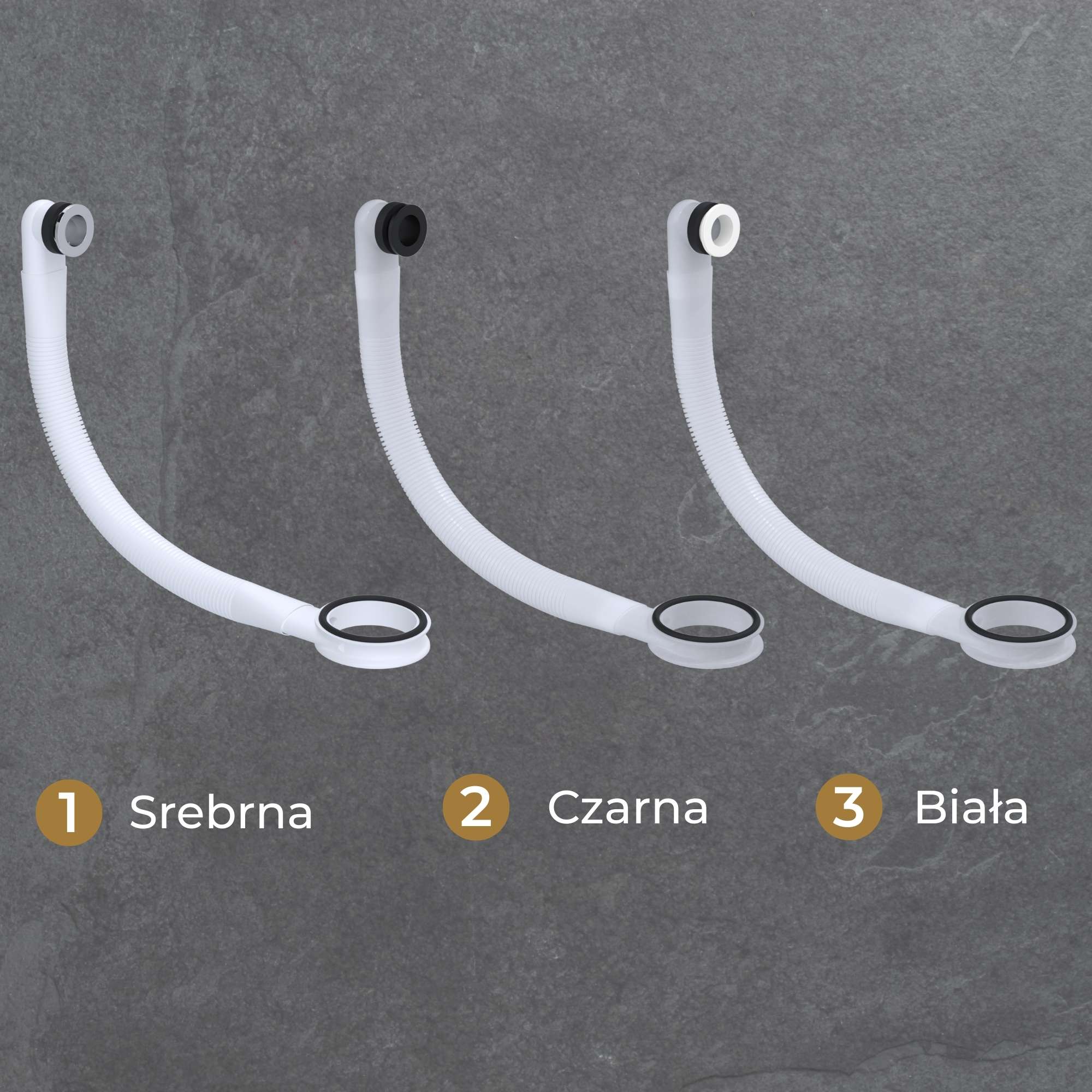 Dostępne są korki klik-klak w czterech kolorach: złotym, srebrnym, białym oraz czarnym macie. Każdy z nich wykonany jest z wysokiej jakości materiałów, zapewniając trwałość i estetykę. Dodatkowo, do umywalki można dobrać jedną z trzech przelewek: srebrna, biała lub czarna oraz jeden z pięciu rodzajów syfonów: