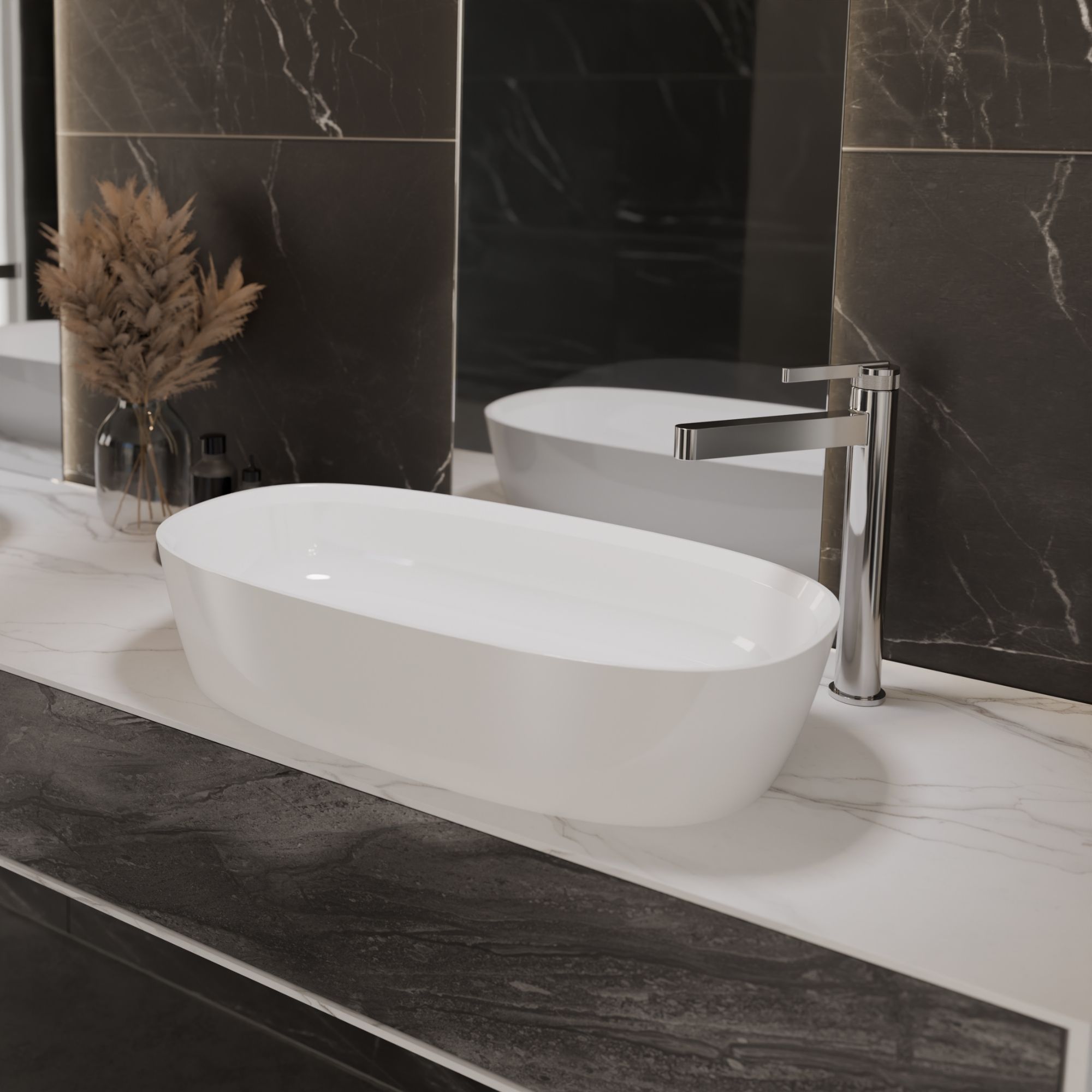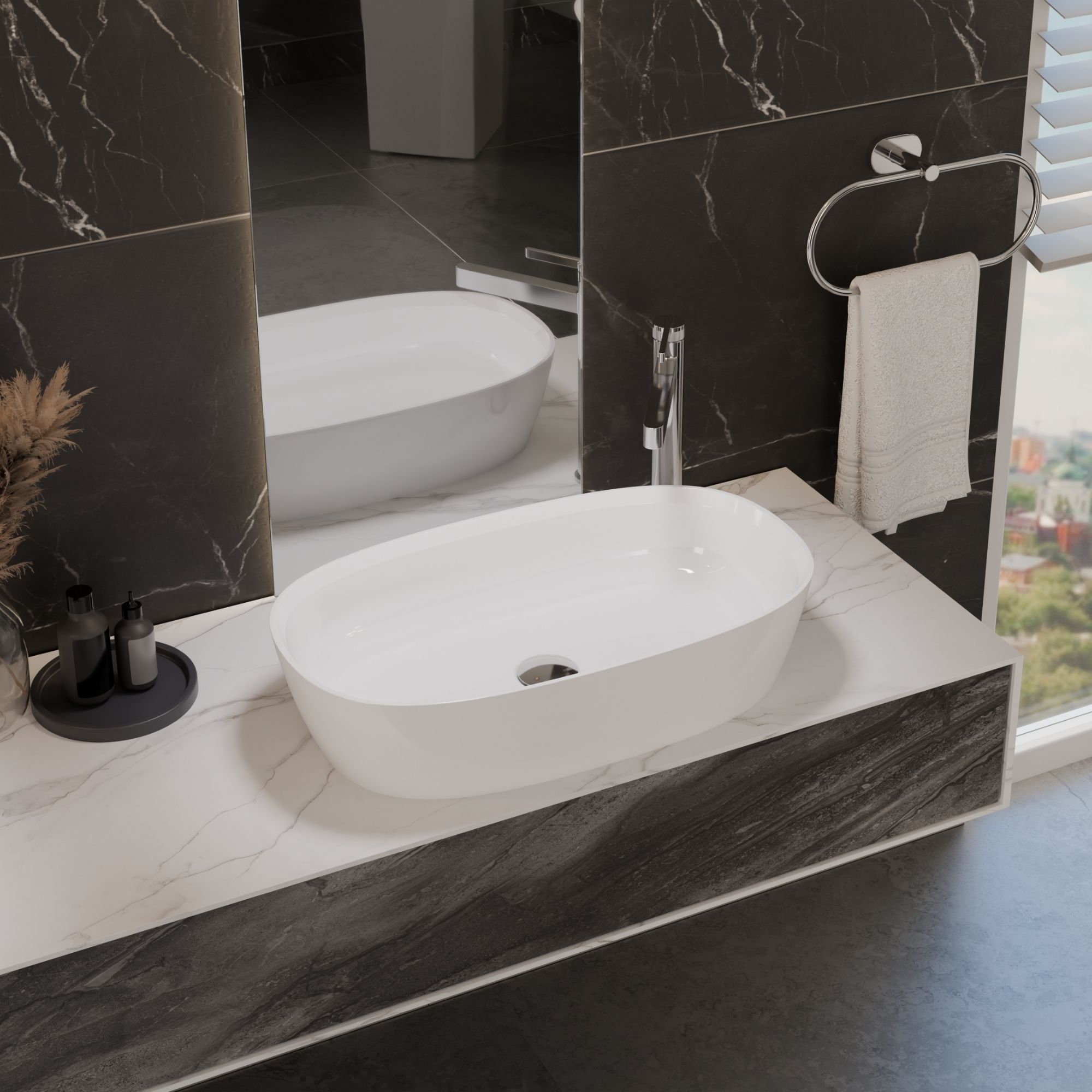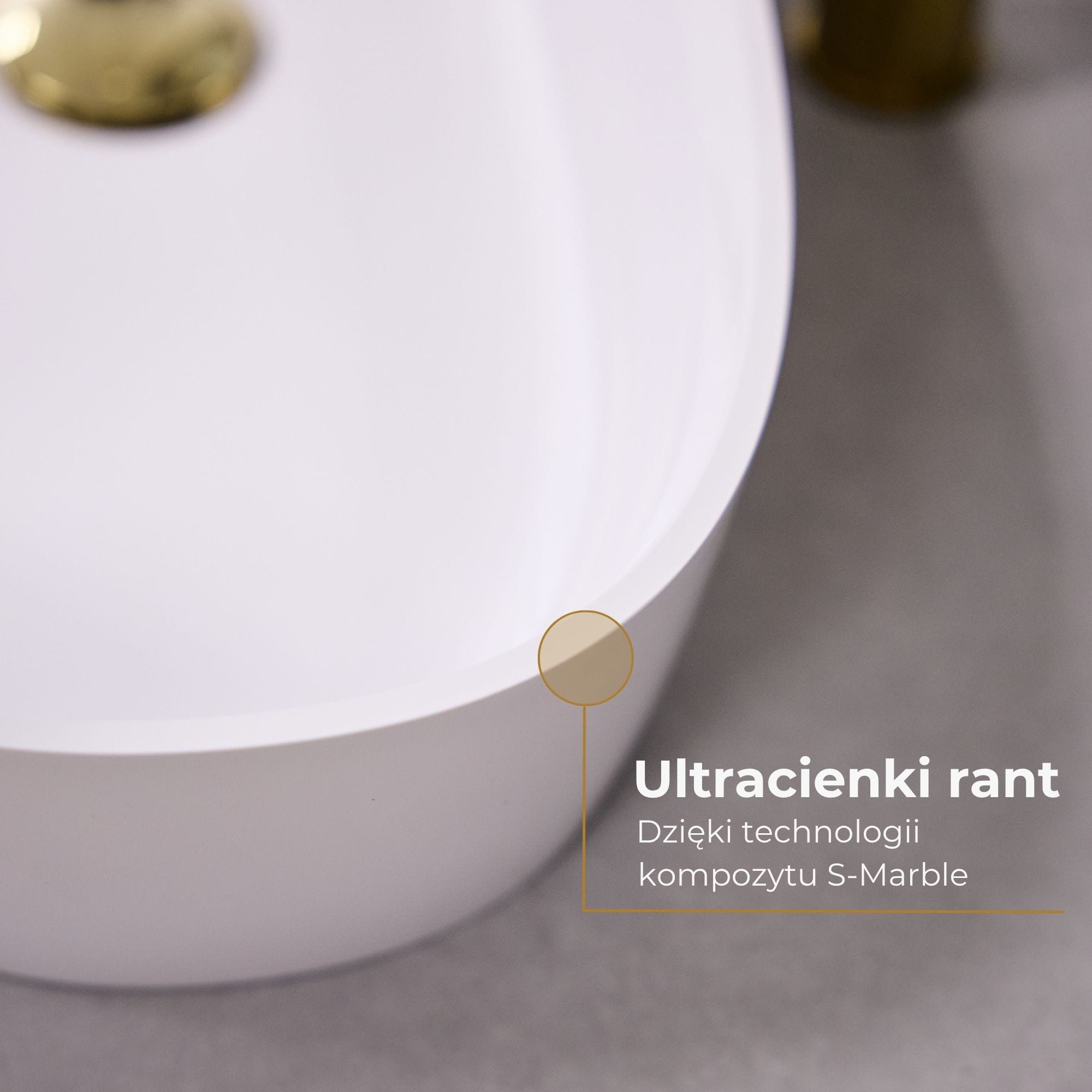 Mineralny odlew S-MARBLE to połączenie naturalnych minerałów i wysokiej jakości żywic, tworzące wyjątkowo trwały, gładki i elegancki materiał. Jest odporny na zarysowania, przebarwienia i wilgoć, doskonale utrzymuje temperaturę wody a jego aksamitna powierzchnia jest przyjemna w dotyku i łatwa w utrzymaniu. Dzięki swojej strukturze pozwala na formowanie cienkościennych, innowacyjnych kształtów, które podkreślają minimalistyczny charakter umywalki.