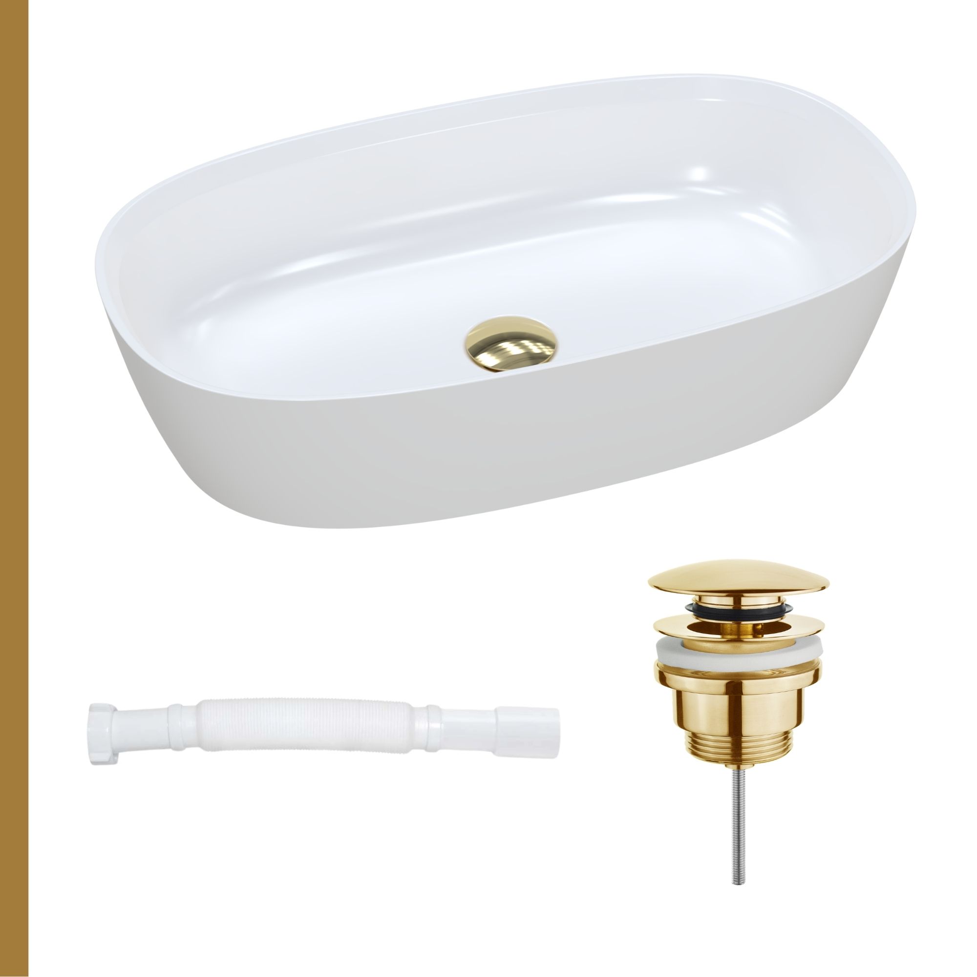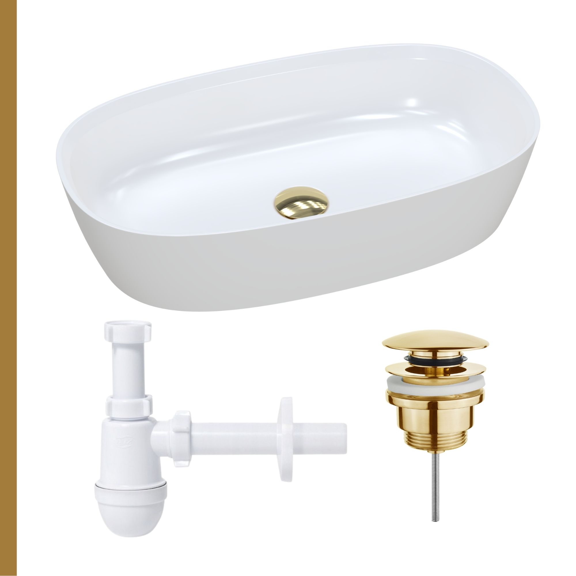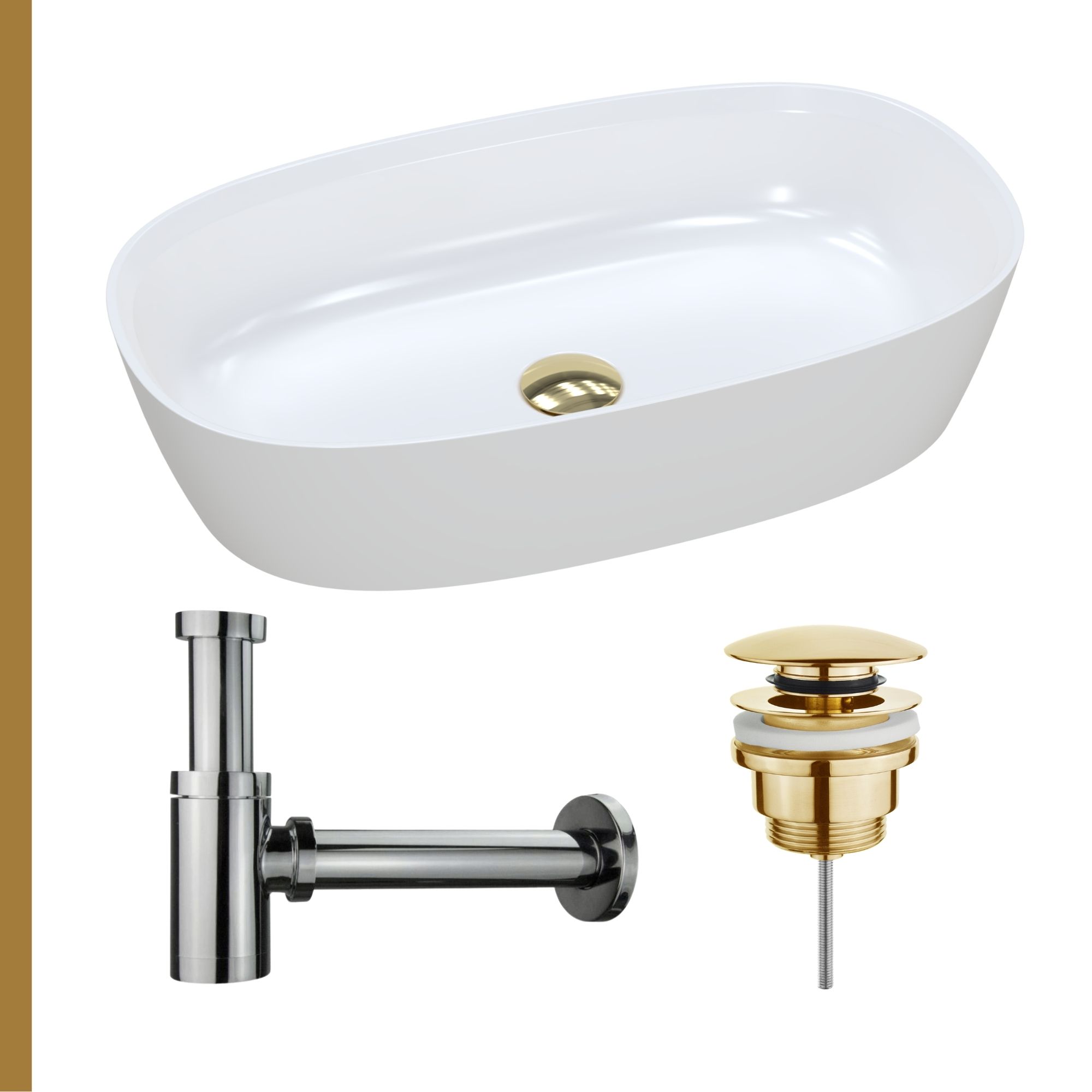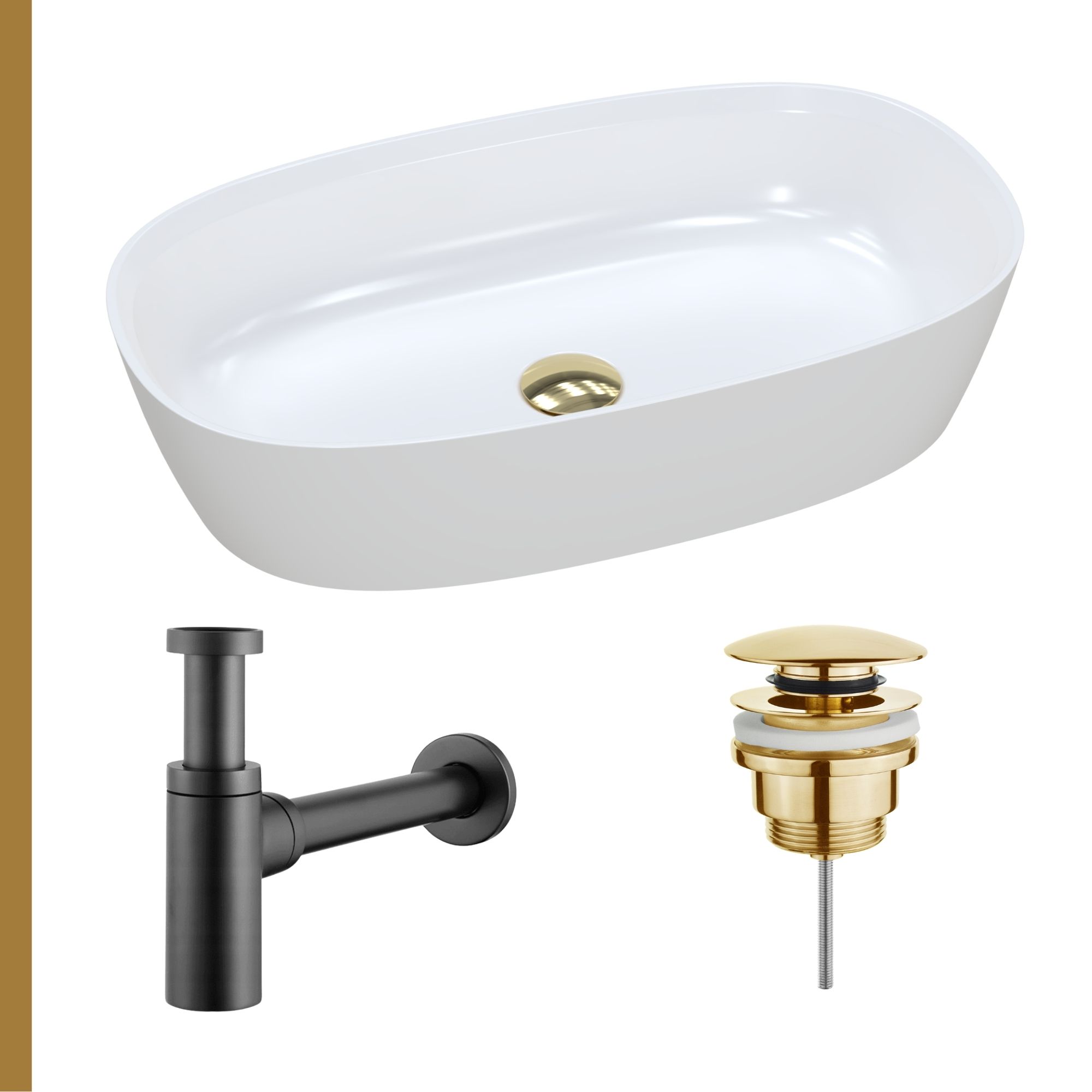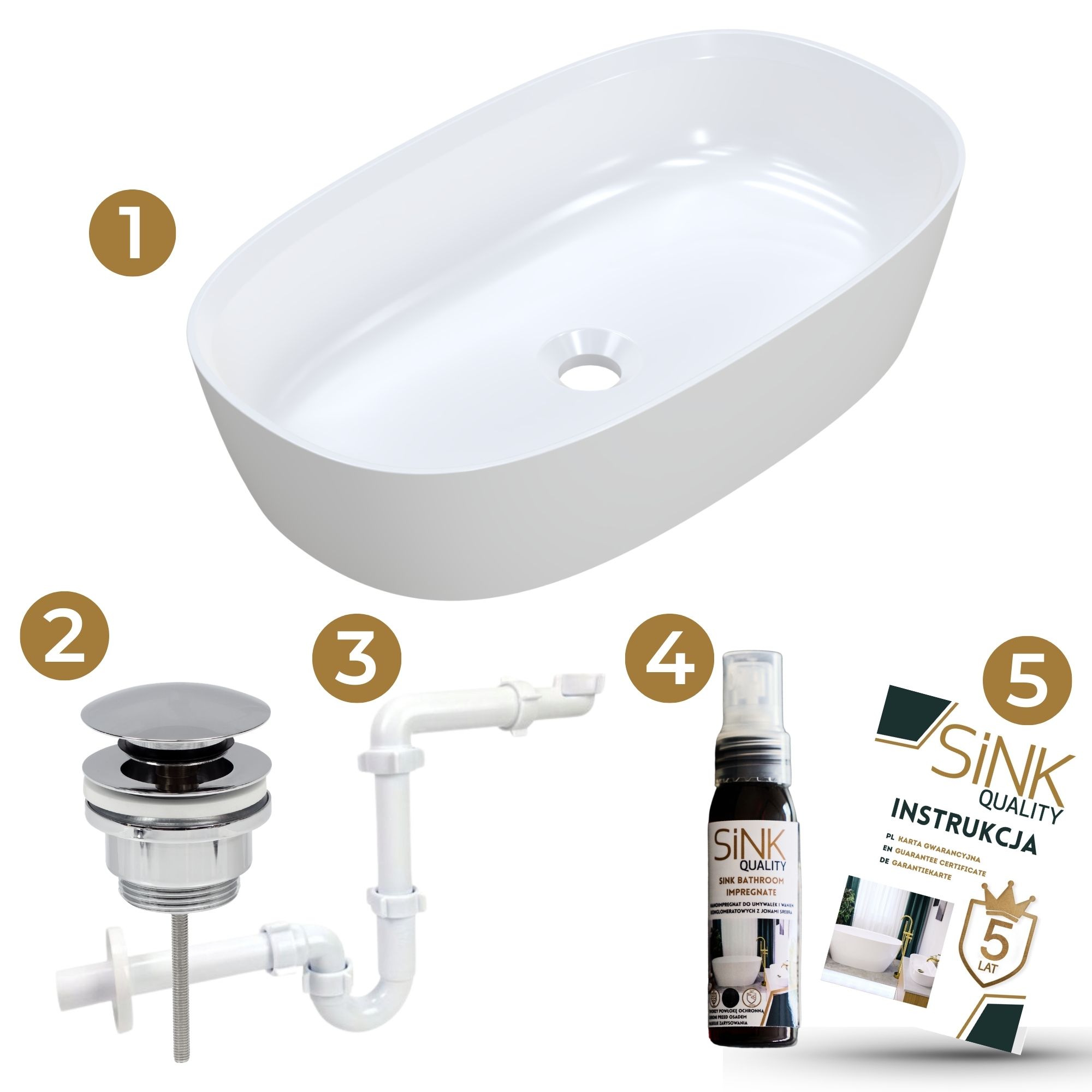 Dostępne są korki klik-klak w czterech eleganckich kolorach: złotym, srebrnym, białym oraz czarnym macie. Każdy z nich wykonany jest z wysokiej jakości materiałów, zapewniając trwałość i estetykę na lata. Dodatkowo, do umywalki można dobrać jeden z pięciu rodzajów syfonów: