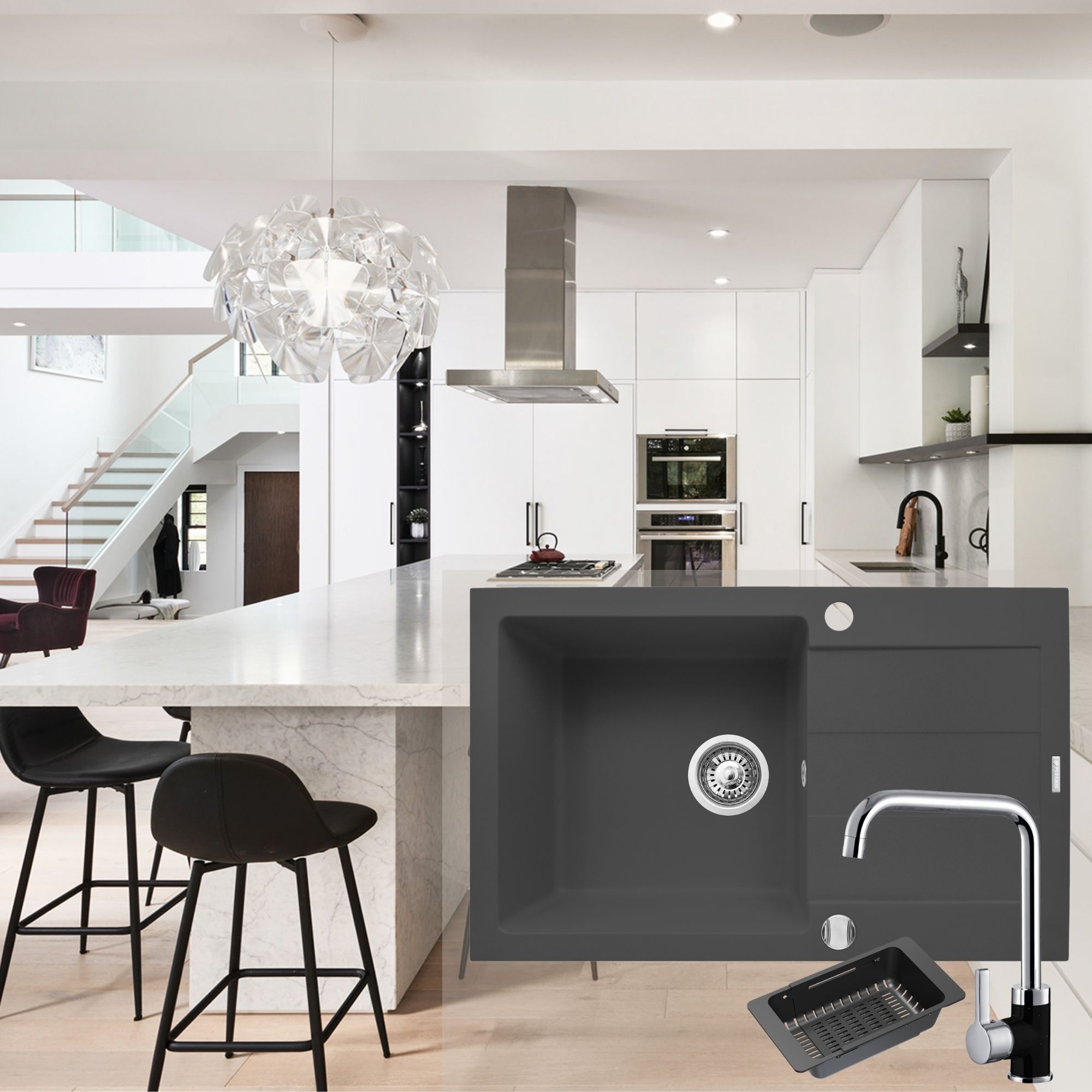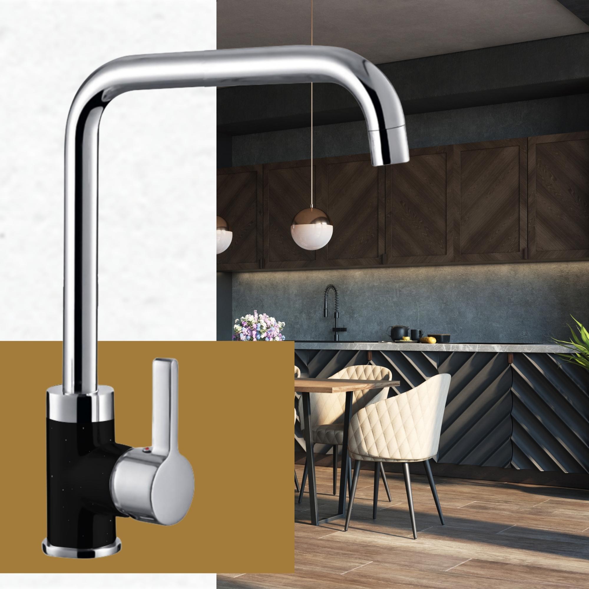Designerska wysoka bateria kuchenna w kolorze srebrnym idealnie pasuje kolorystycznie do zlewozmywaków granitowych. Mosiężny korpus połączony z granitowym dodatkiem, tworzy nowoczesne i trwałe rozwiązanie do stylowej kuchni.