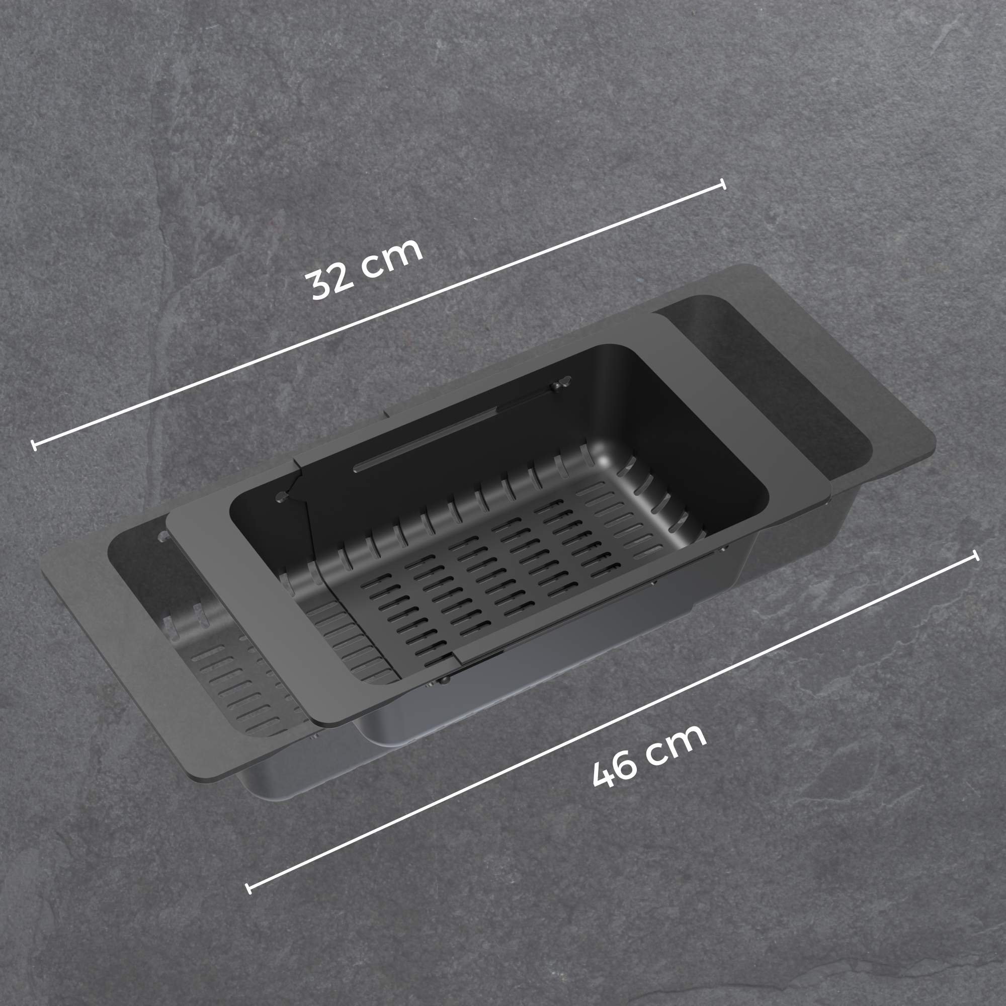Doskonale sprawdza się podczas płukania warzyw i owoców zapewniając wygodę i higienę użytkowania. Jej uniwersalny design pasuje do większości zlewozmywaków, czyniąc ją praktycznym dodatkiem do codziennych obowiązków. Wkładka posiada regulowaną szerokość od 32 do 46 cm.
