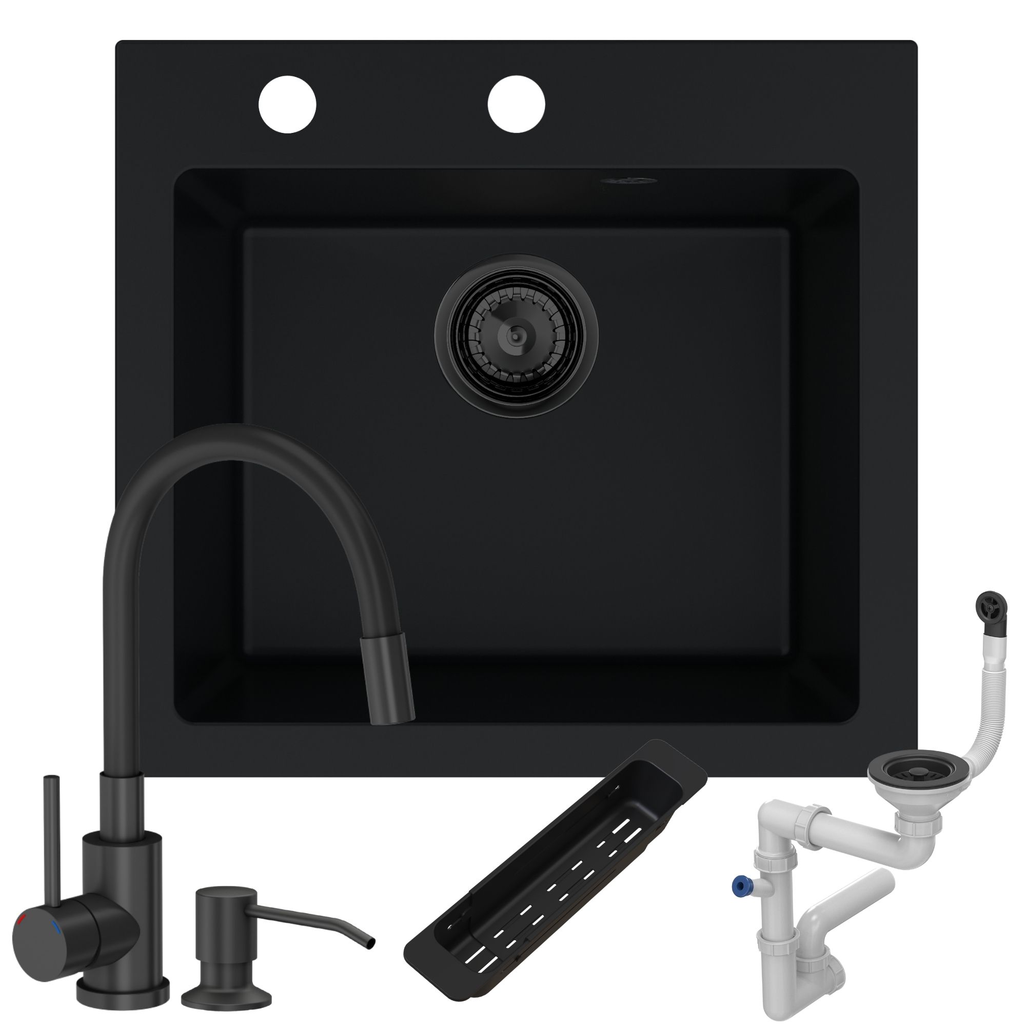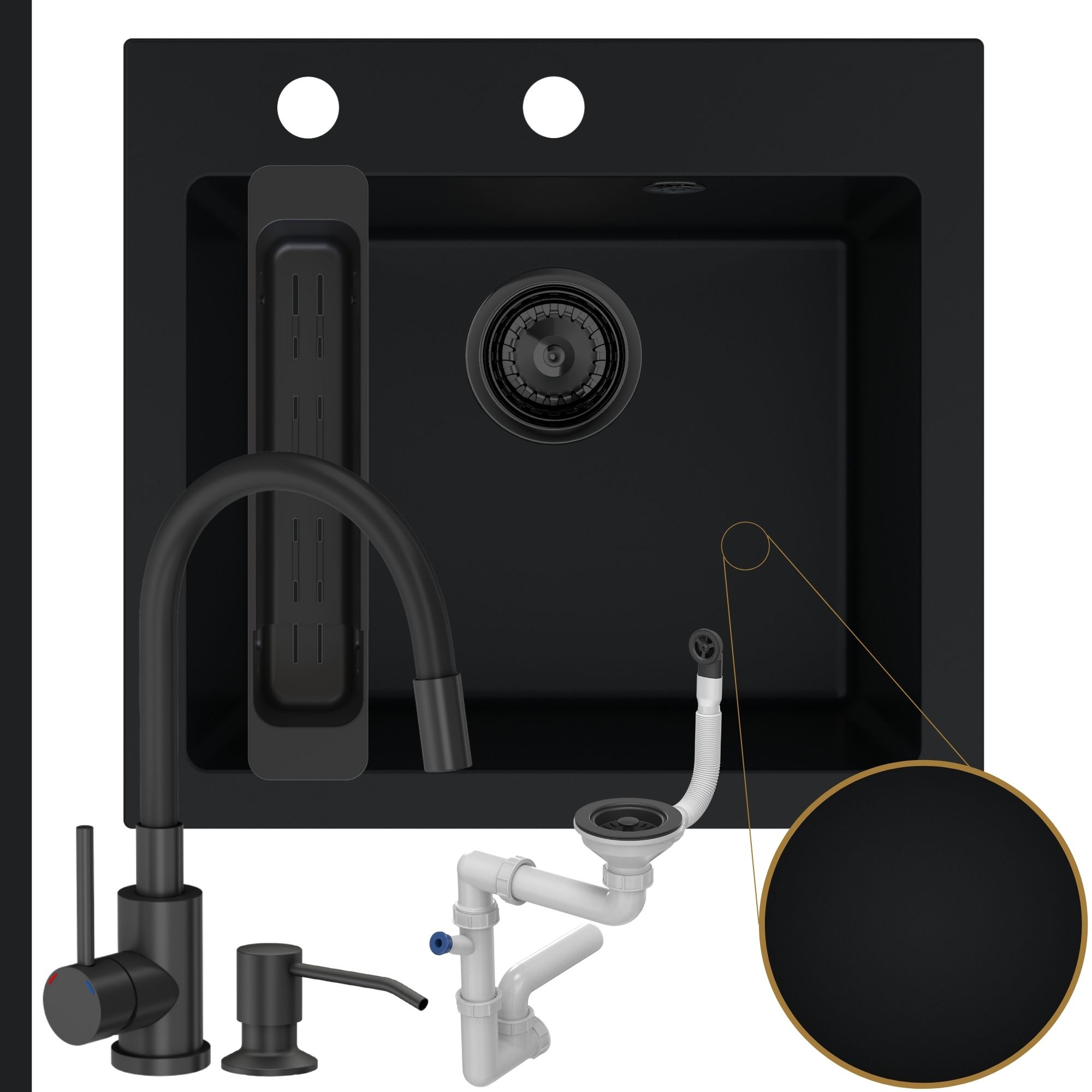 - Przyścienny syfon manualny, w kolorze czarnym. Wykonujemy otwory o standardowej średnicy 35 mm. Ilość otworów w zlewie dopasowana jest do wybranego syfonu.