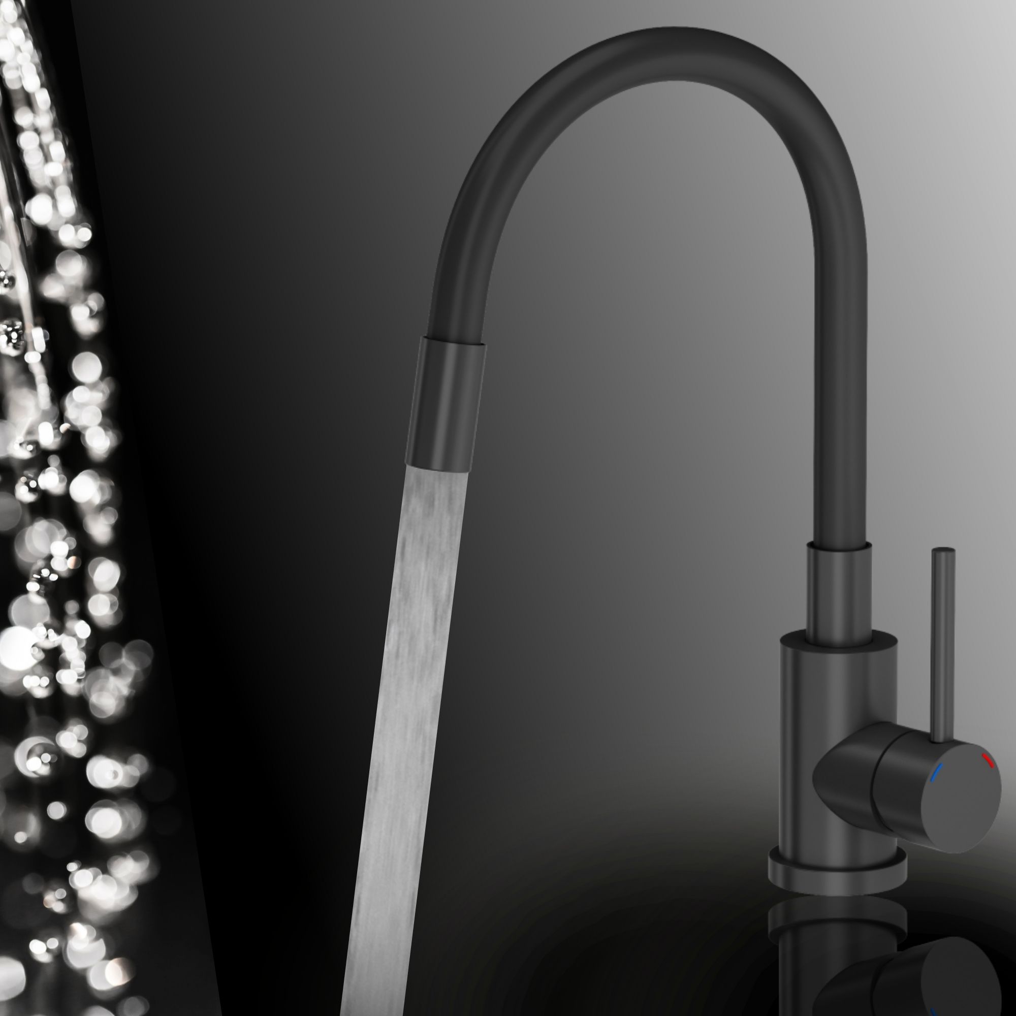 Designerska wysoka bateria kuchenna elastyczna w kolorze czarnym idealnie pasuje kolorystycznie do zlewozmywaków granitowych. Korpus wykonany ze stali szlachetnej połączony z satynowo gładką czarną silikonową wylewką, tworzy nowoczesne i trwałe rozwiązanie do stylowej kuchni.