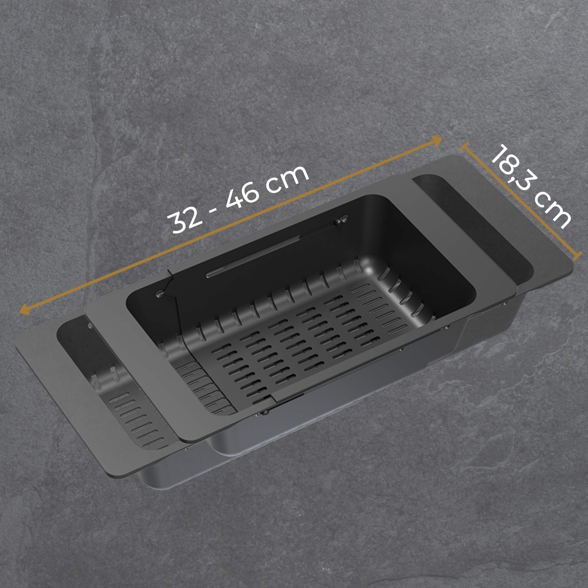Doskonale sprawdza się podczas płukania warzyw i owoców zapewniając wygodę i higienę użytkowania. Jej uniwersalny design pasuje do większości zlewozmywaków, czyniąc ją praktycznym dodatkiem do codziennych obowiązków. Wkładka posiada regulowaną szerokość od 32 do 46 cm.