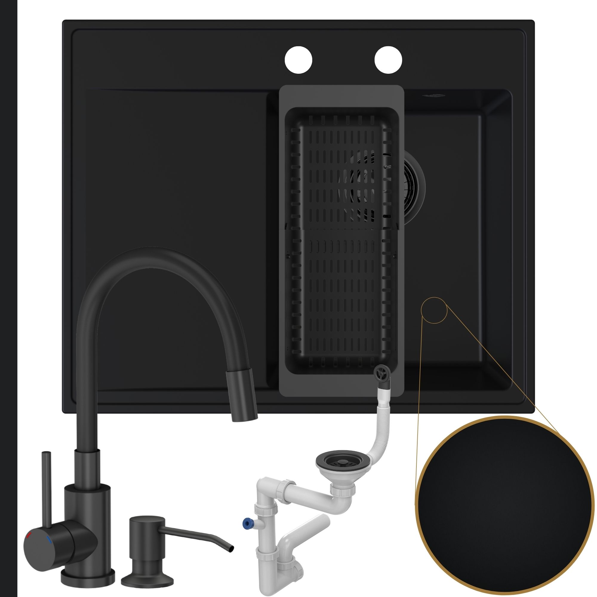 - Przyścienny syfon manualny, w kolorze czarnym. Wykonujemy otwory o standardowej średnicy 35 mm. Ilość otworów w zlewie dopasowana jest do wybranego syfonu.