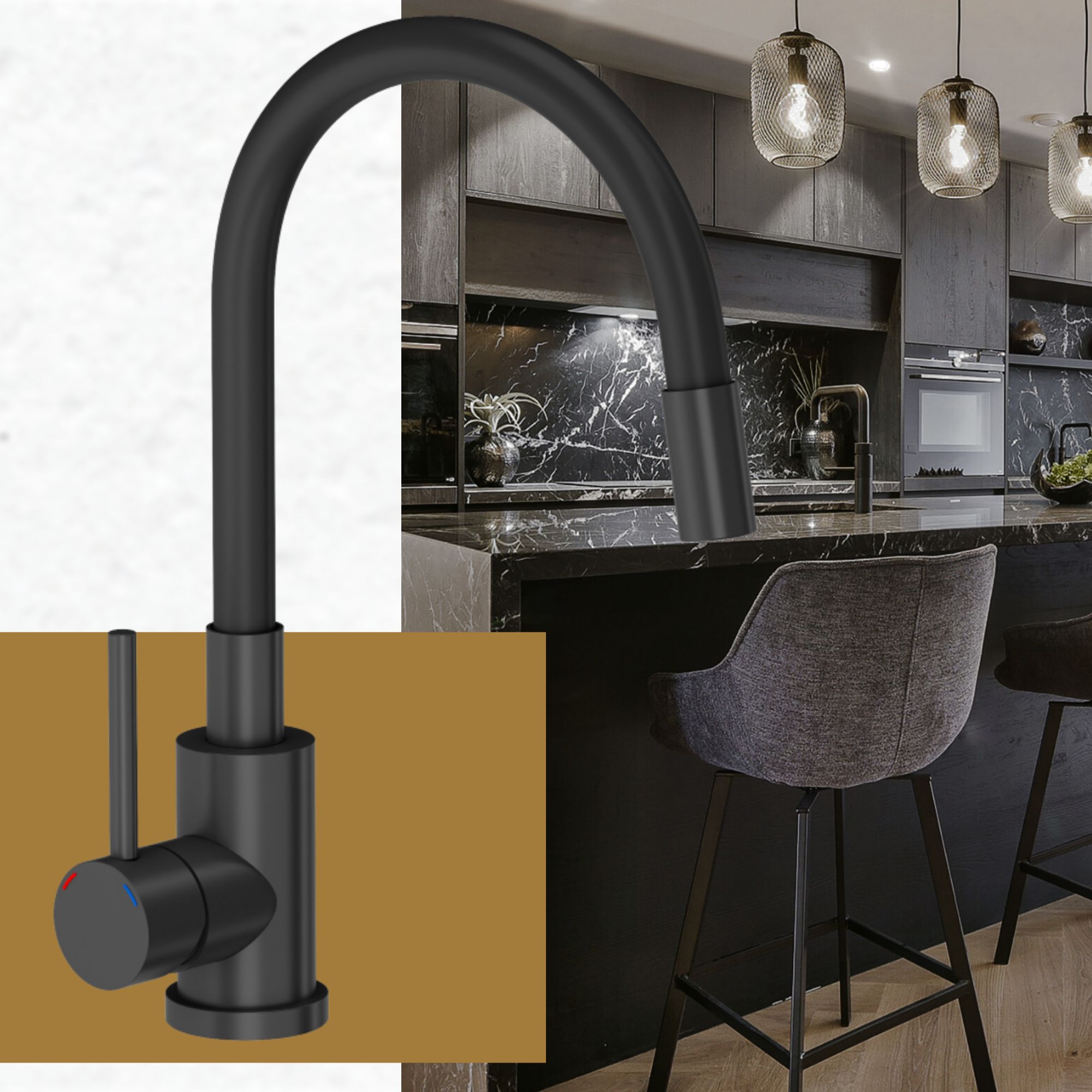 Designerska wysoka bateria kuchenna elastyczna w kolorze czarnym idealnie pasuje kolorystycznie do zlewozmywaków granitowych. Korpus wykonany ze stali szlachetnej połączony z satynowo gładką czarną silikonową wylewką, tworzy nowoczesne i trwałe rozwiązanie do stylowej kuchni.