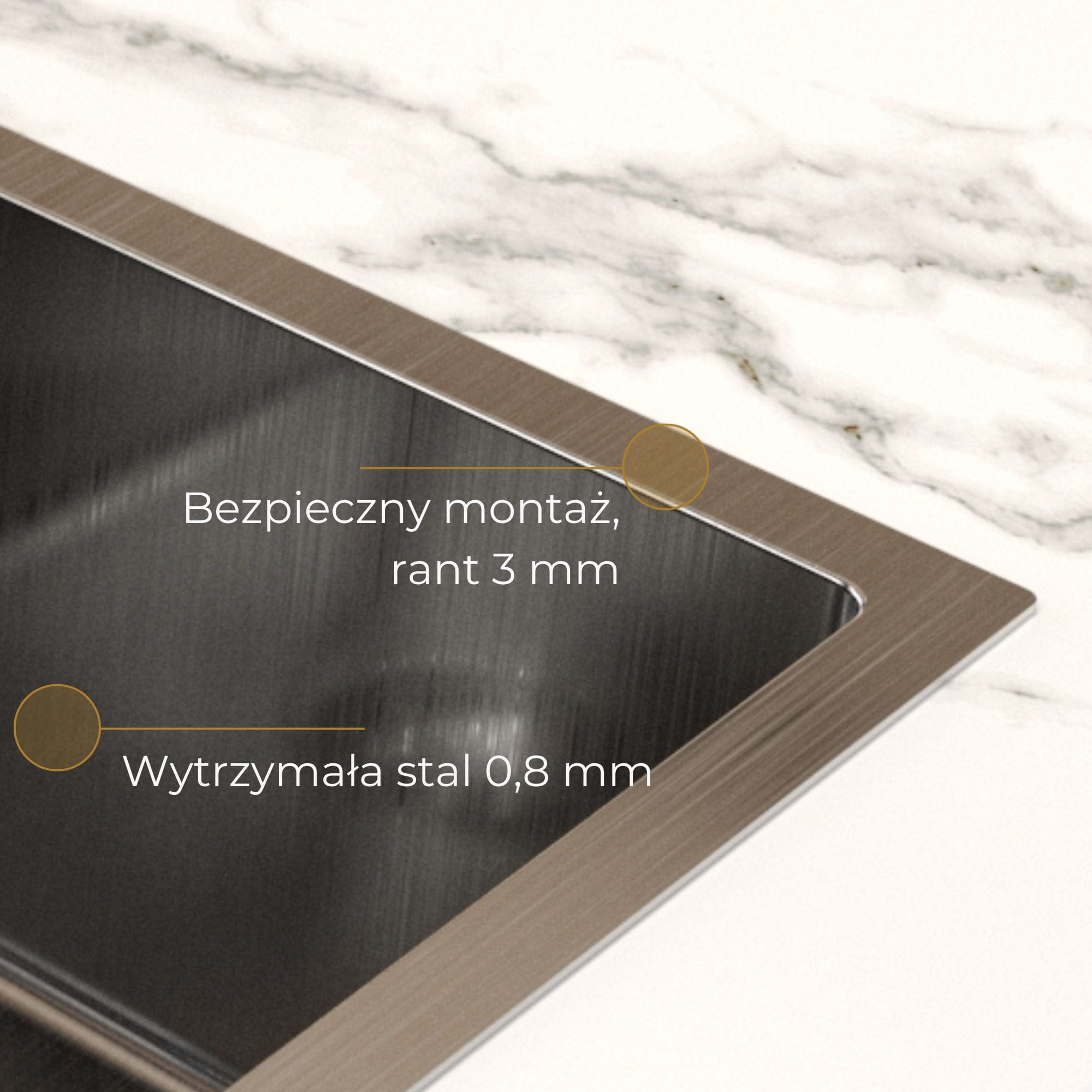 Odporny na uszkodzenia, nawet przy codziennym, intensywnym użytkowaniu. Stal komory (o grubości 0,8 mm) chroni przed wgnieceniami. Wzmocniony rant, o grubości 3 mm zapewnia bezpieczny montaż i nieodkształcanie się zlewu.