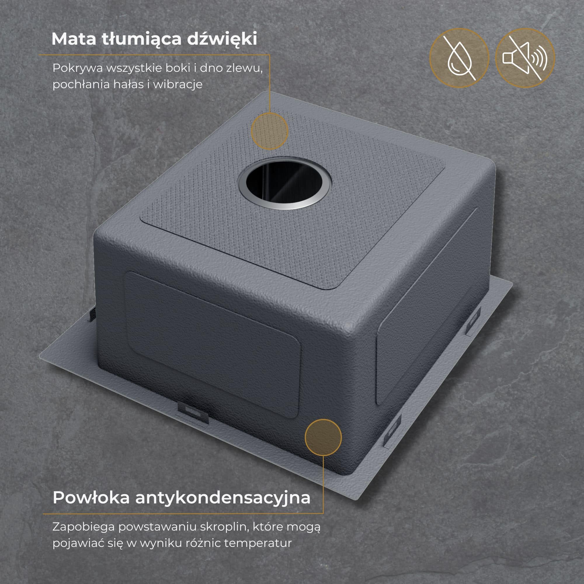 - Powłoka antykondensacyjna, która sprawia, że zlew jest suchy z zewnątrz, woda nie skrapla się, a szafki są chronione przed wilgocią