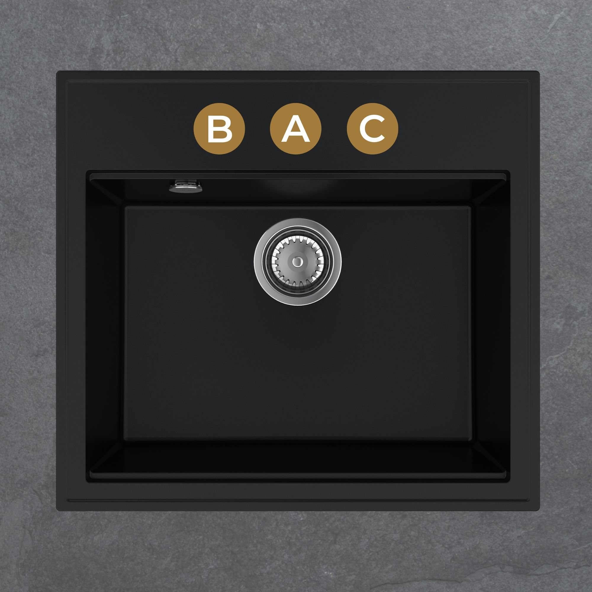 - 3 otwory (A, B lub C) dla syfonu automatycznego, przeznaczone na baterię, pokrętło/przycisk syfonu i dozownik.