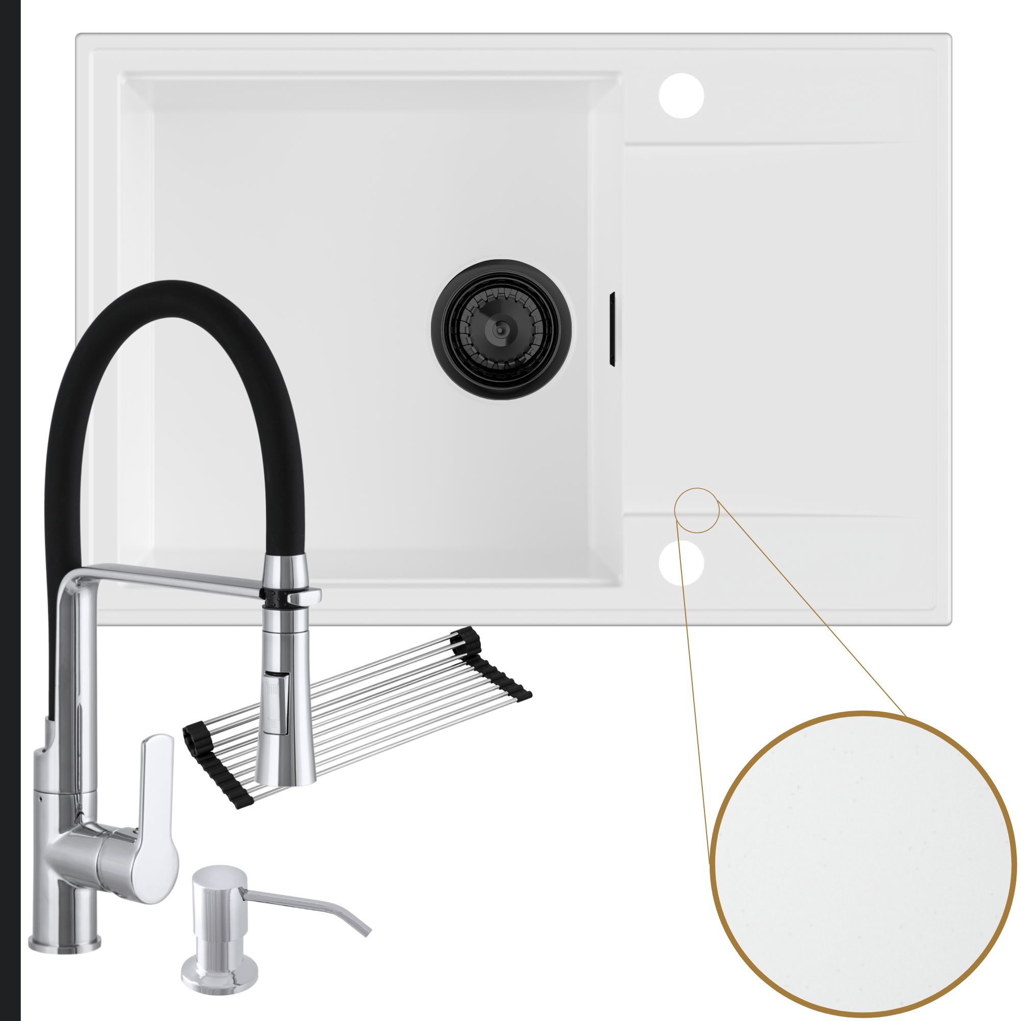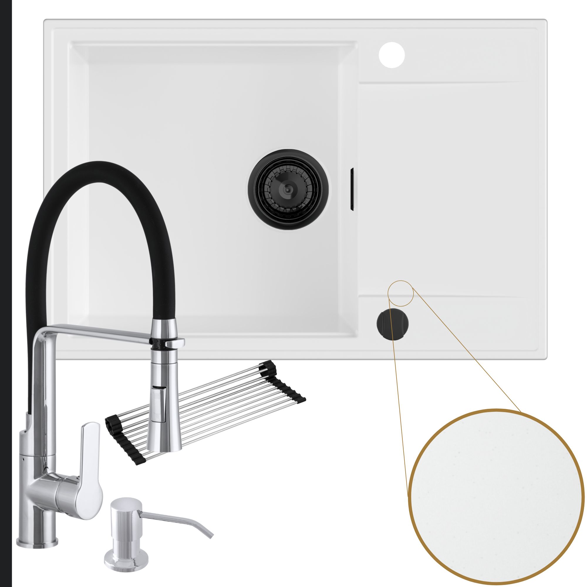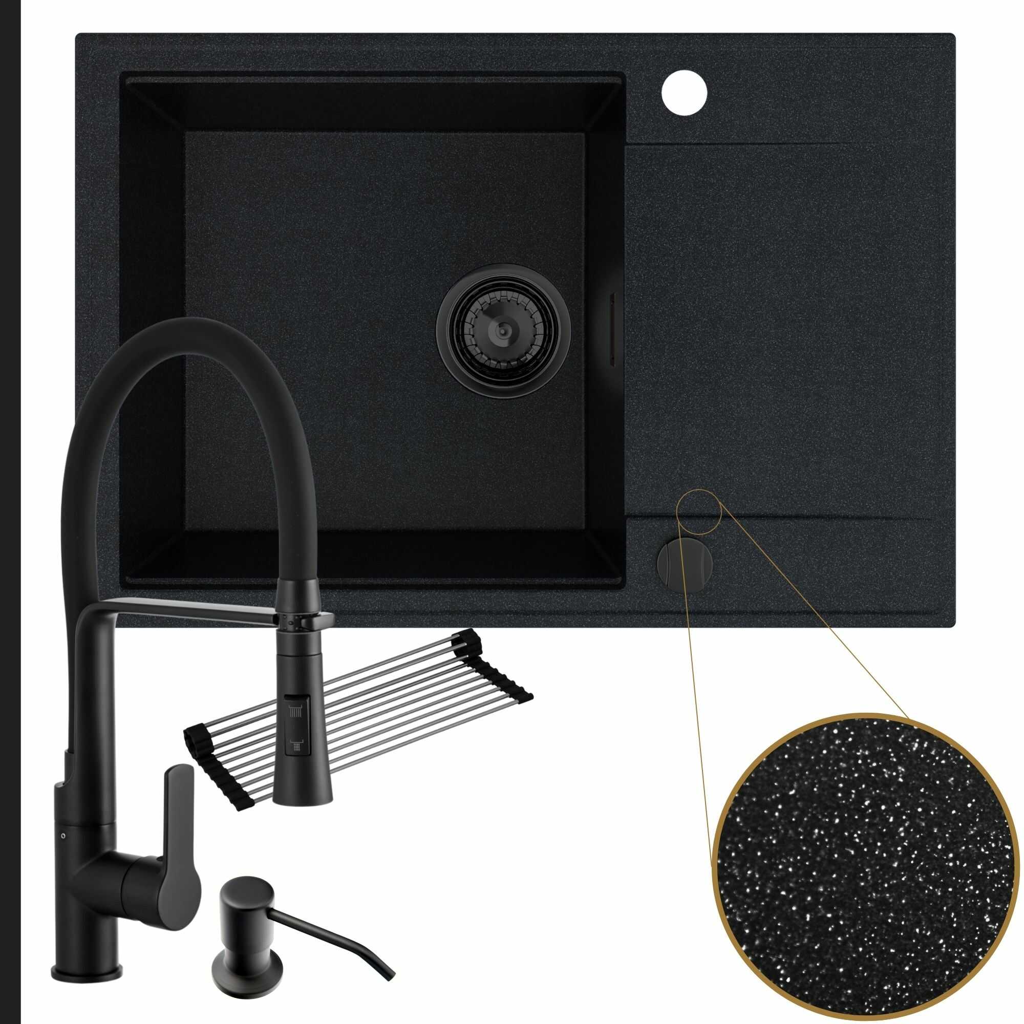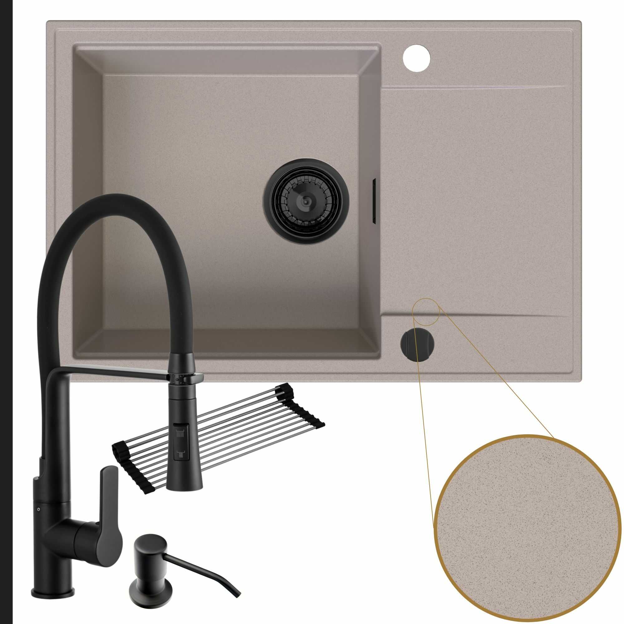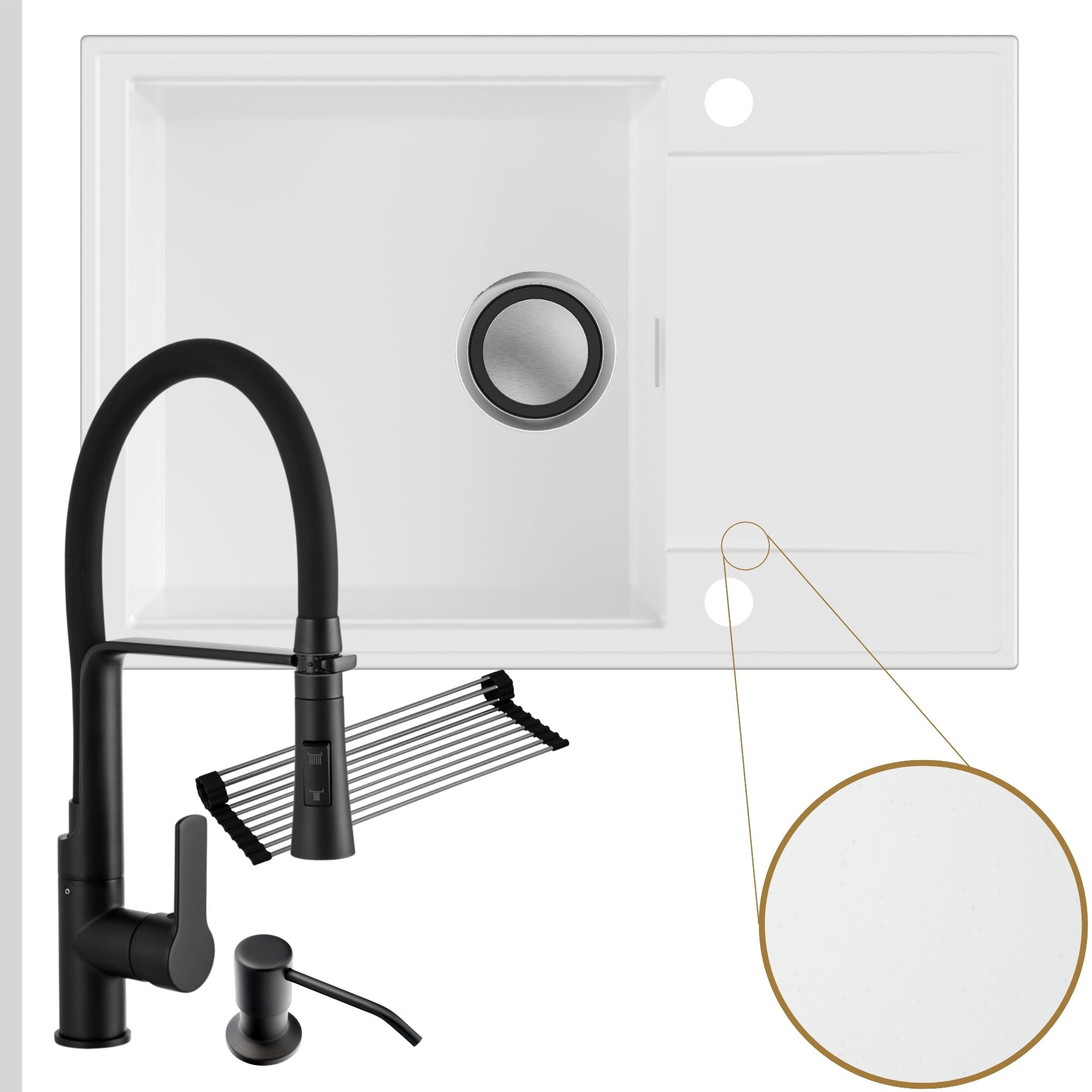 Przestronna kuchnia: zlew + bateria + dozownik + syfon + mata