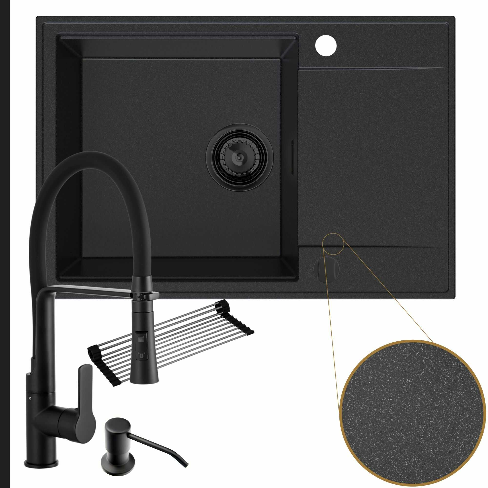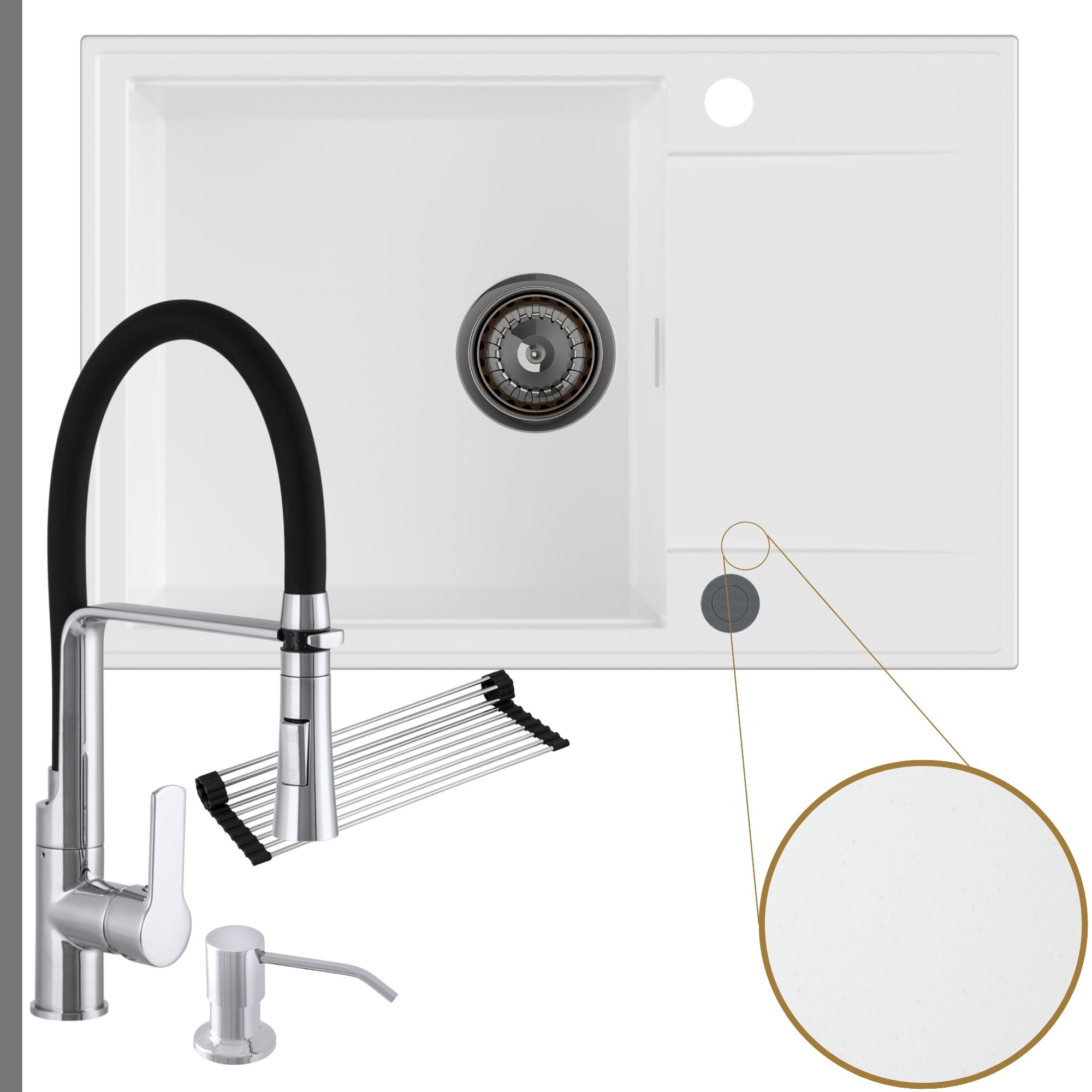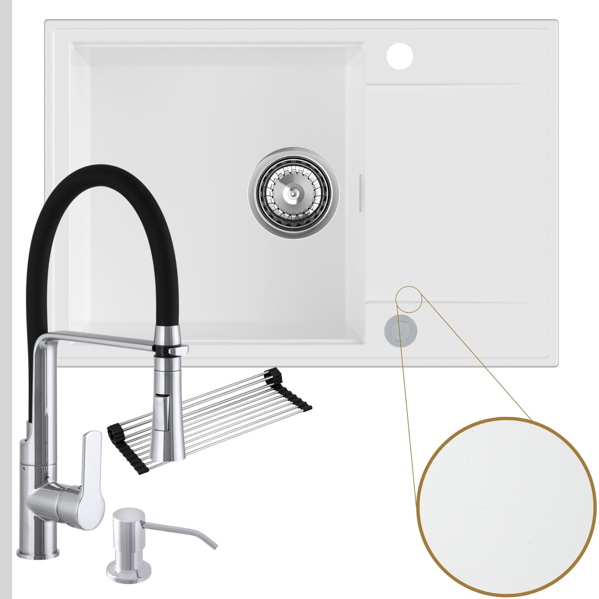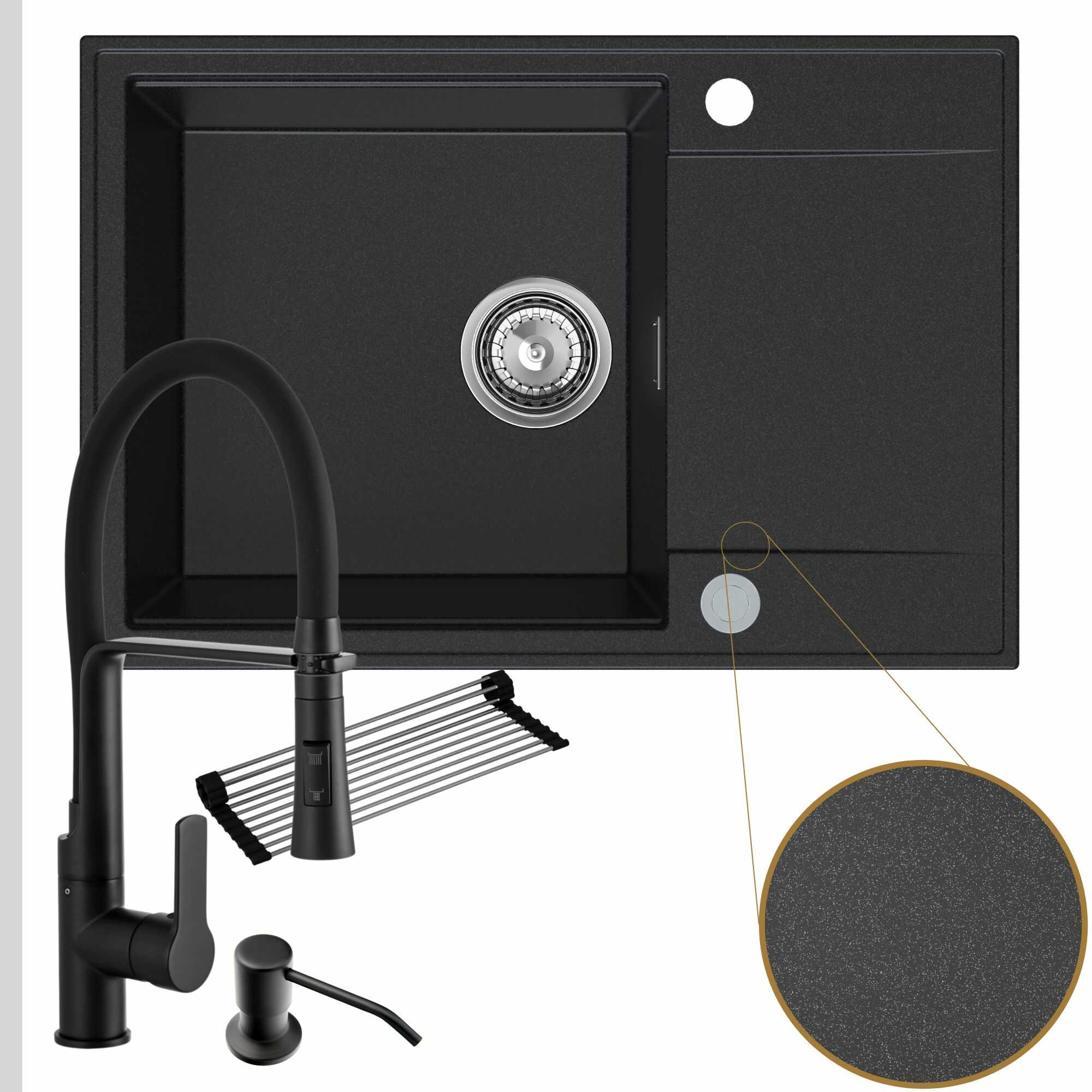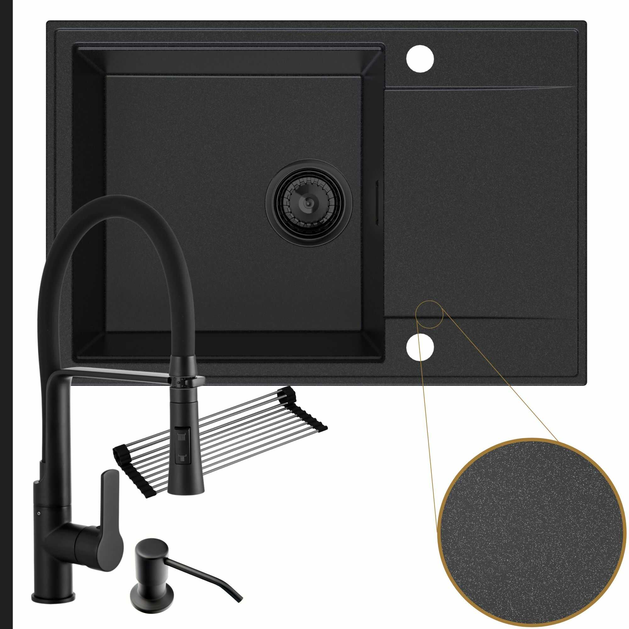 Przestronna kuchnia: zlew + bateria + dozownik + syfon + mata