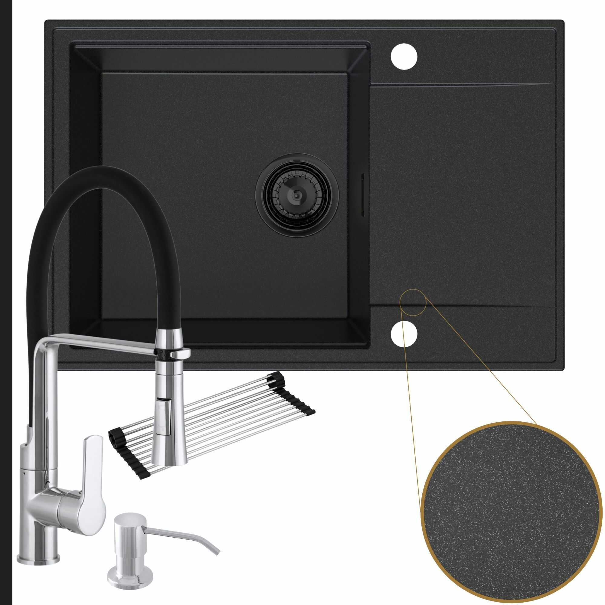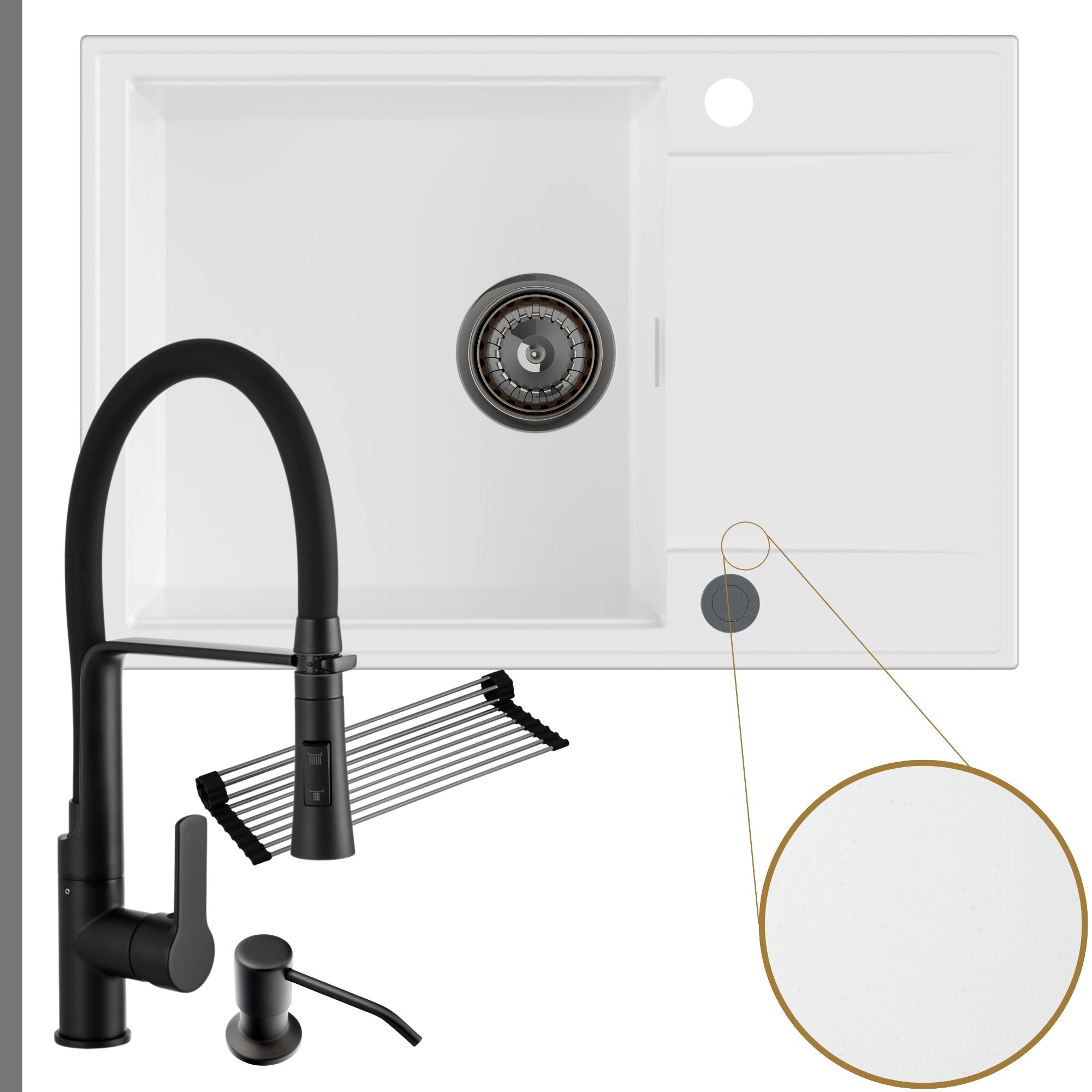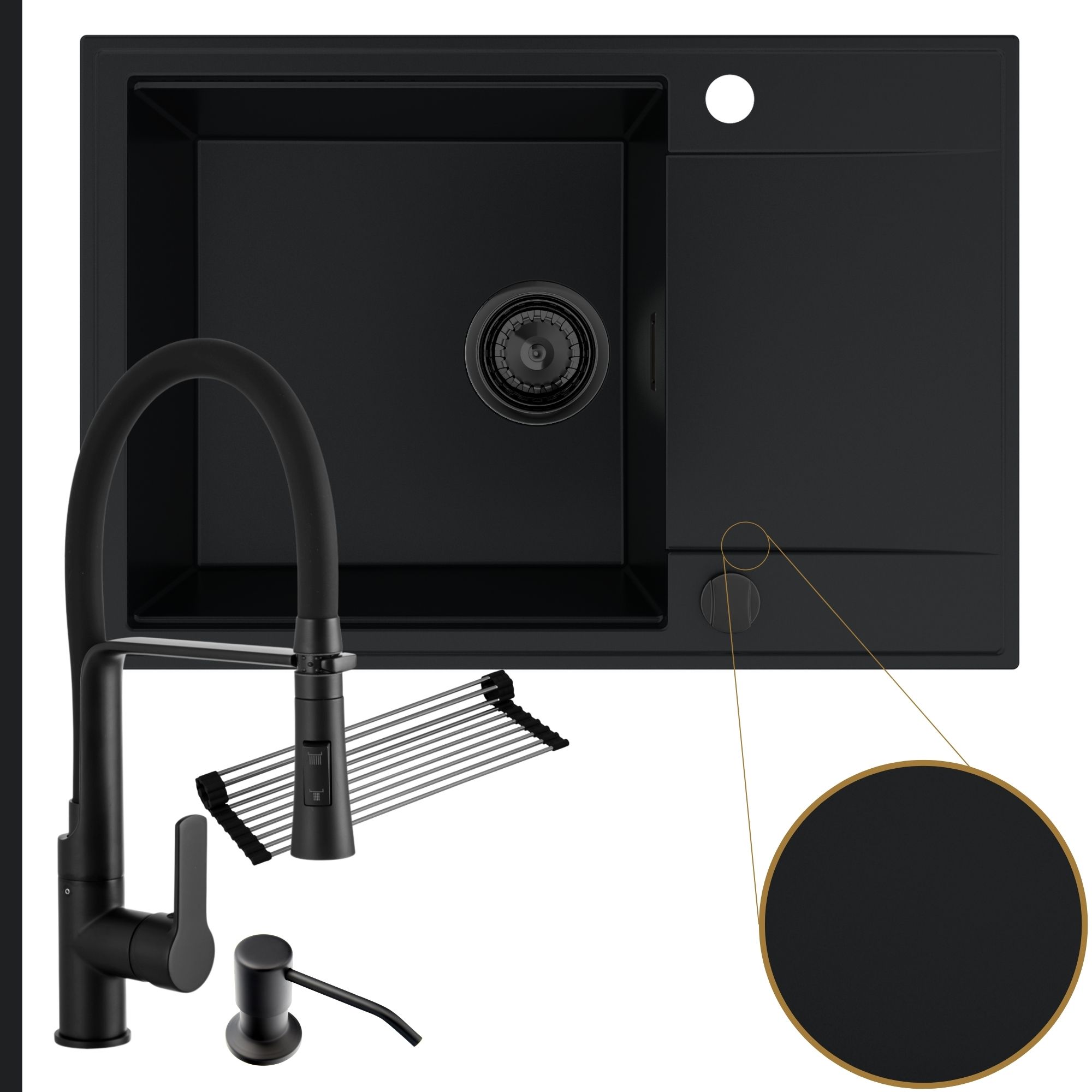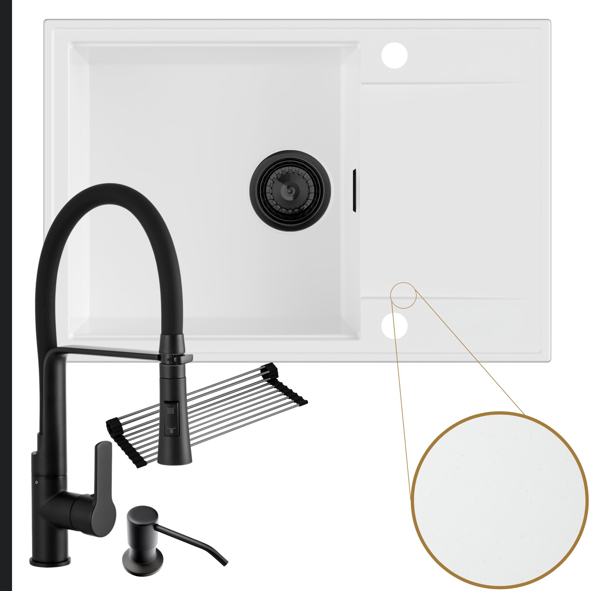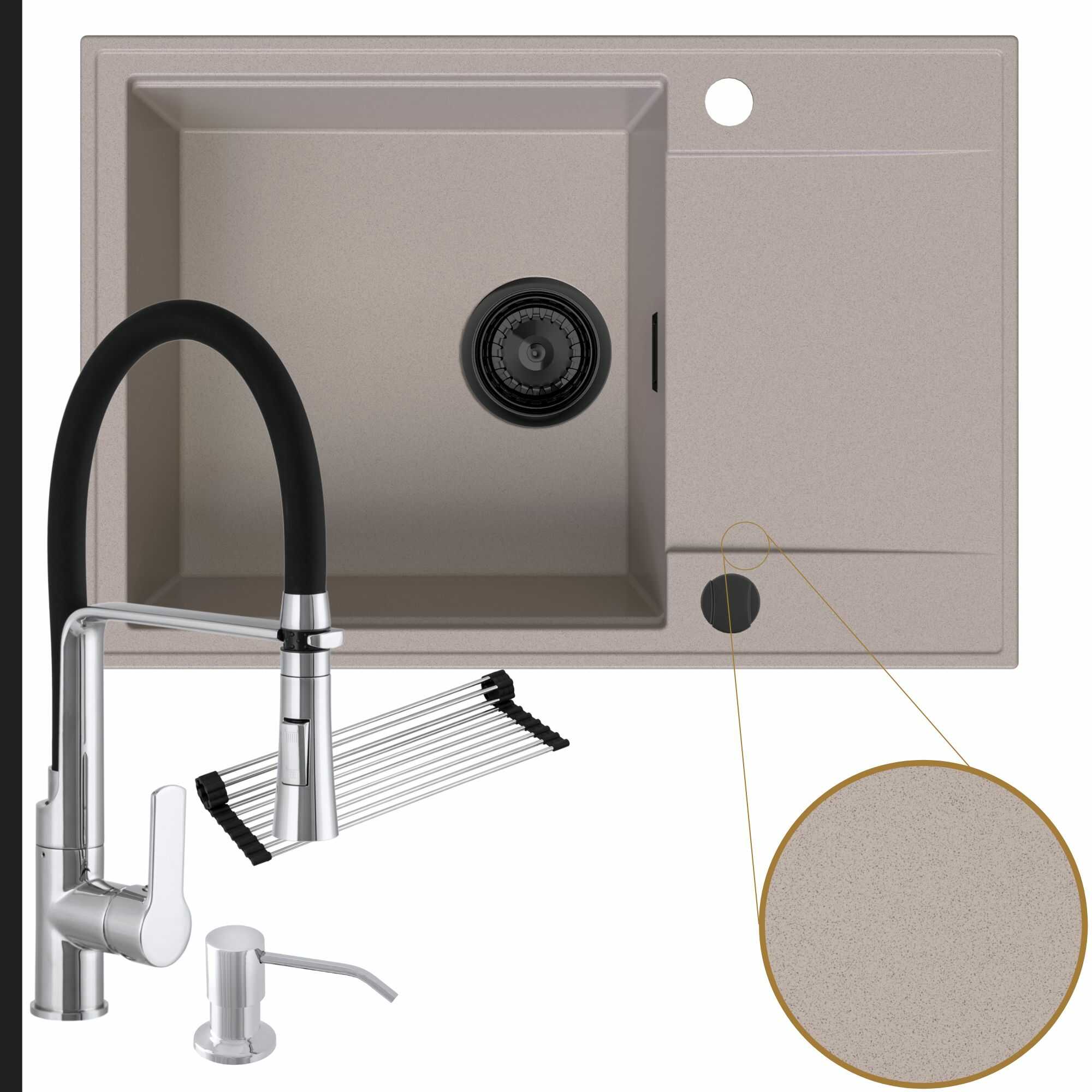 Przestronna kuchnia: zlew + bateria + dozownik + syfon + mata