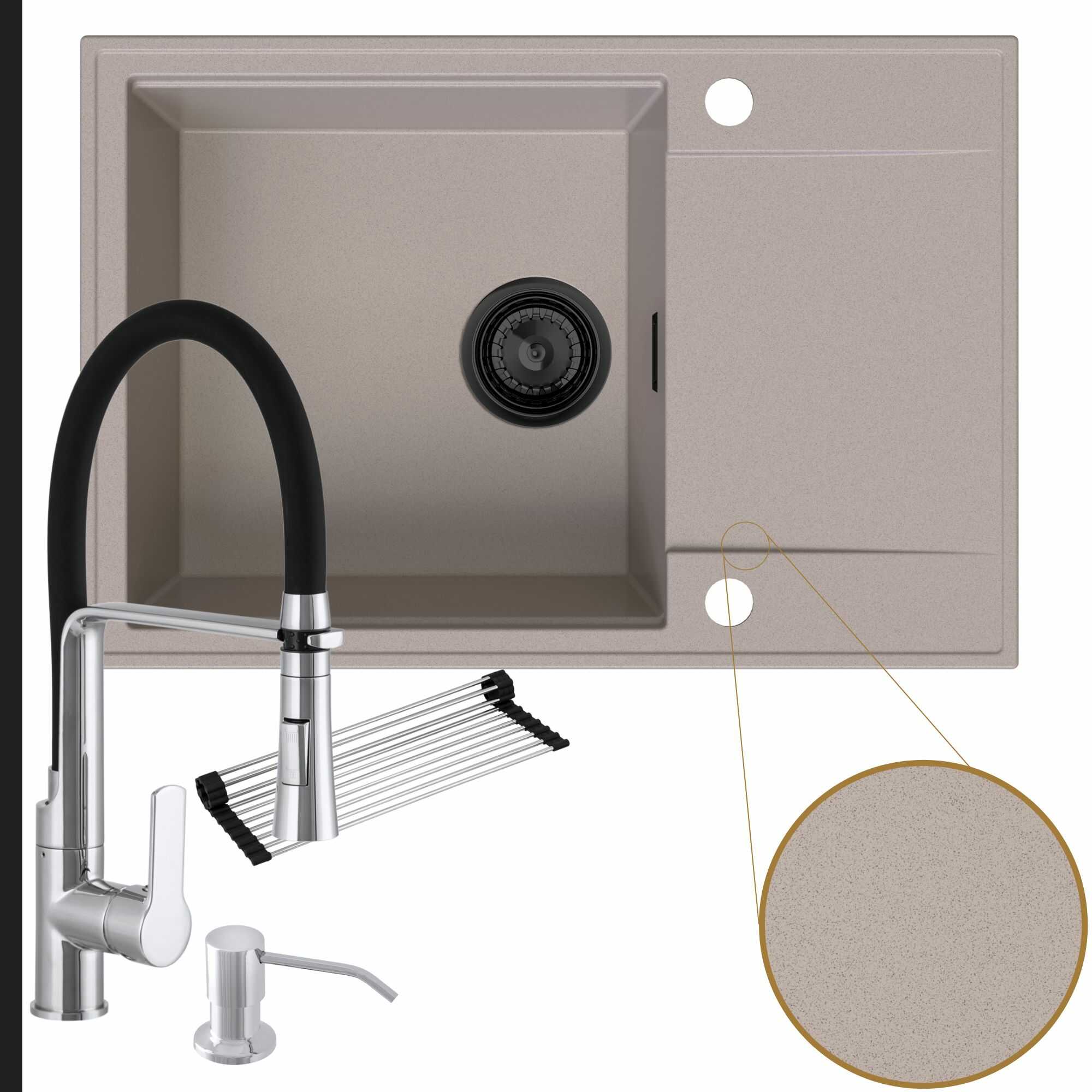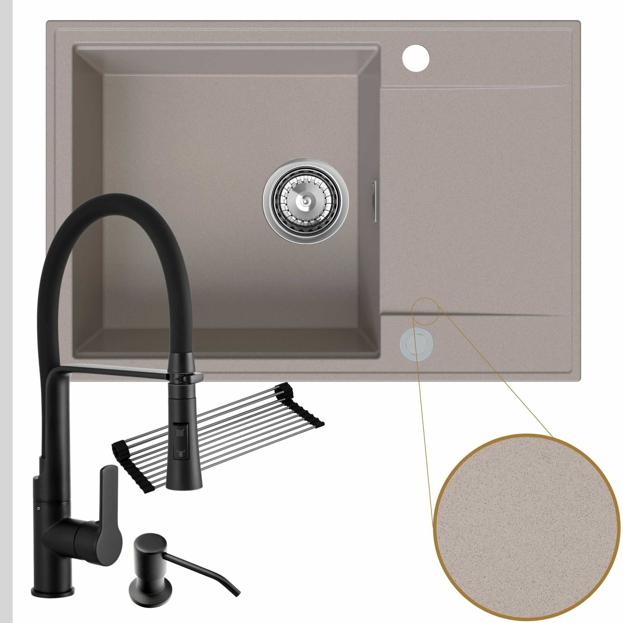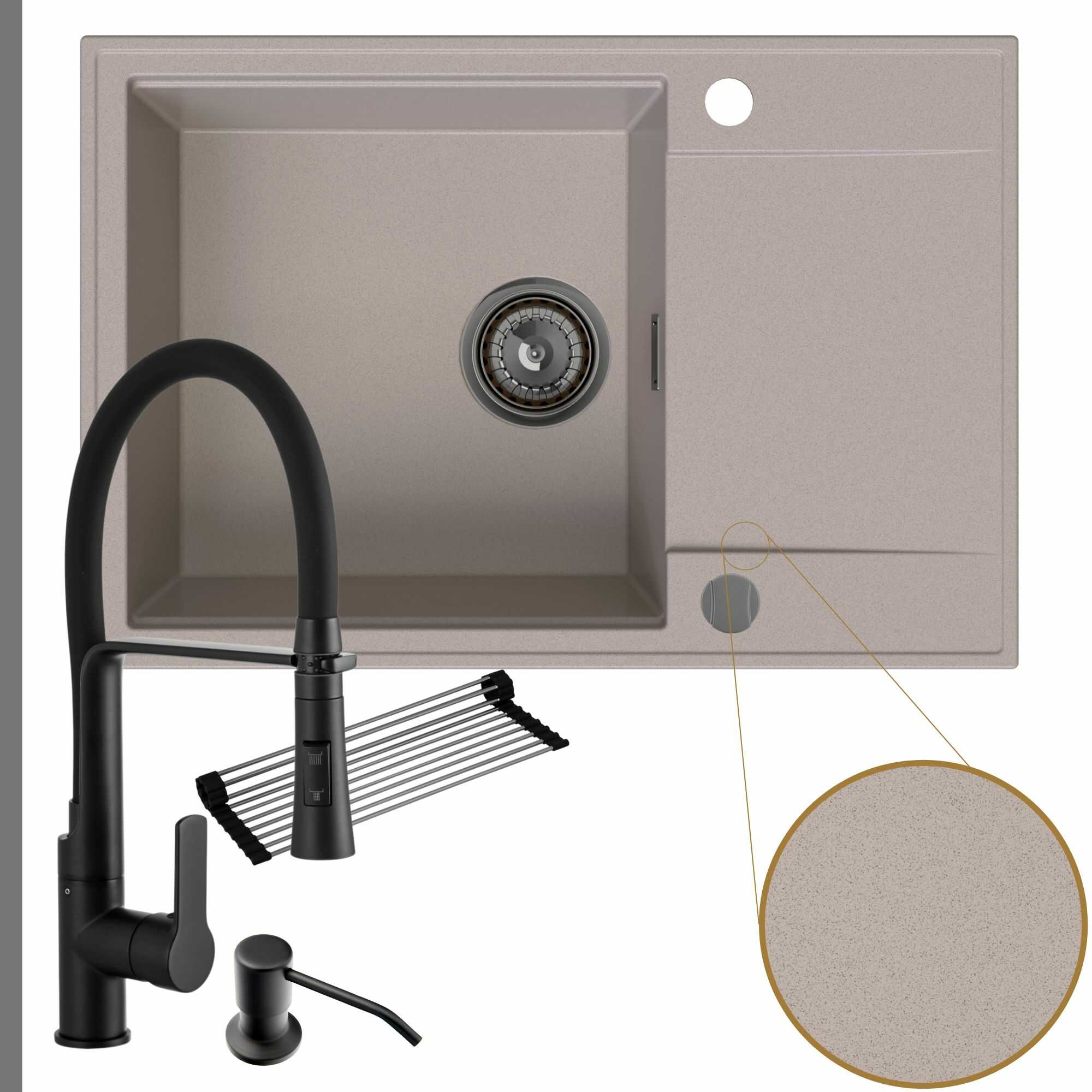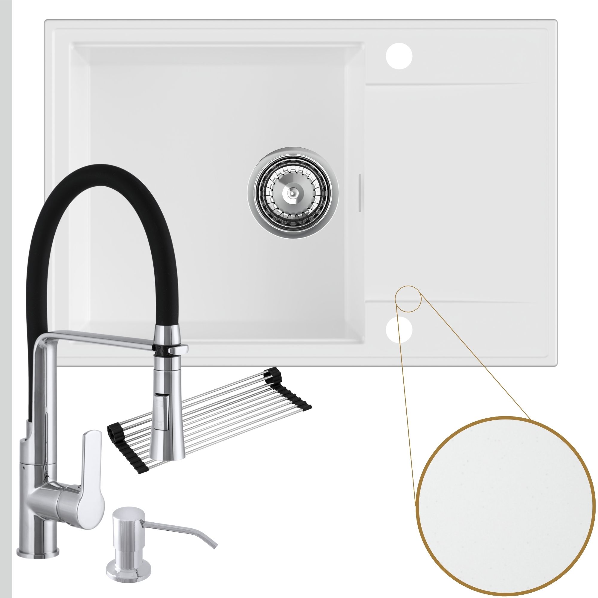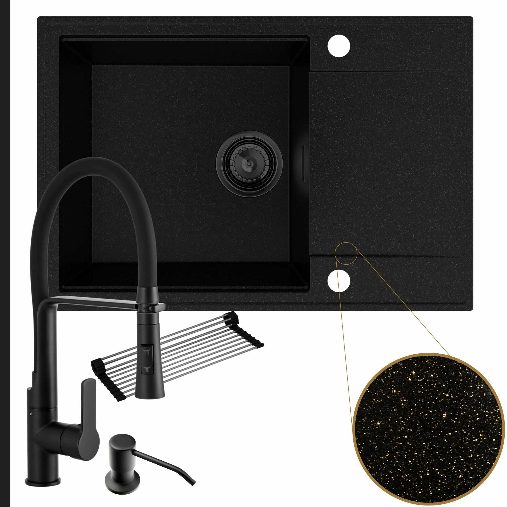 Przestronna kuchnia: zlew + bateria + dozownik + syfon + mata