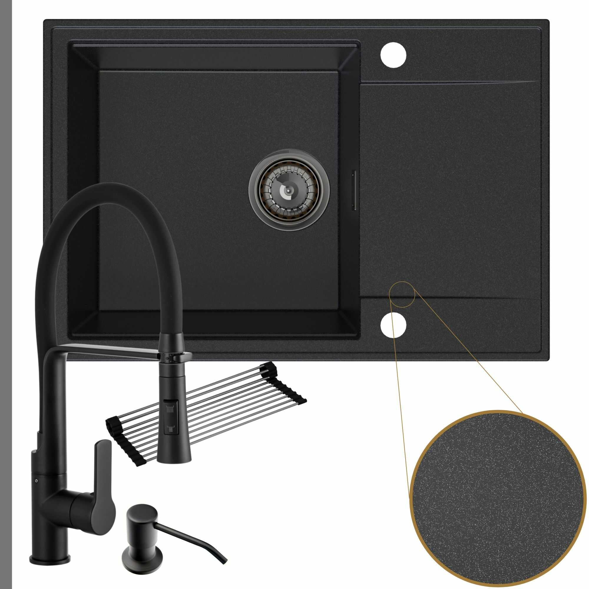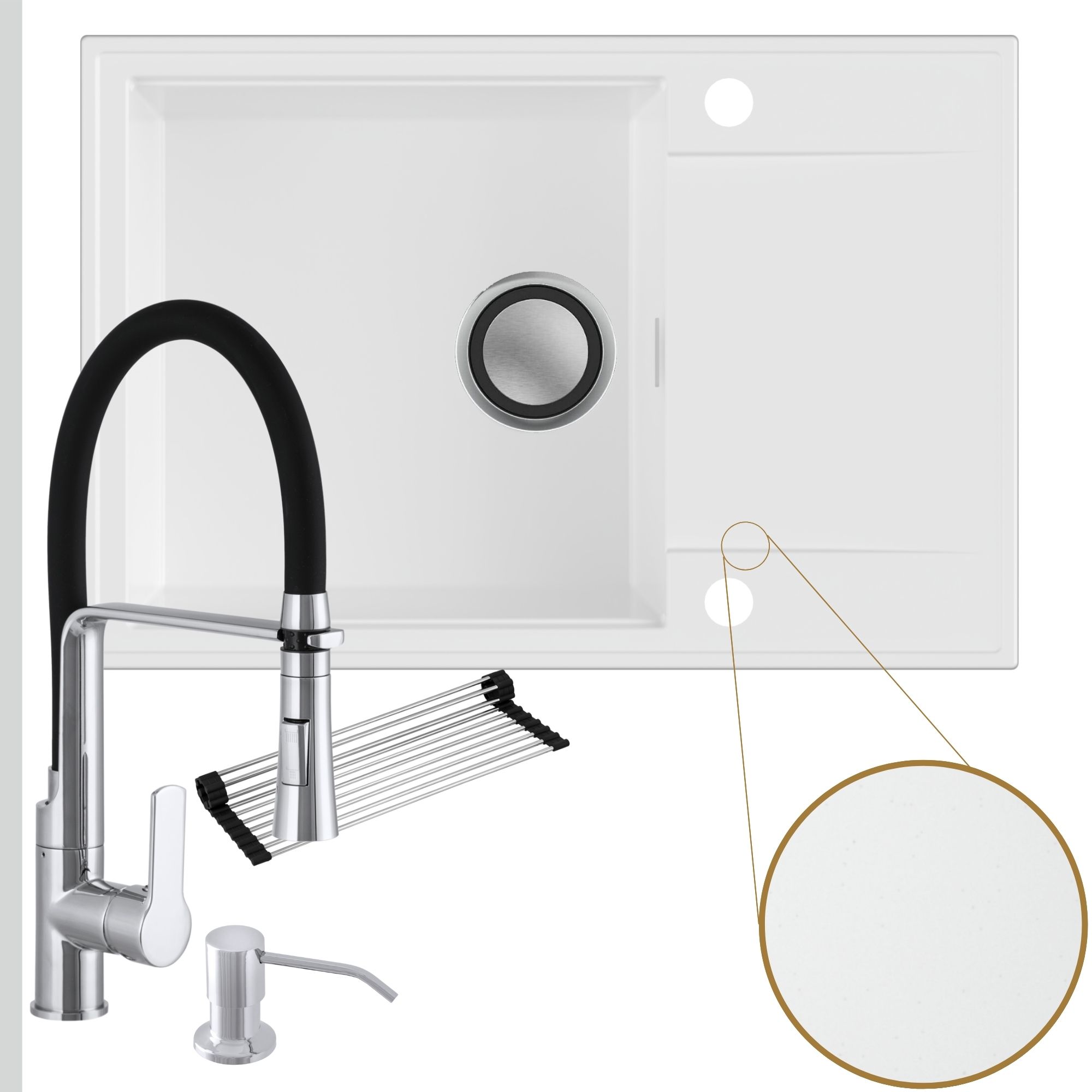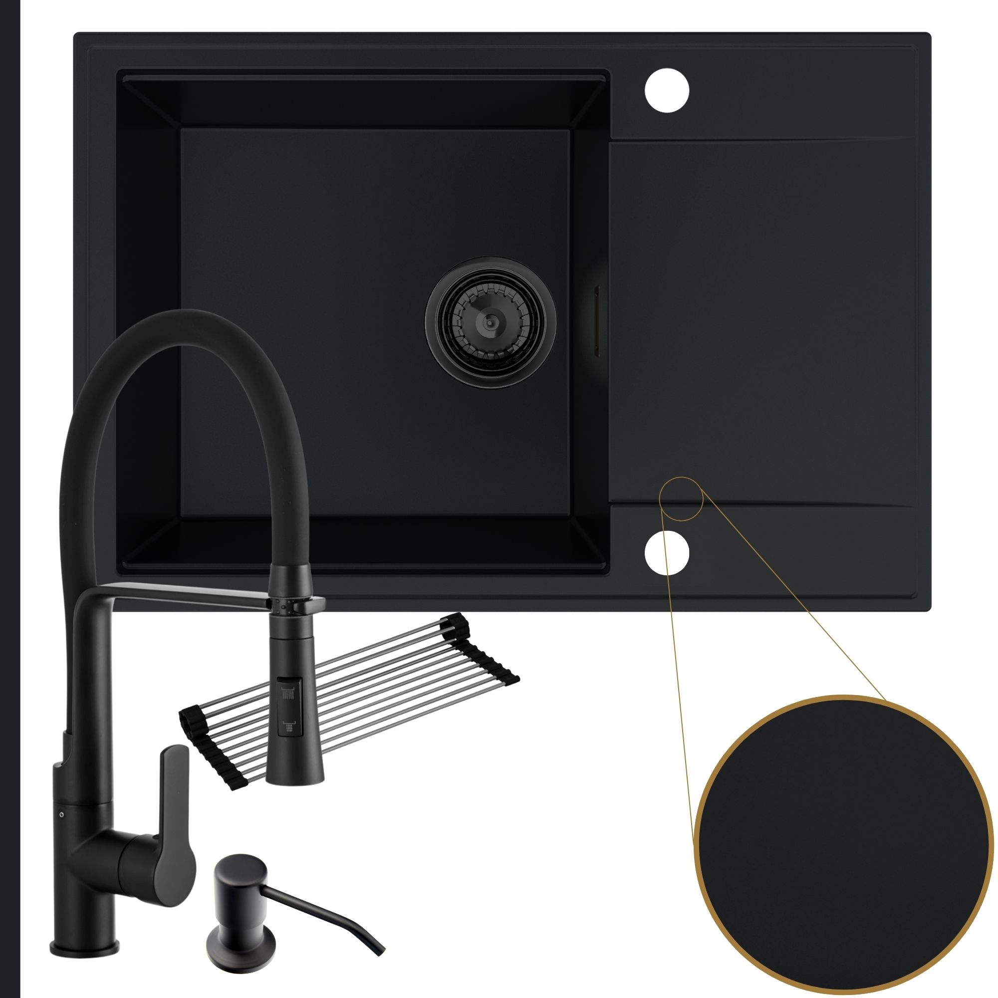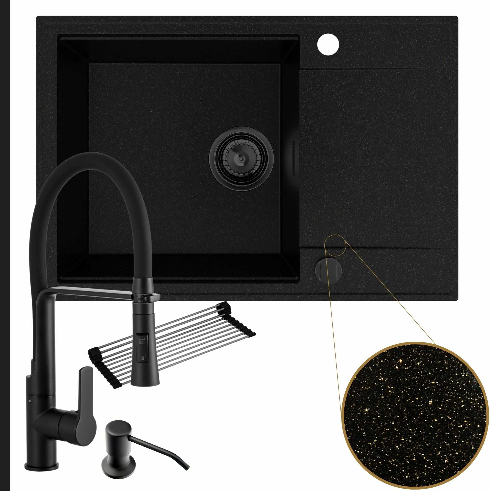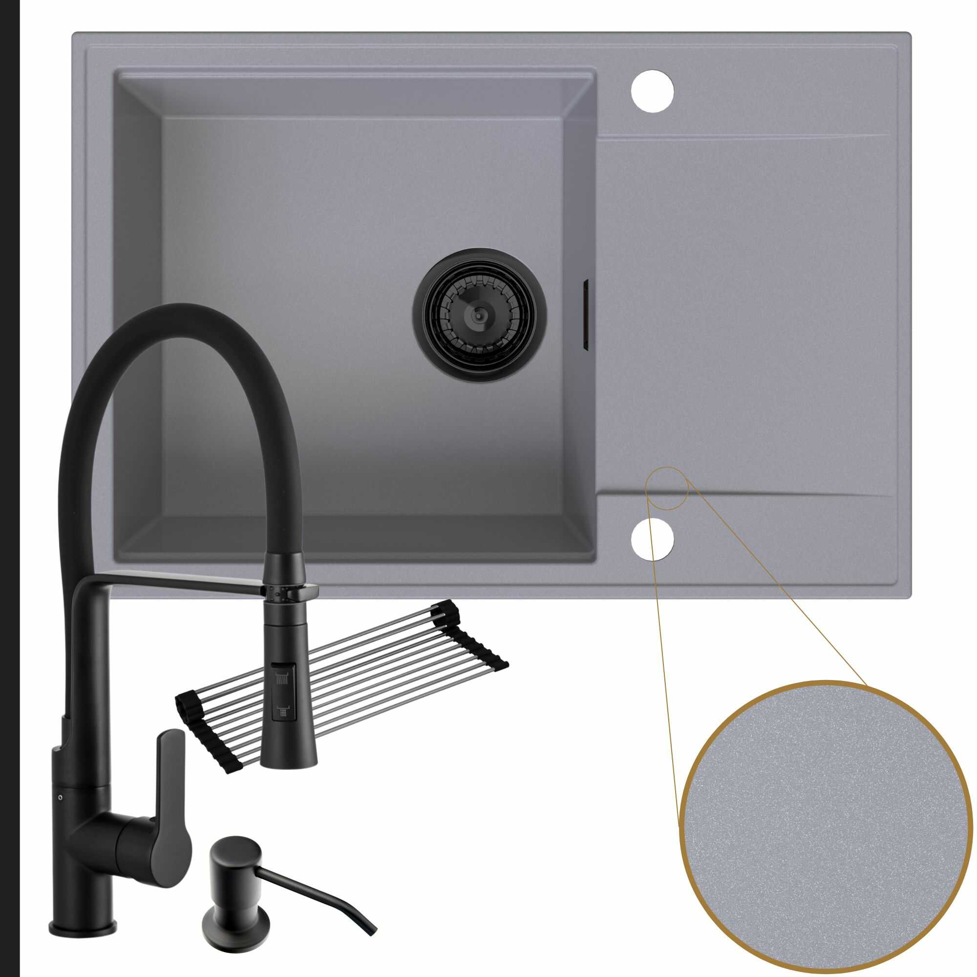 Przestronna kuchnia: zlew + bateria + dozownik + syfon + mata