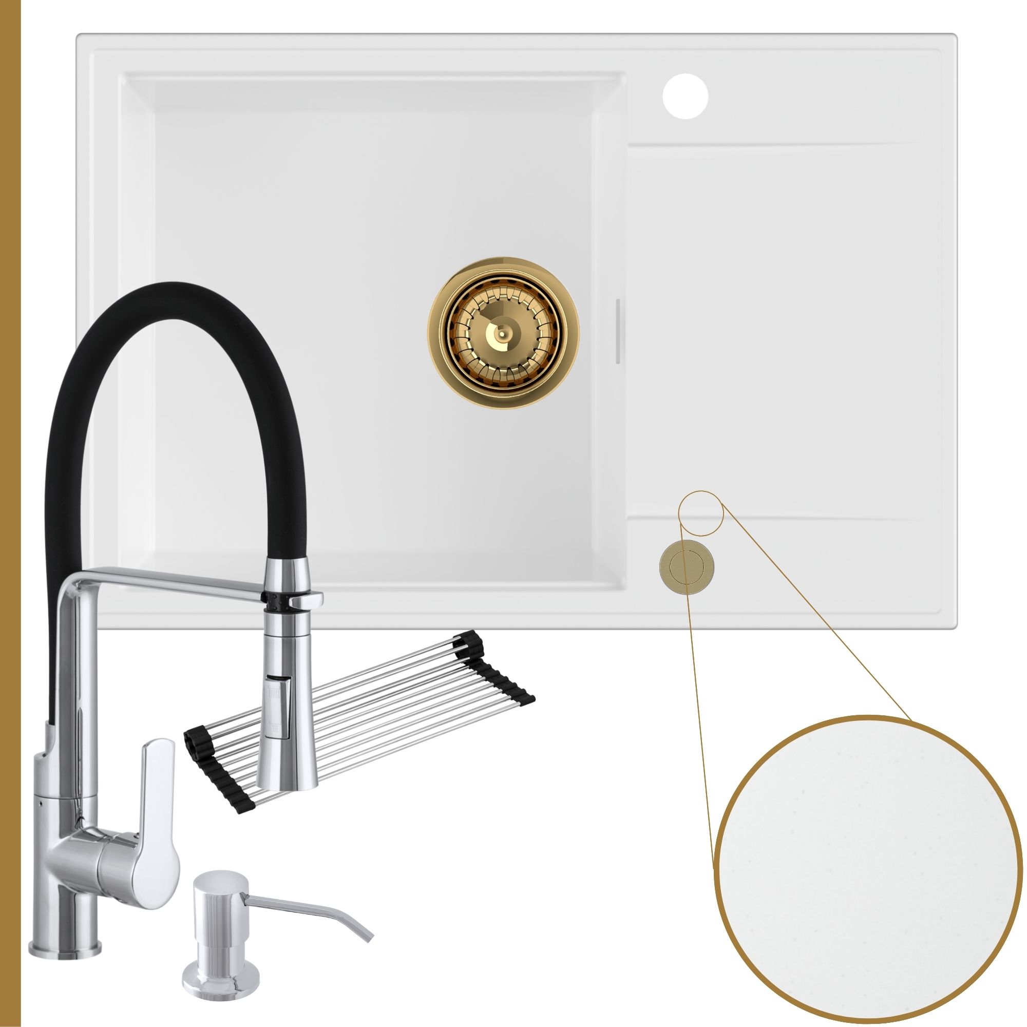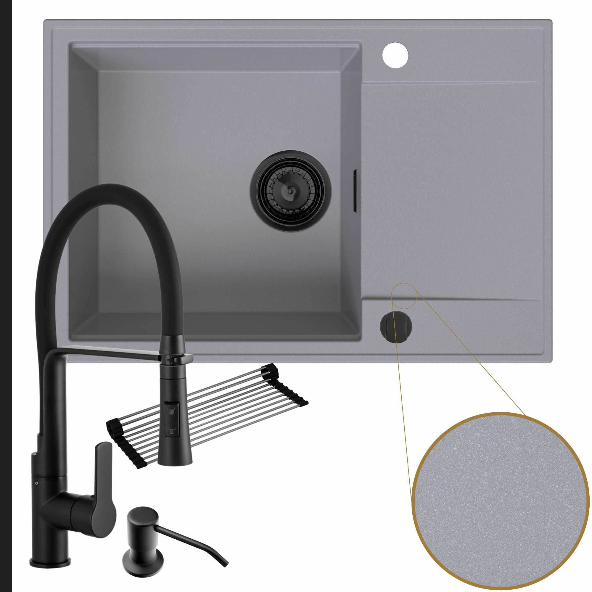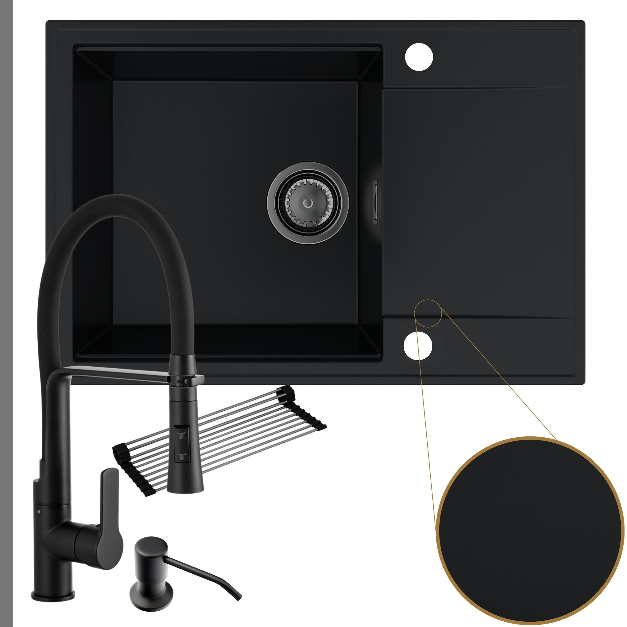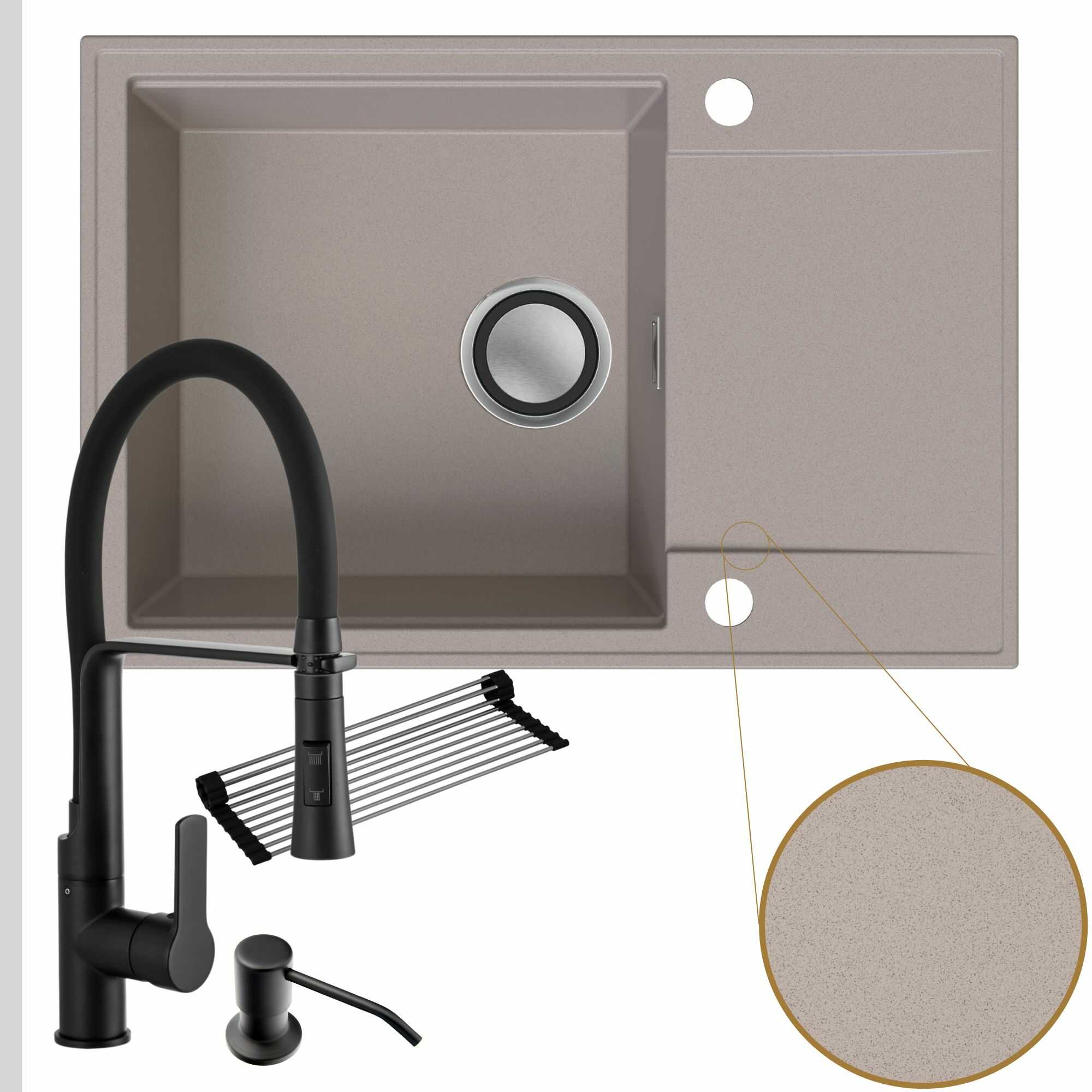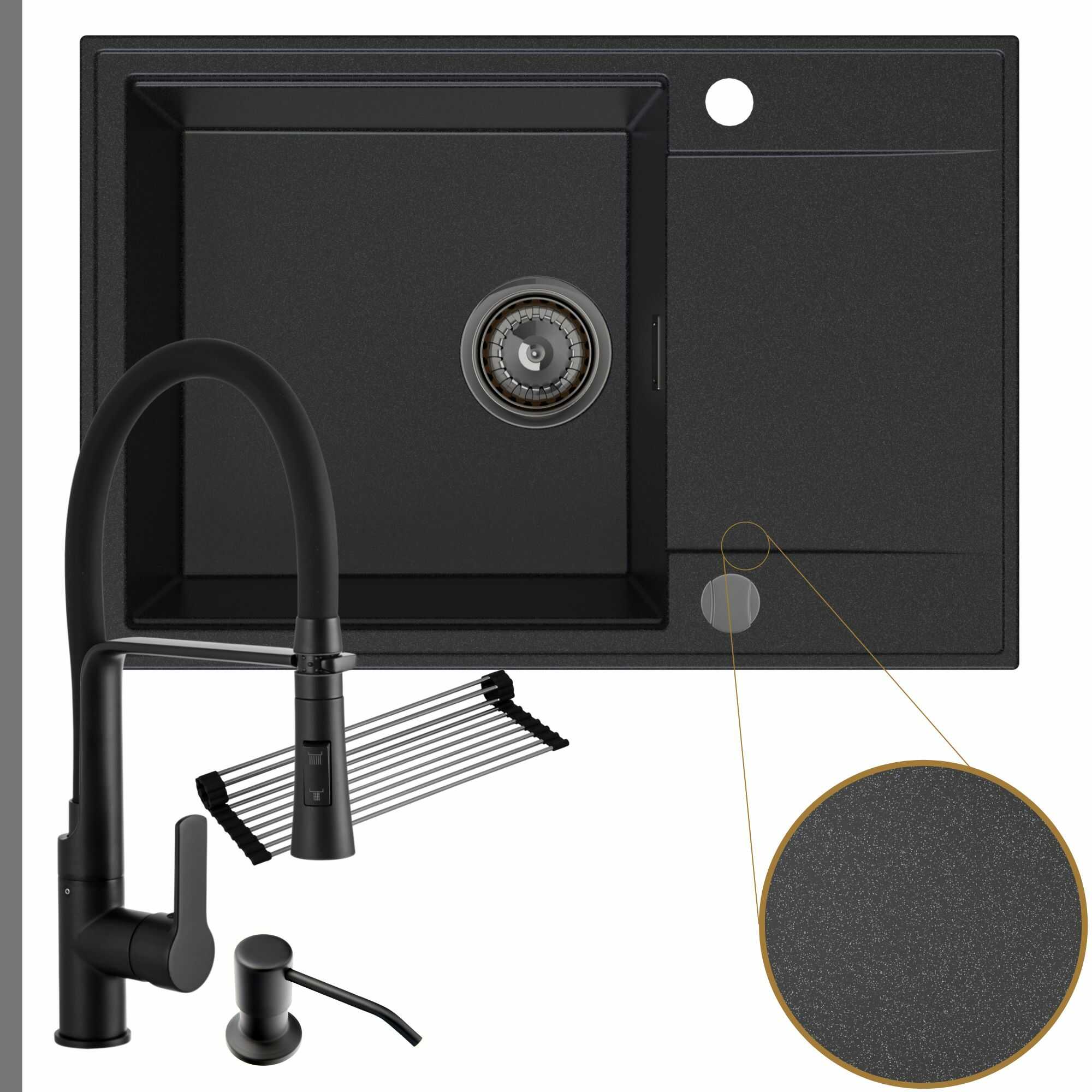 Przestronna kuchnia: zlew + bateria + dozownik + syfon + mata