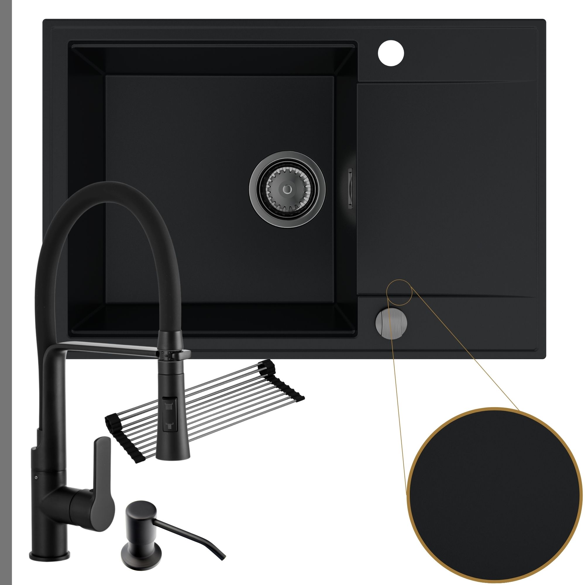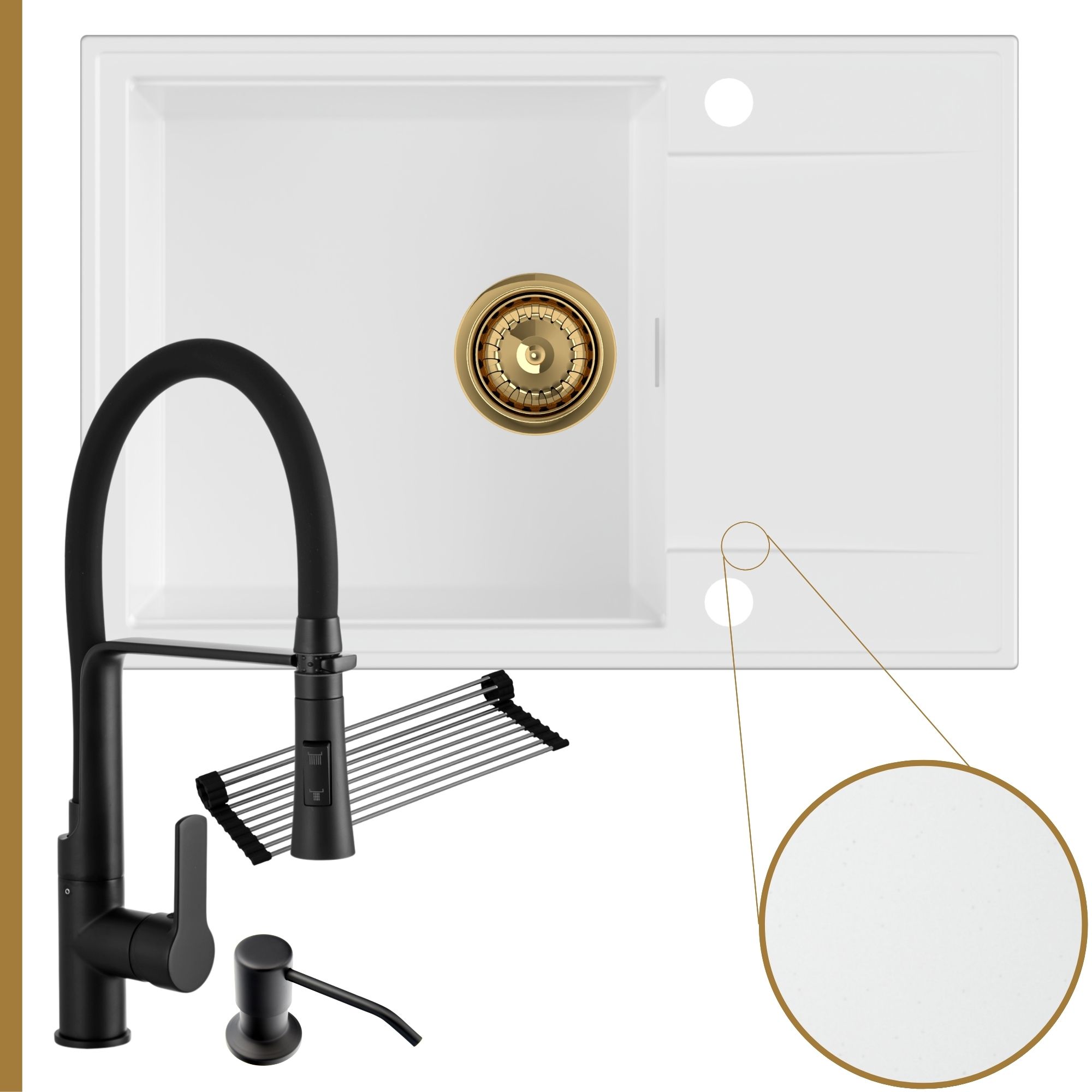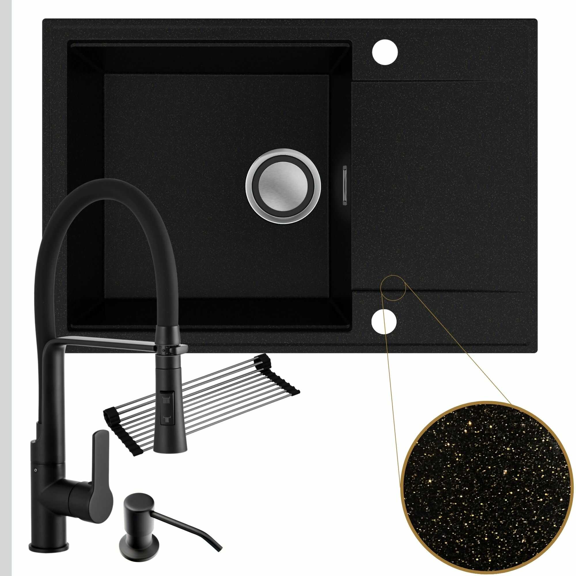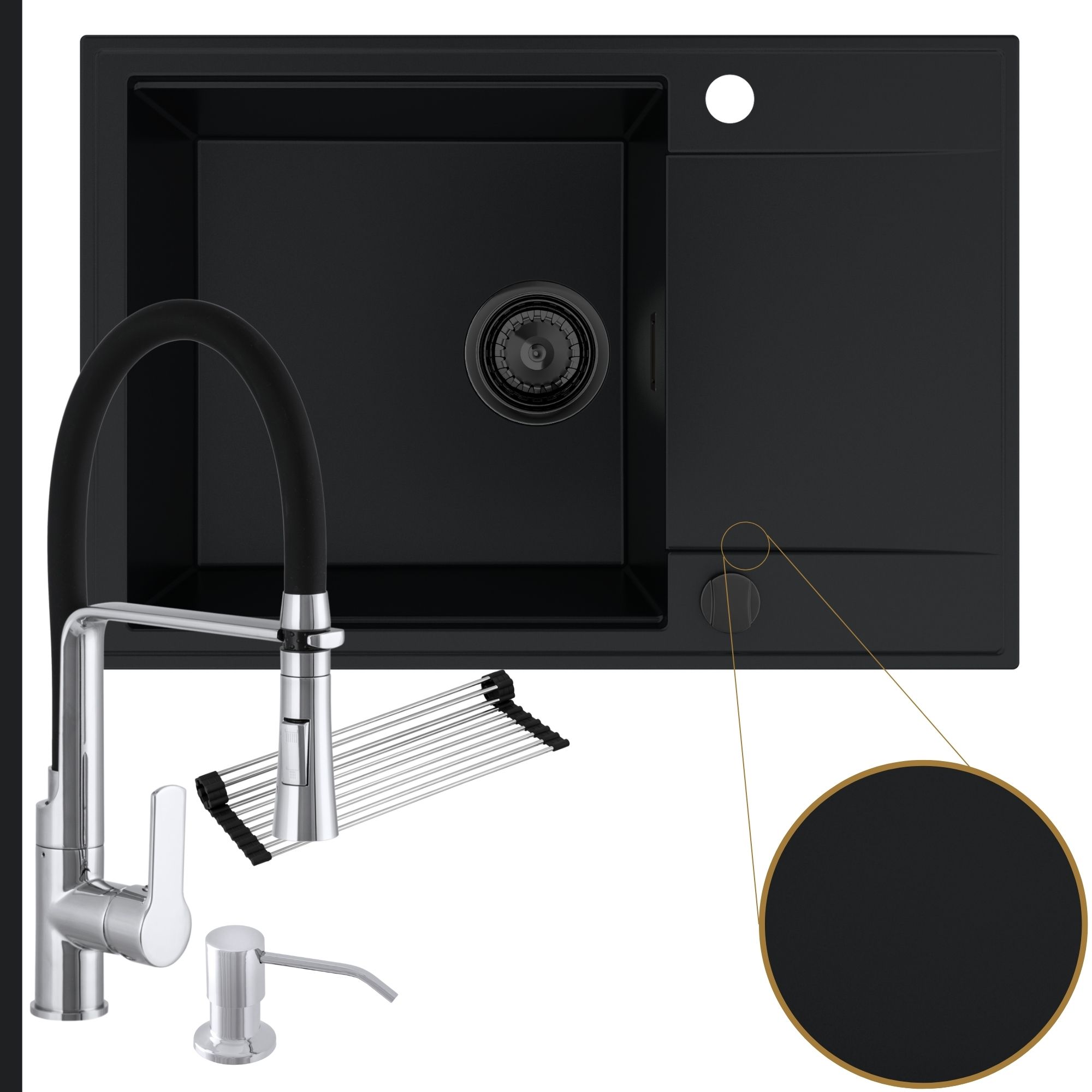 Przestronna kuchnia: zlew + bateria + dozownik + syfon + mata