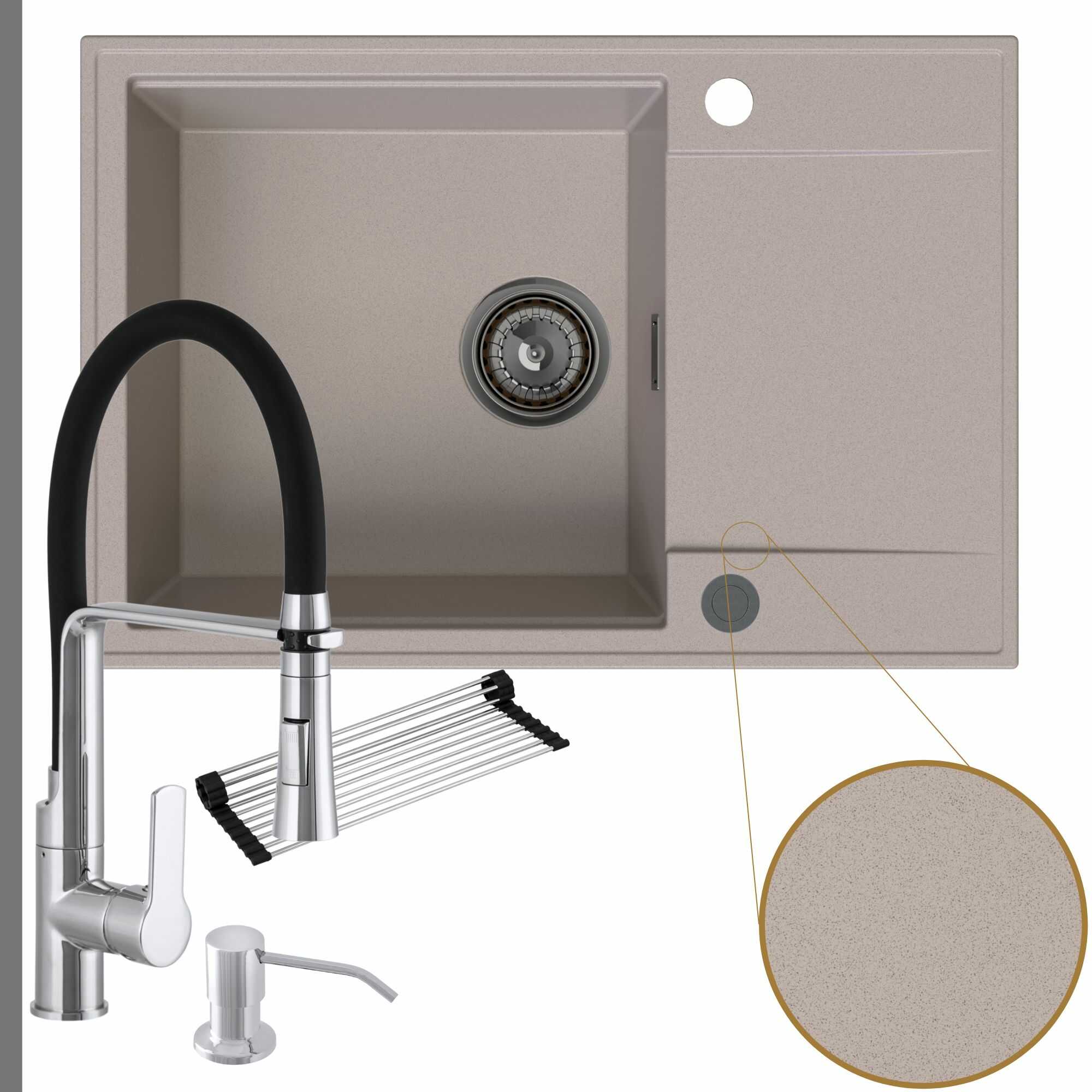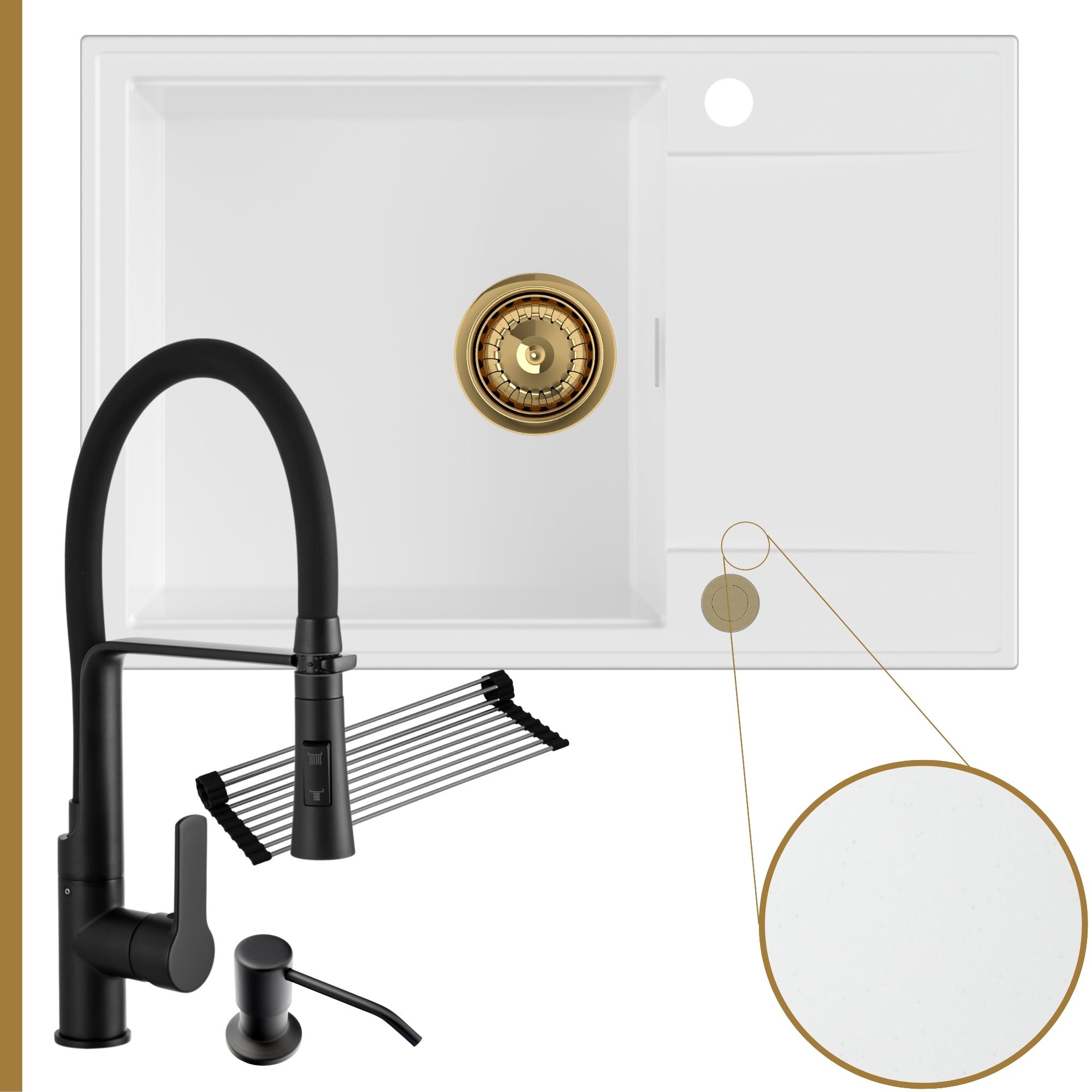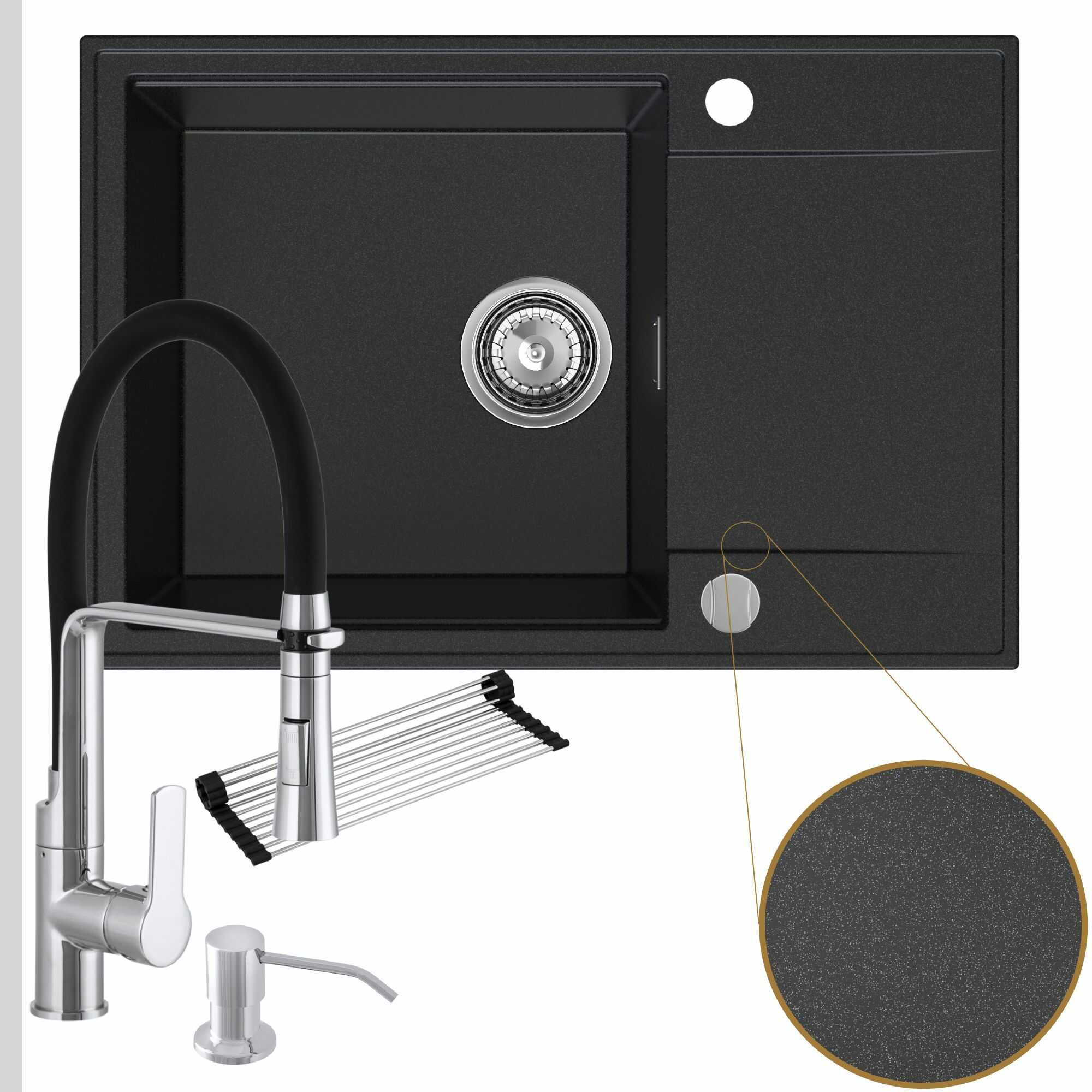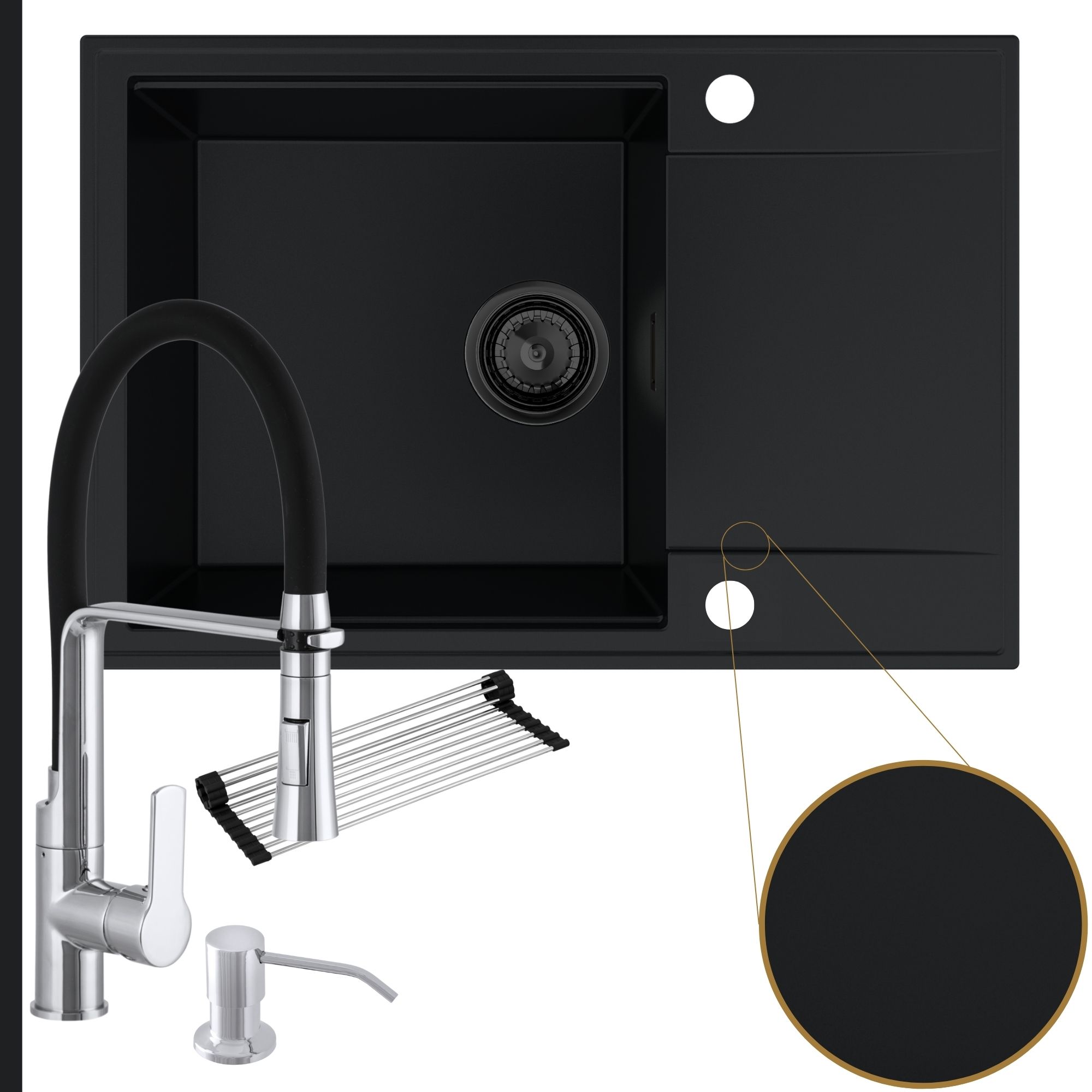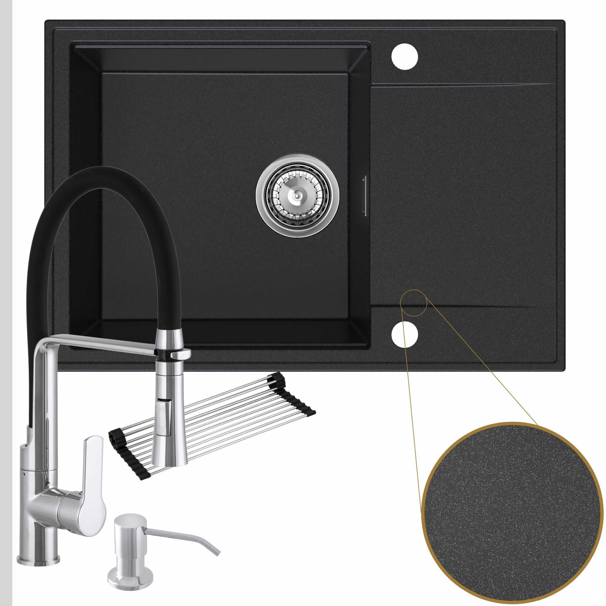 Przestronna kuchnia: zlew + bateria + dozownik + syfon + mata