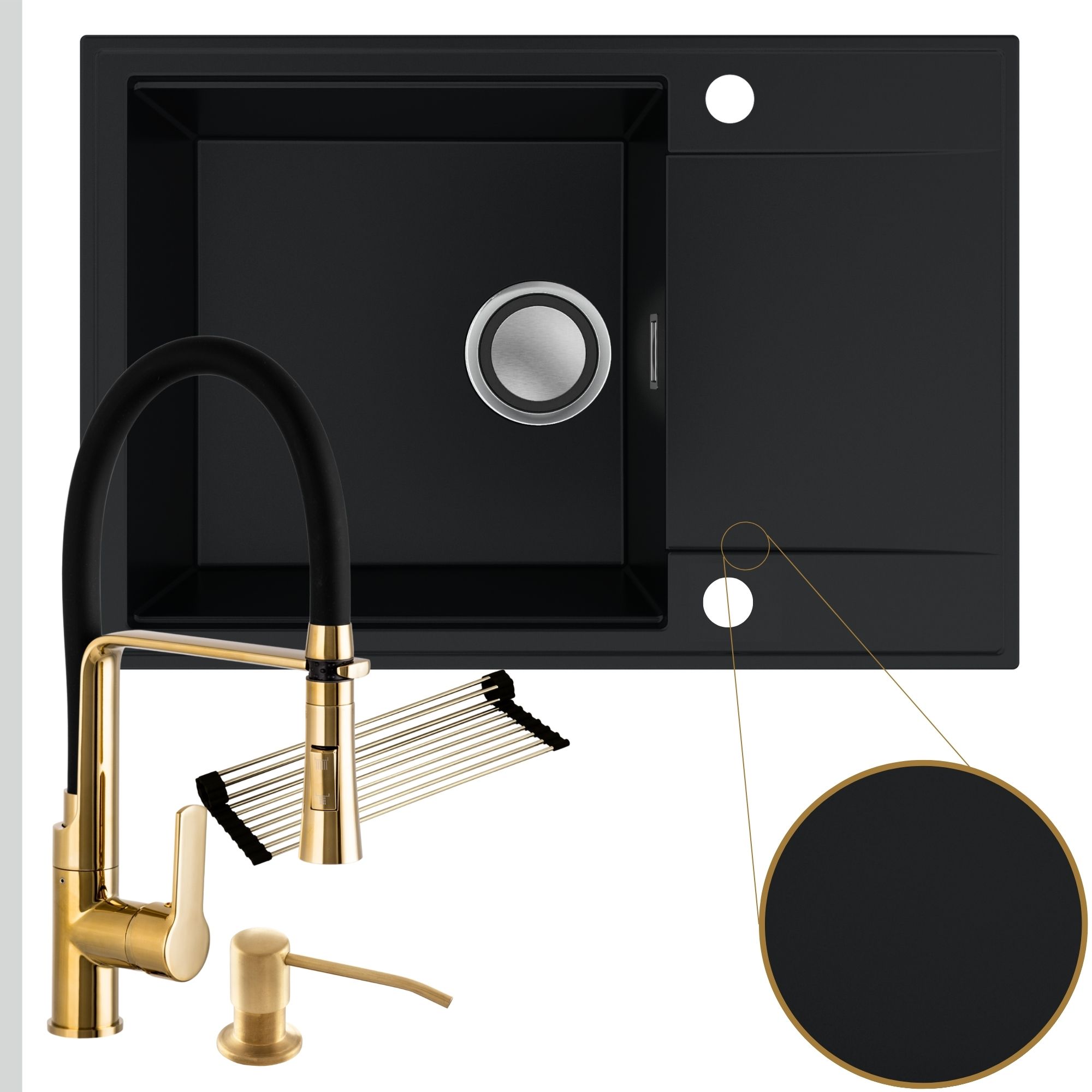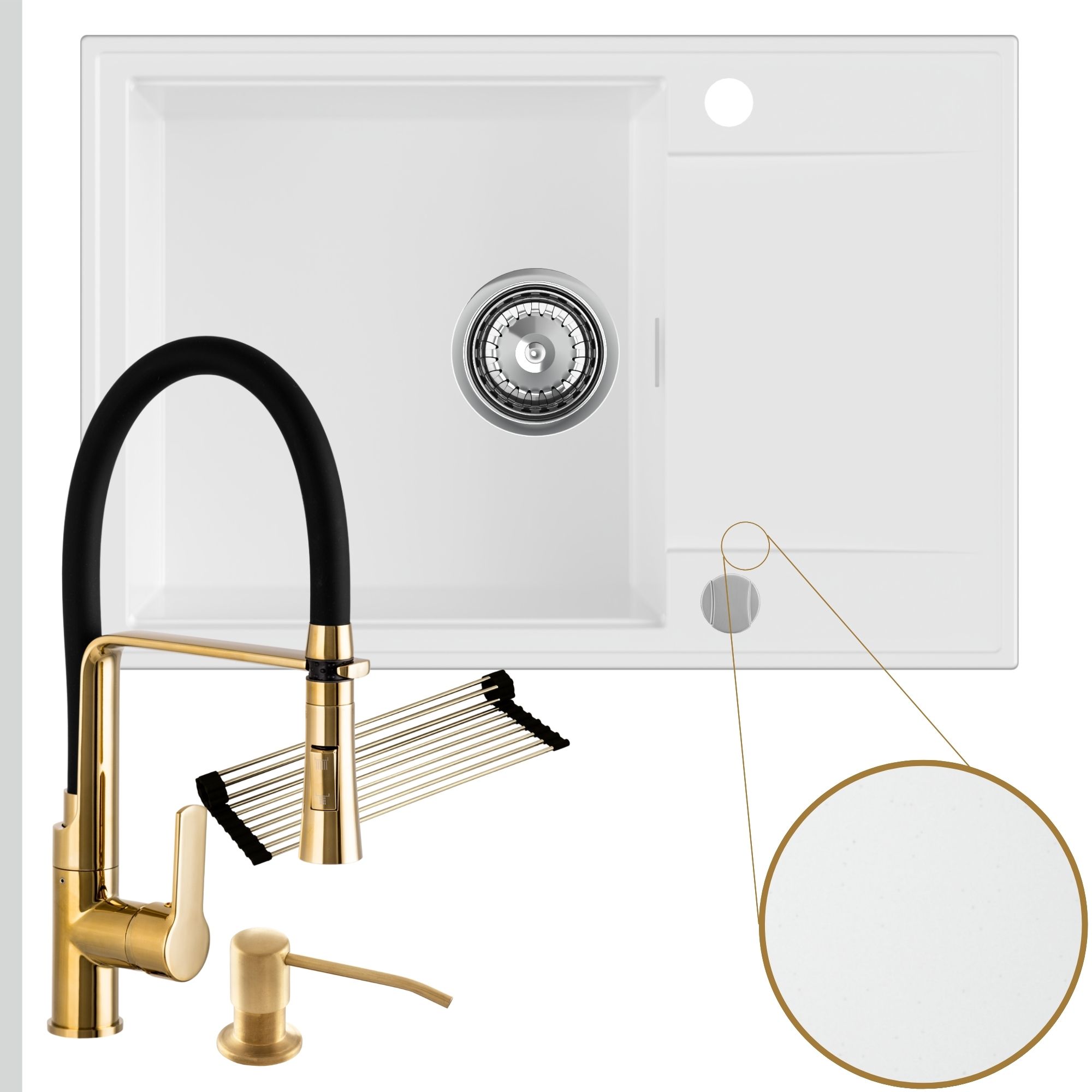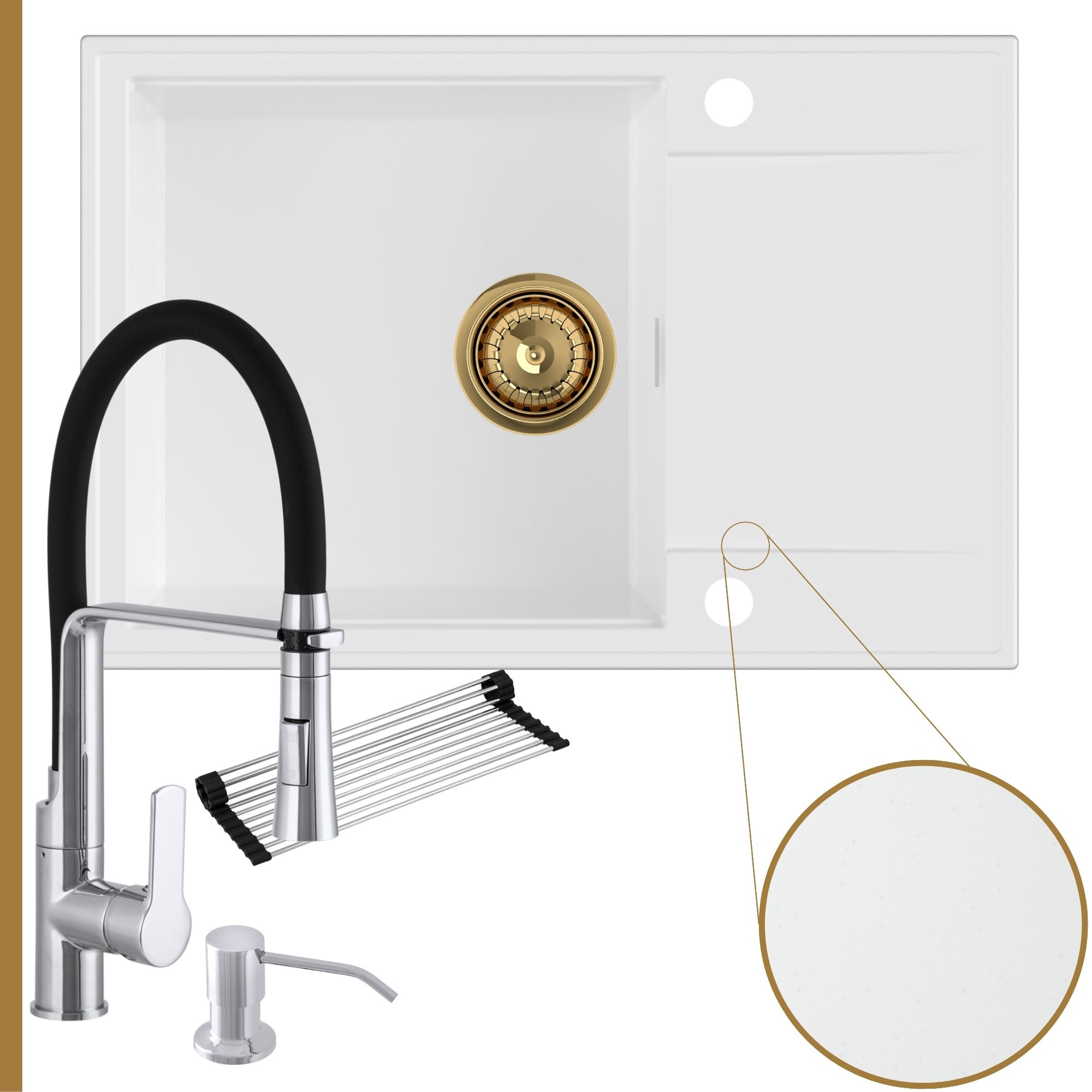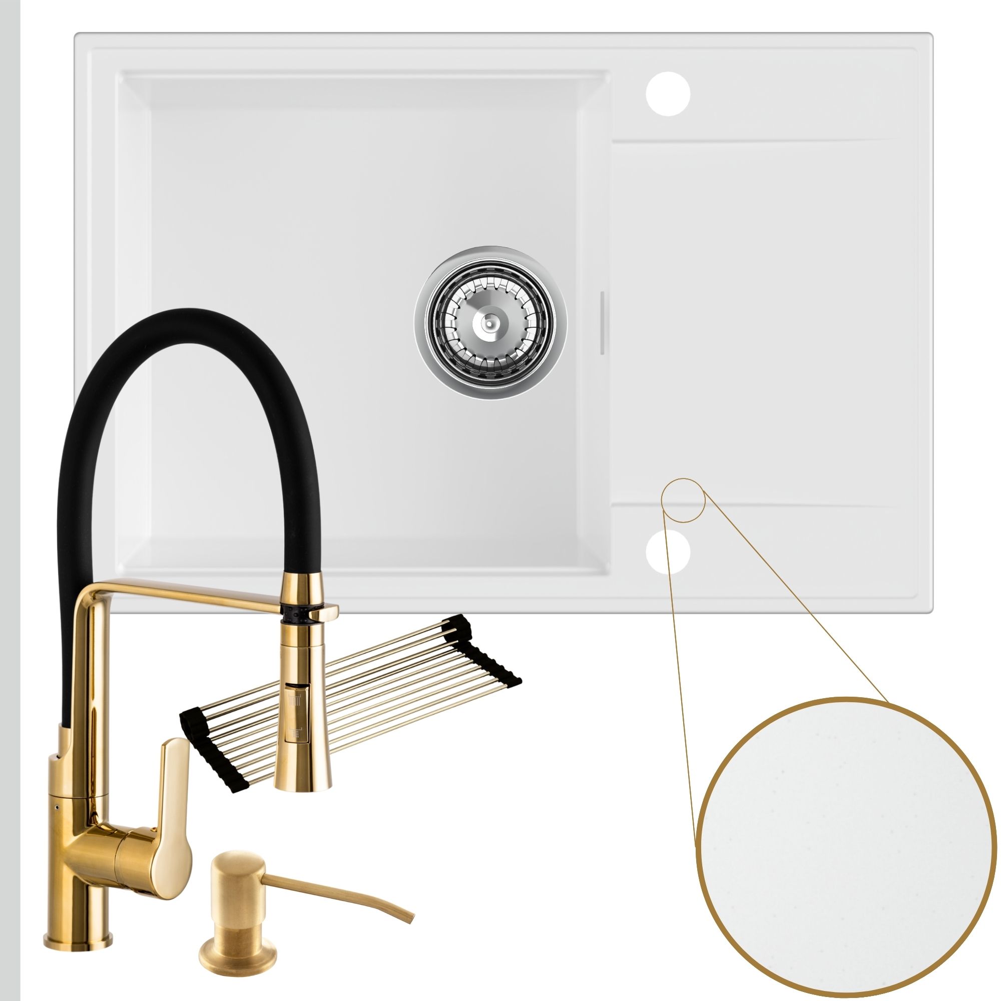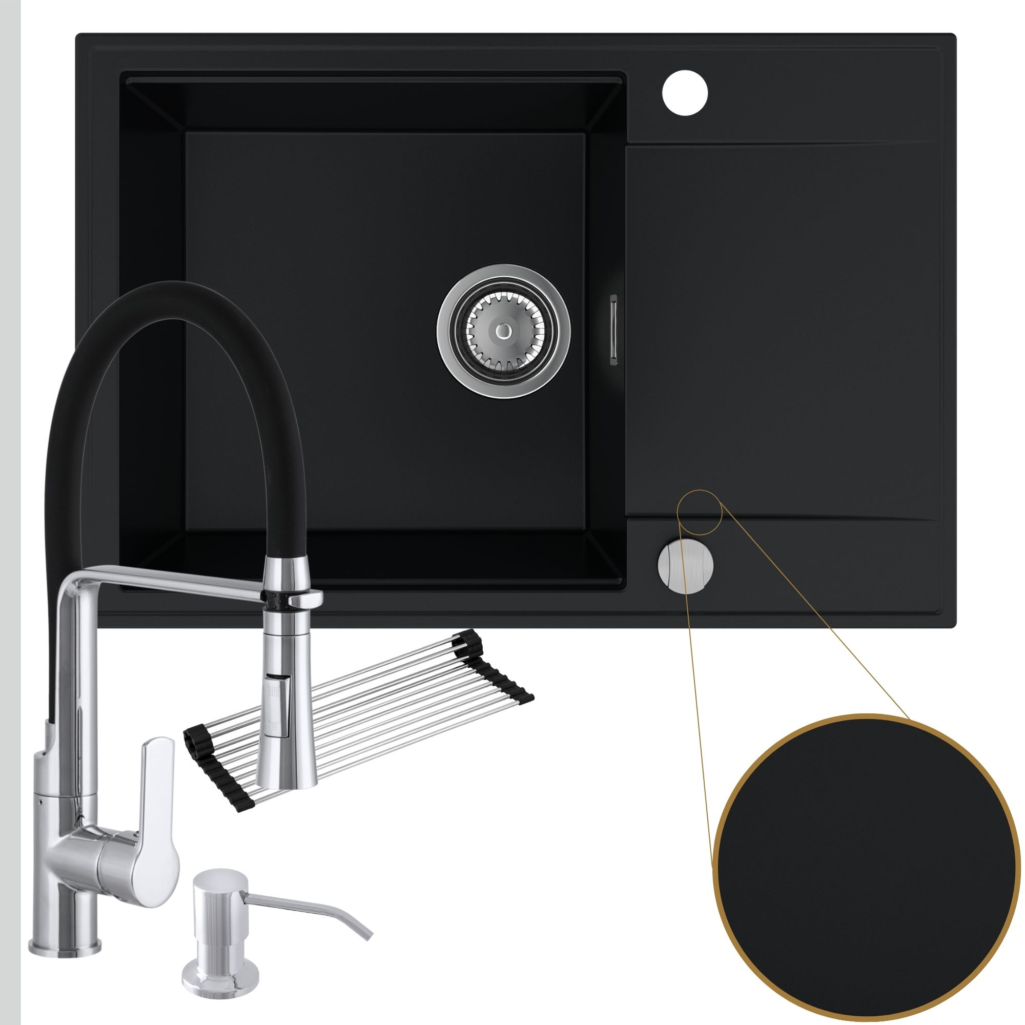 Przestronna kuchnia: zlew + bateria + dozownik + syfon + mata