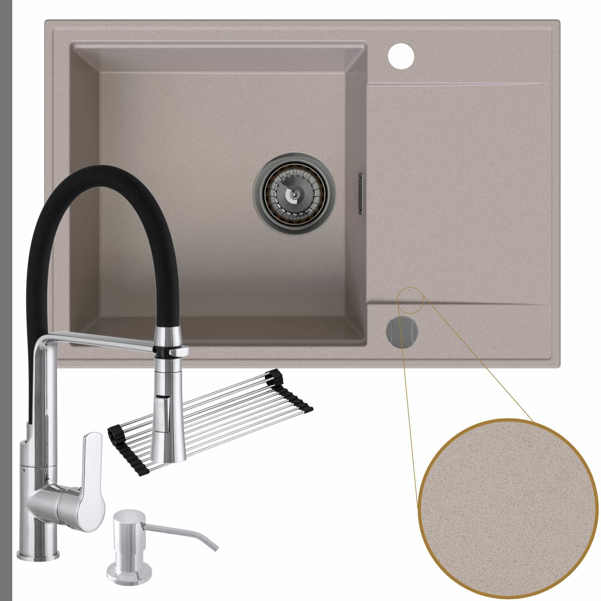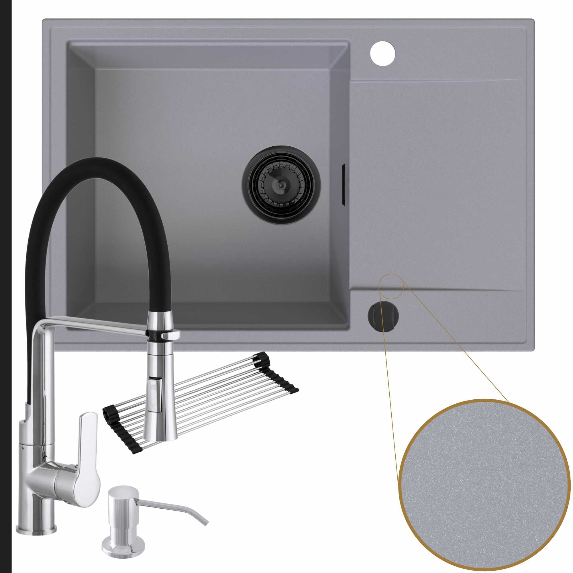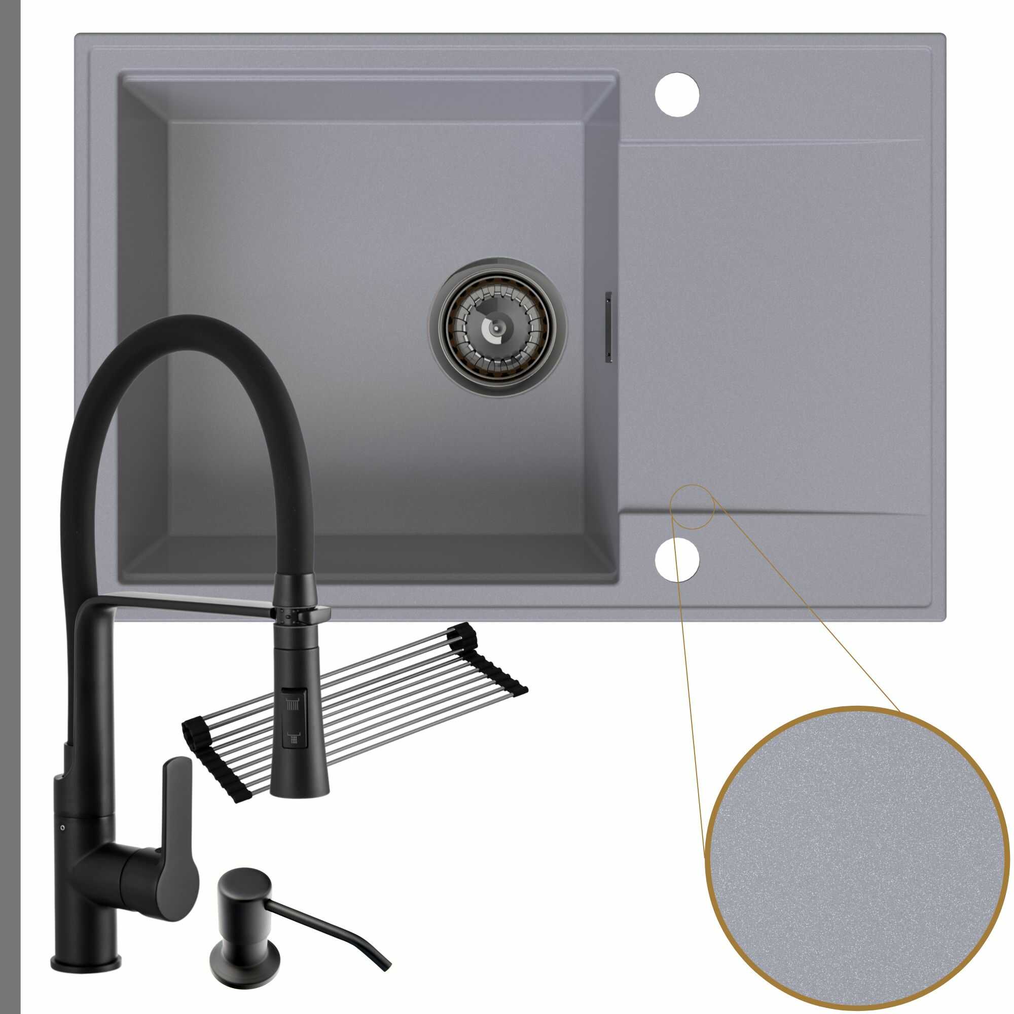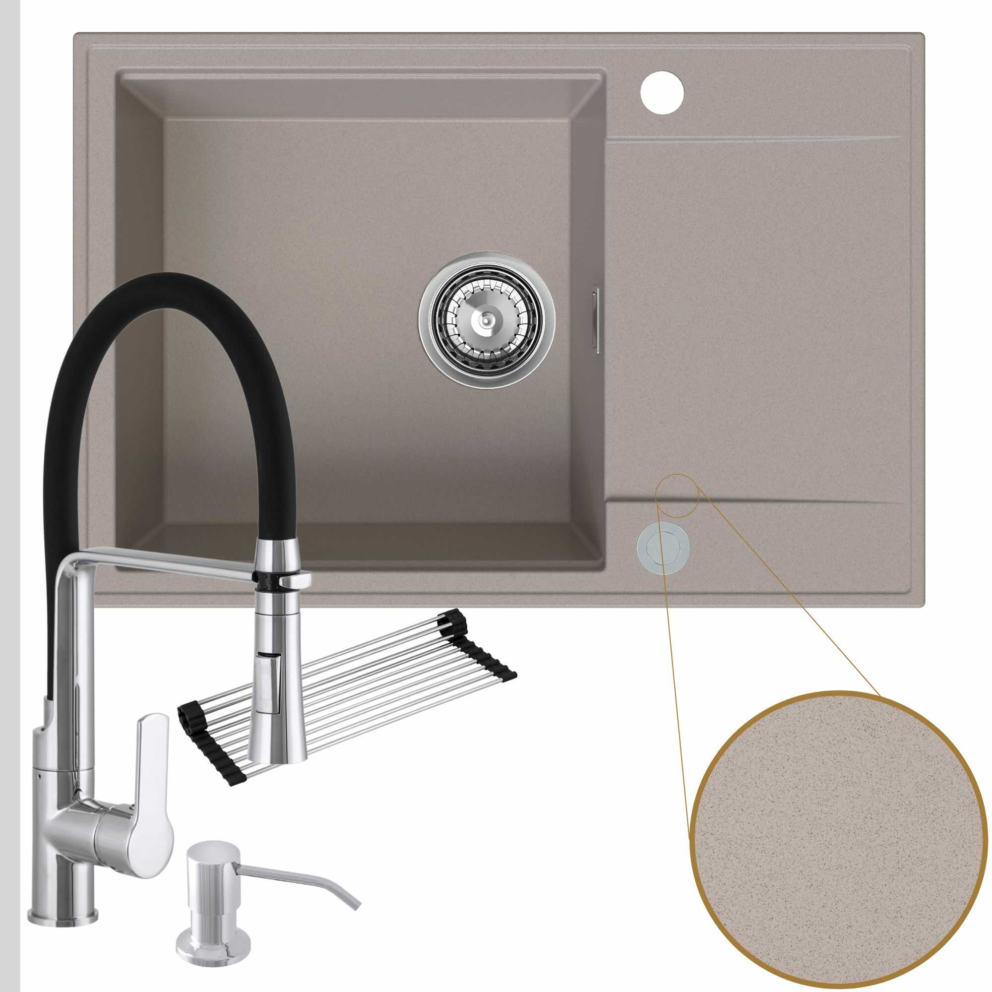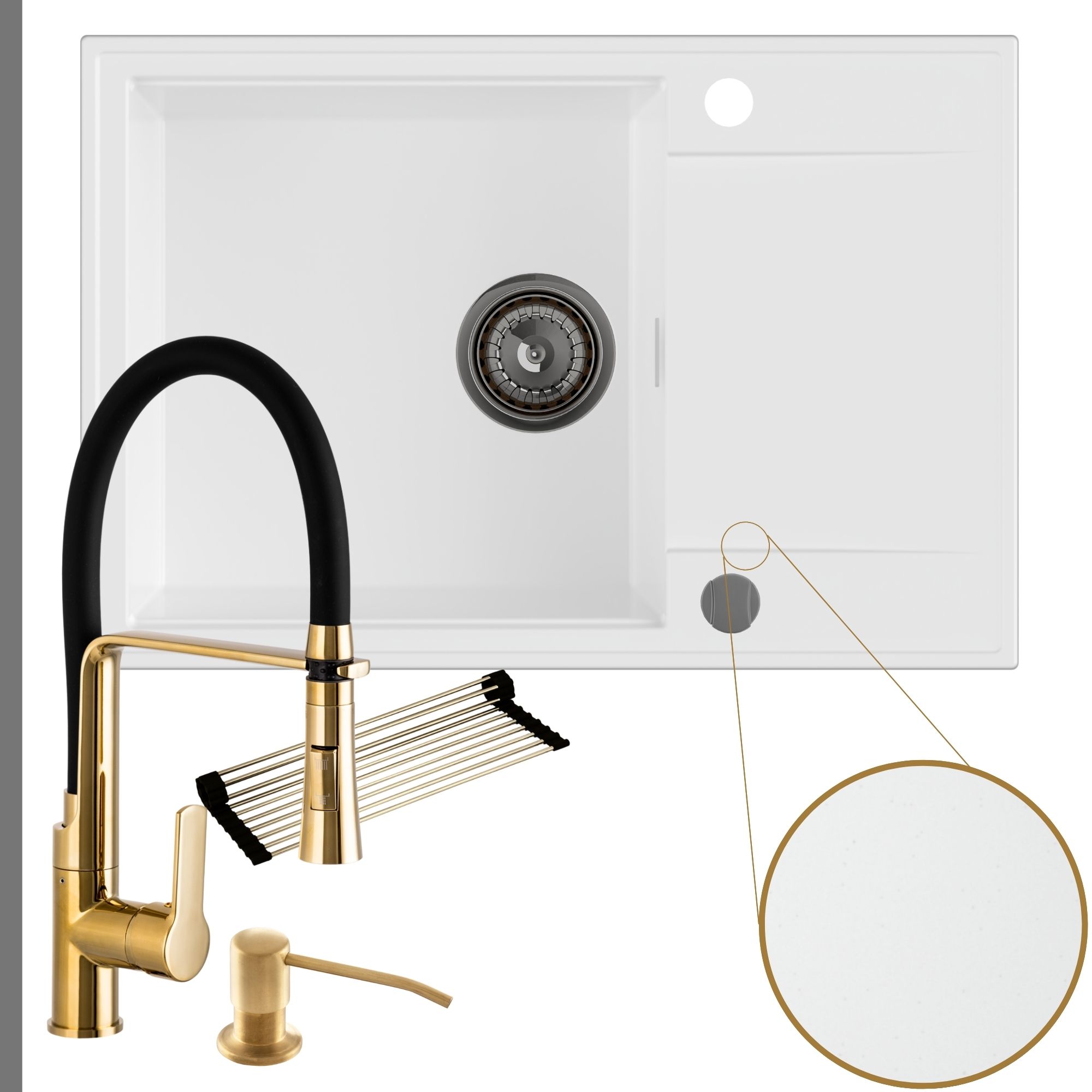 Przestronna kuchnia: zlew + bateria + dozownik + syfon + mata
