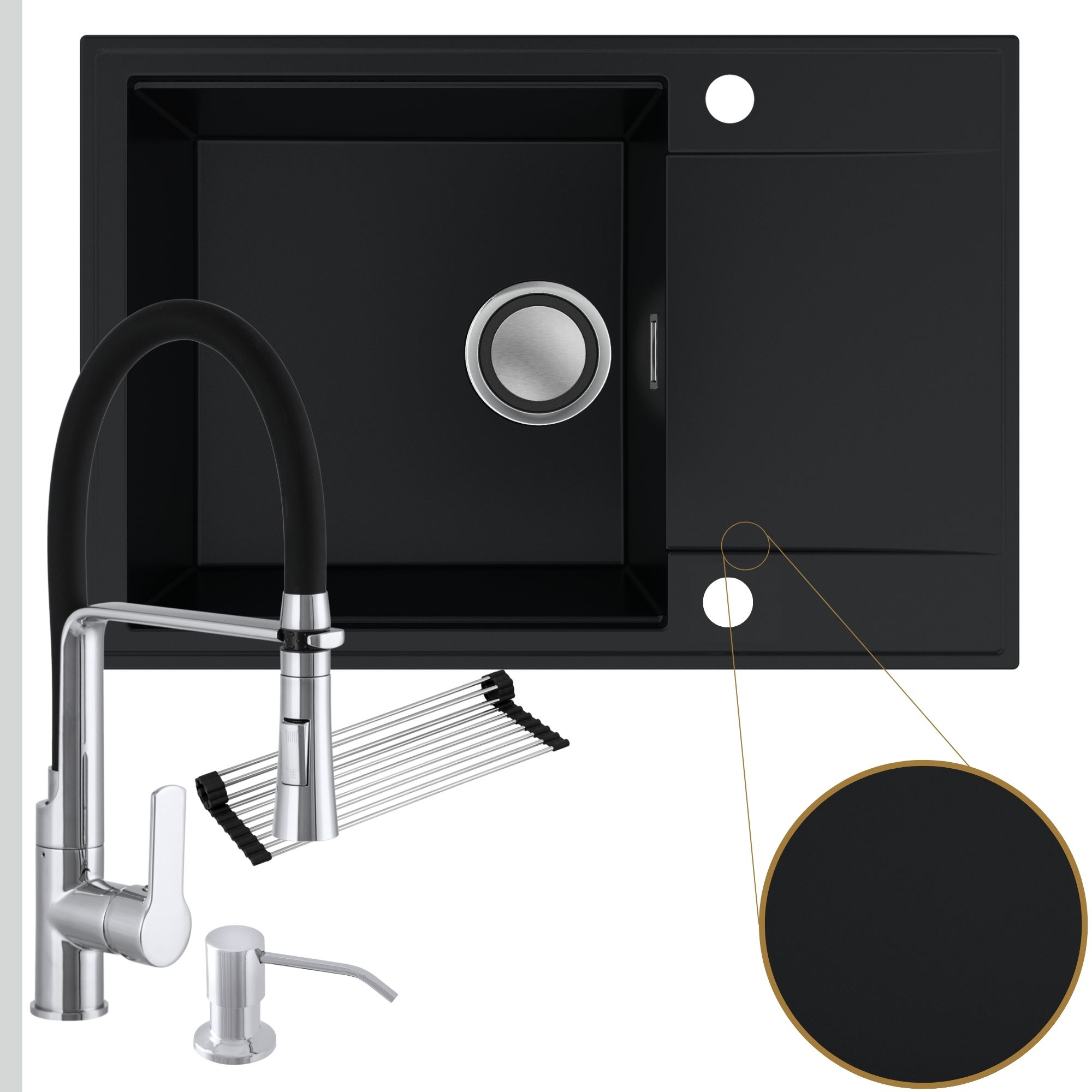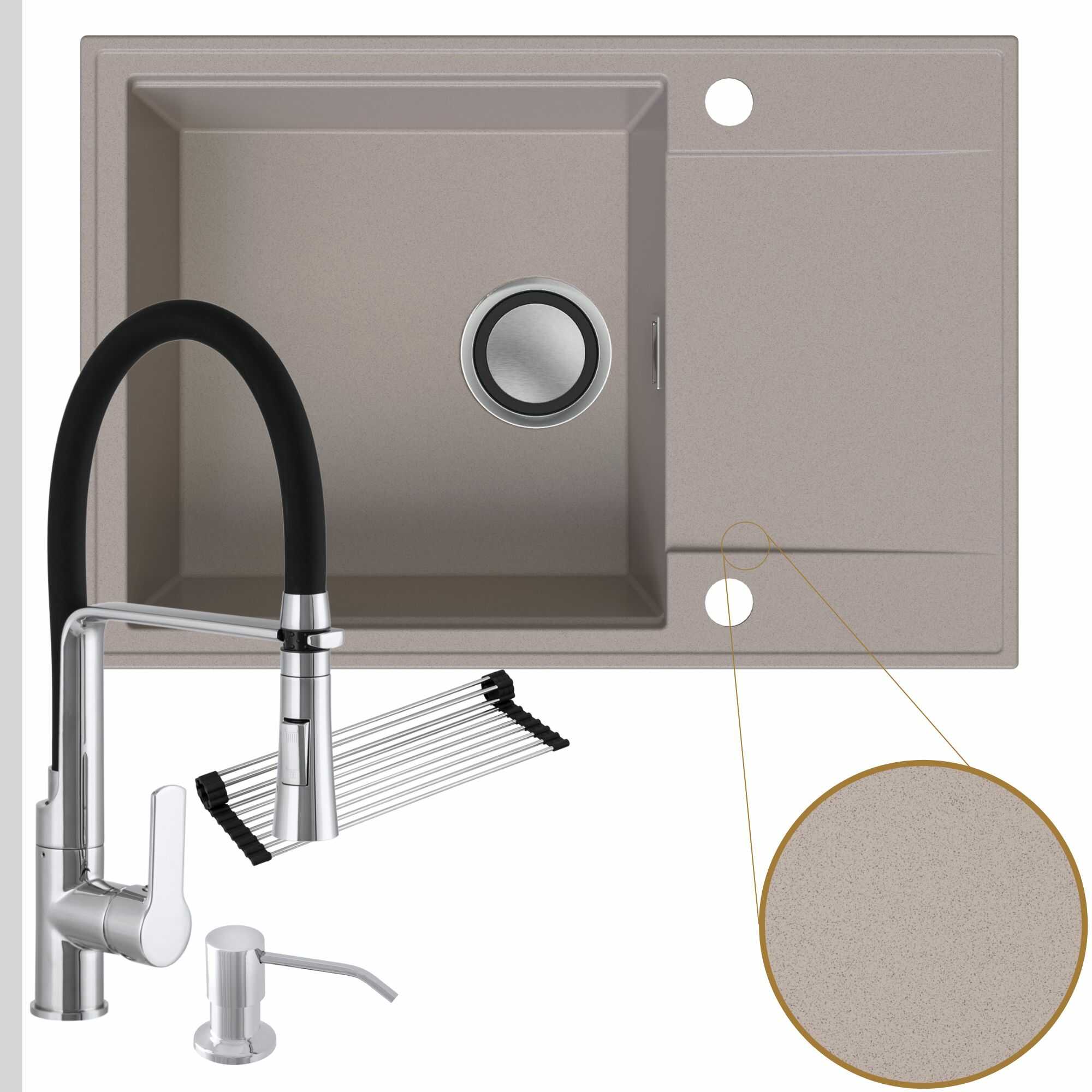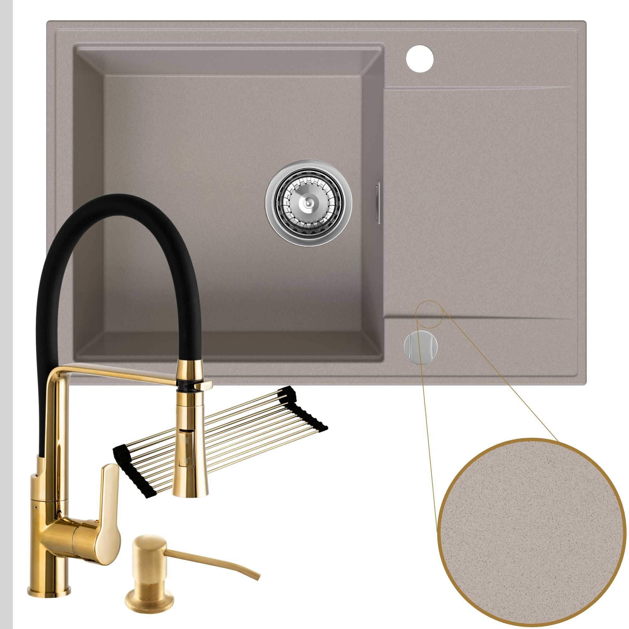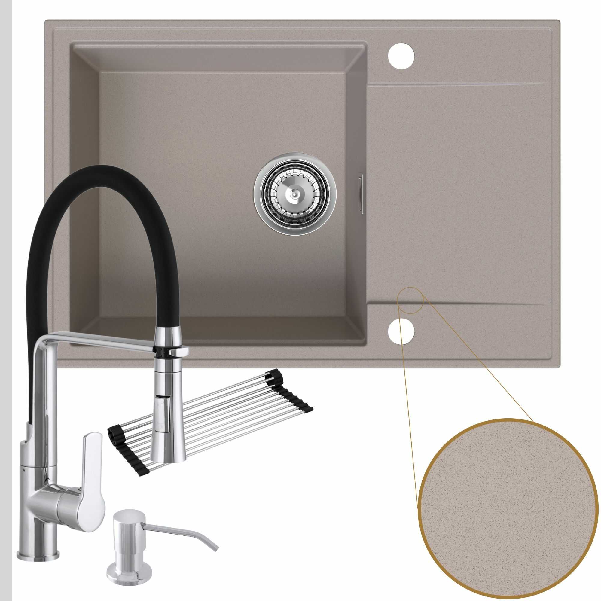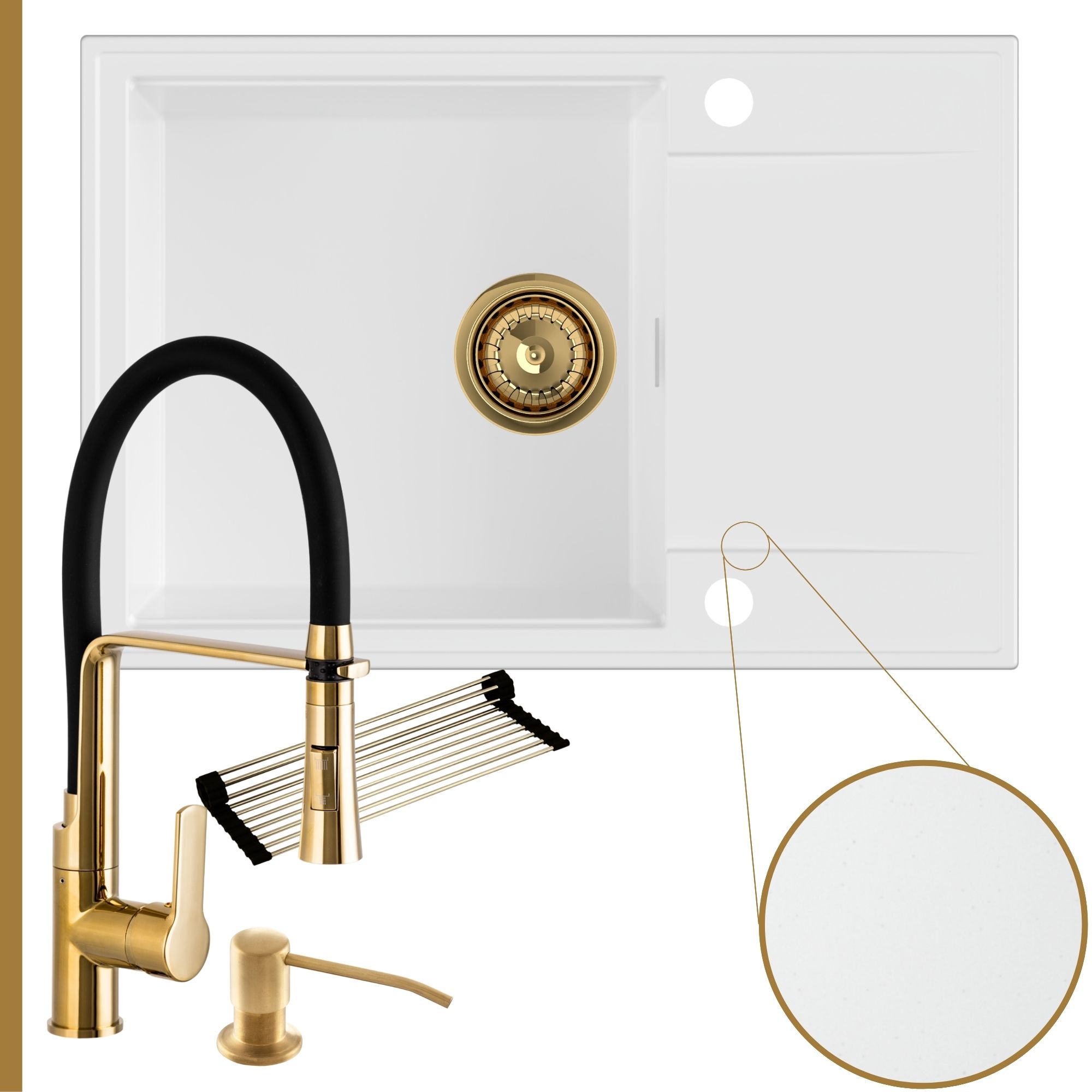 Przestronna kuchnia: zlew + bateria + dozownik + syfon + mata
