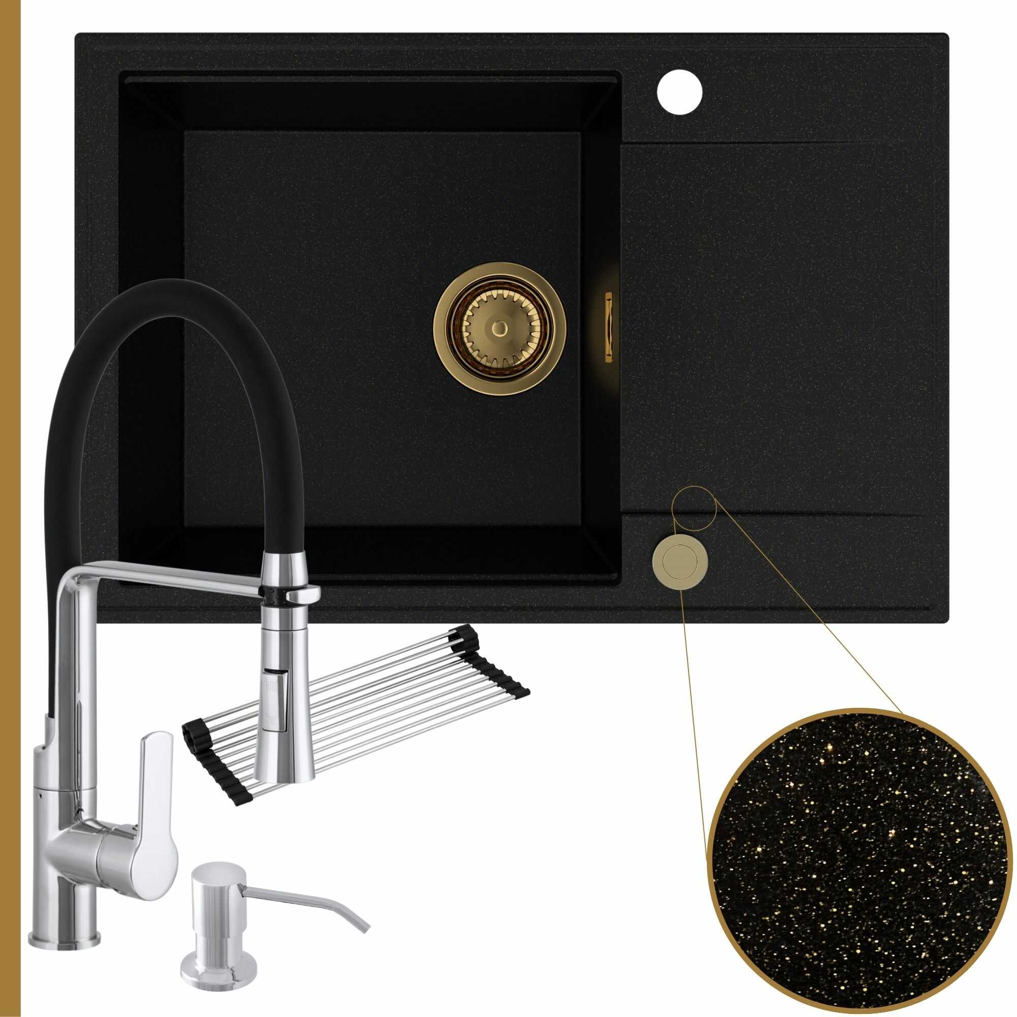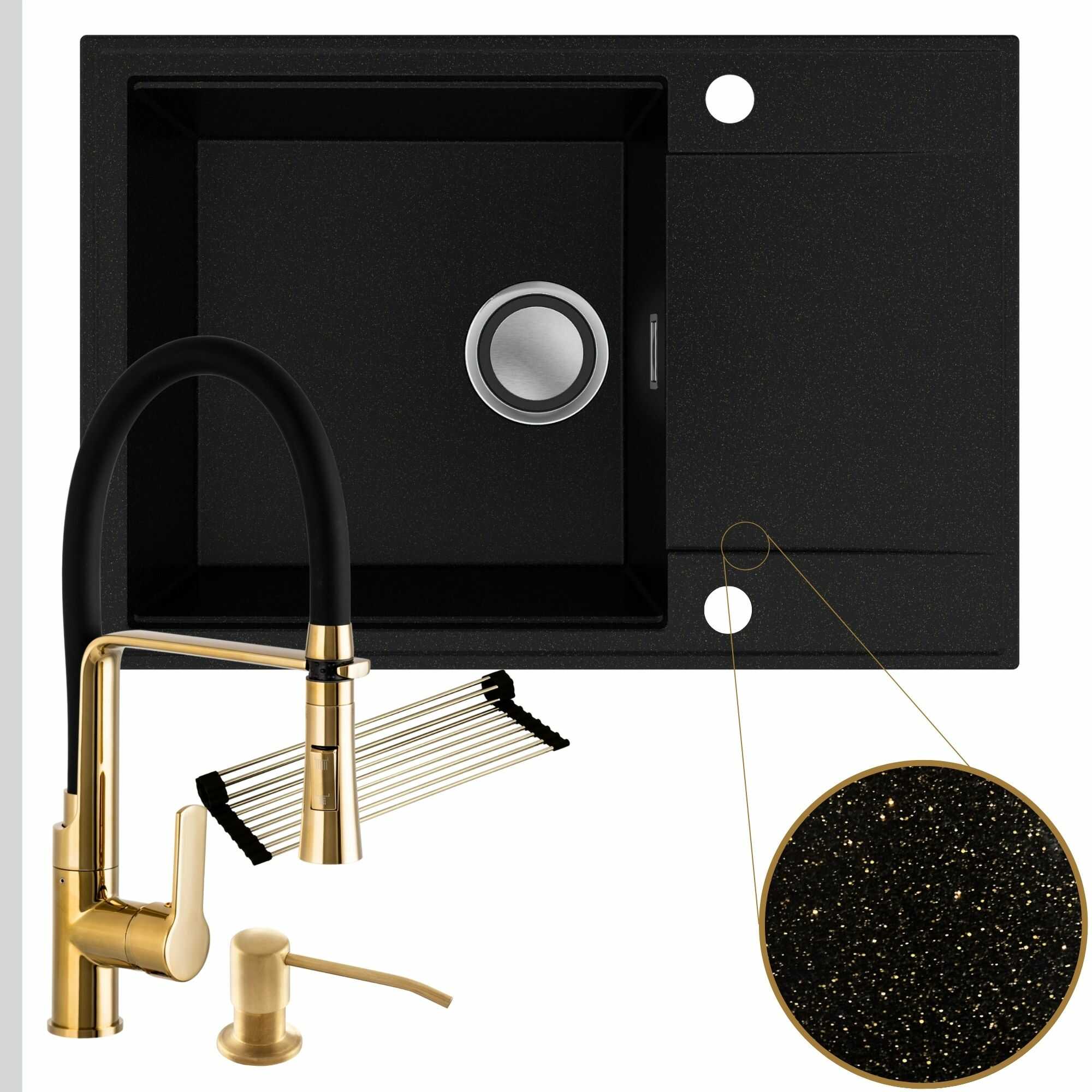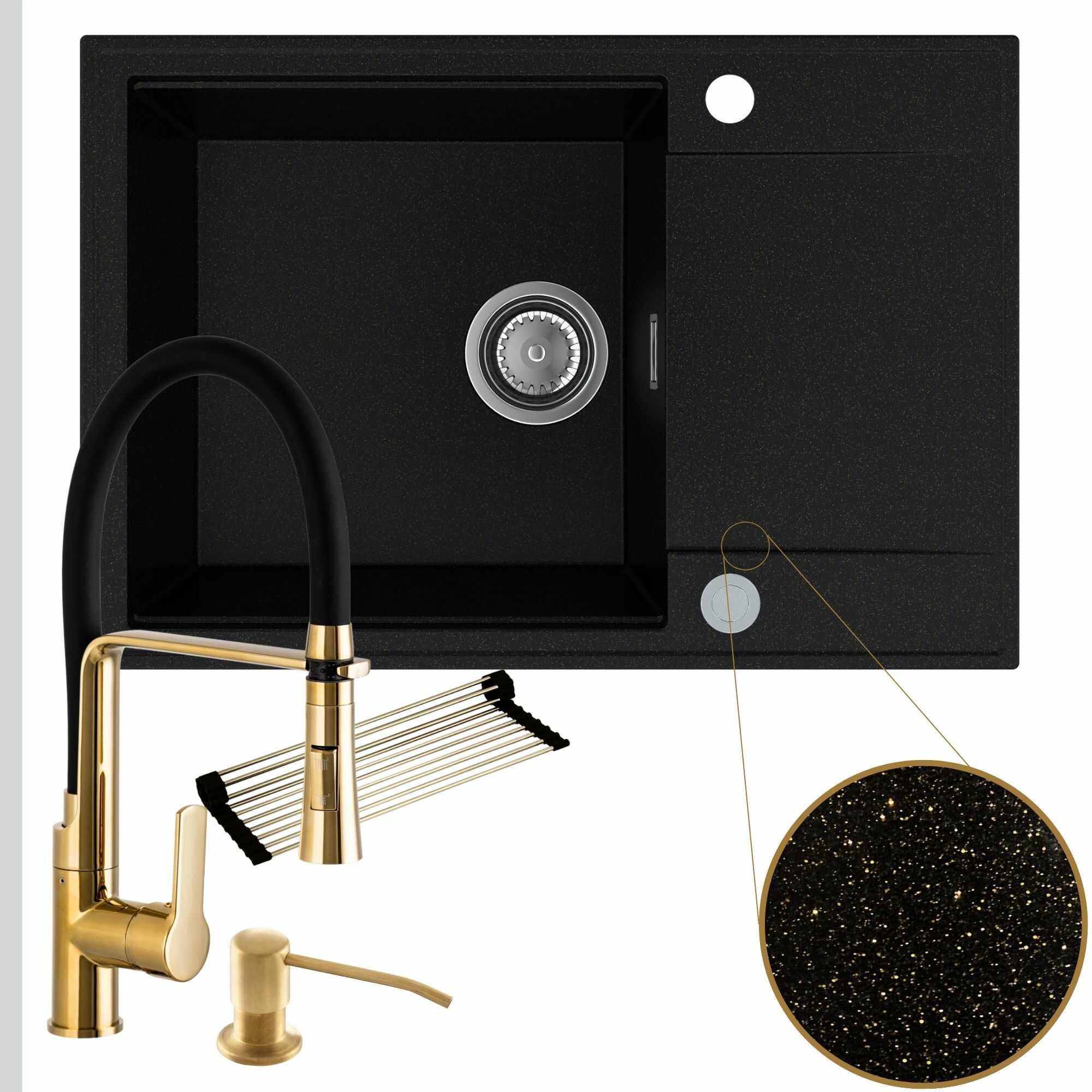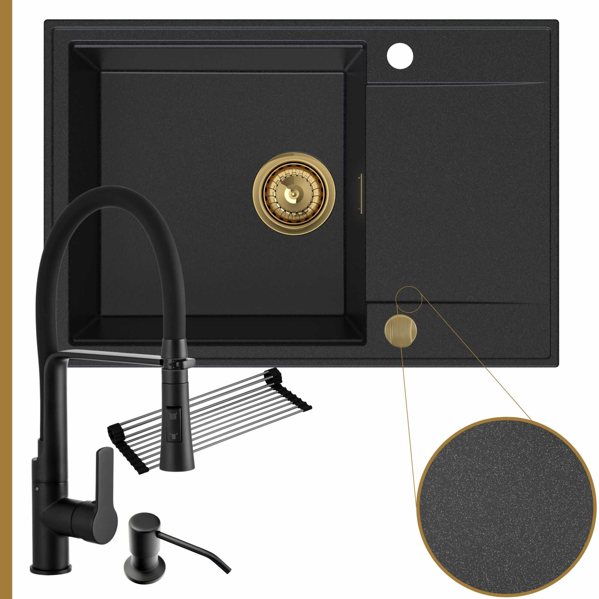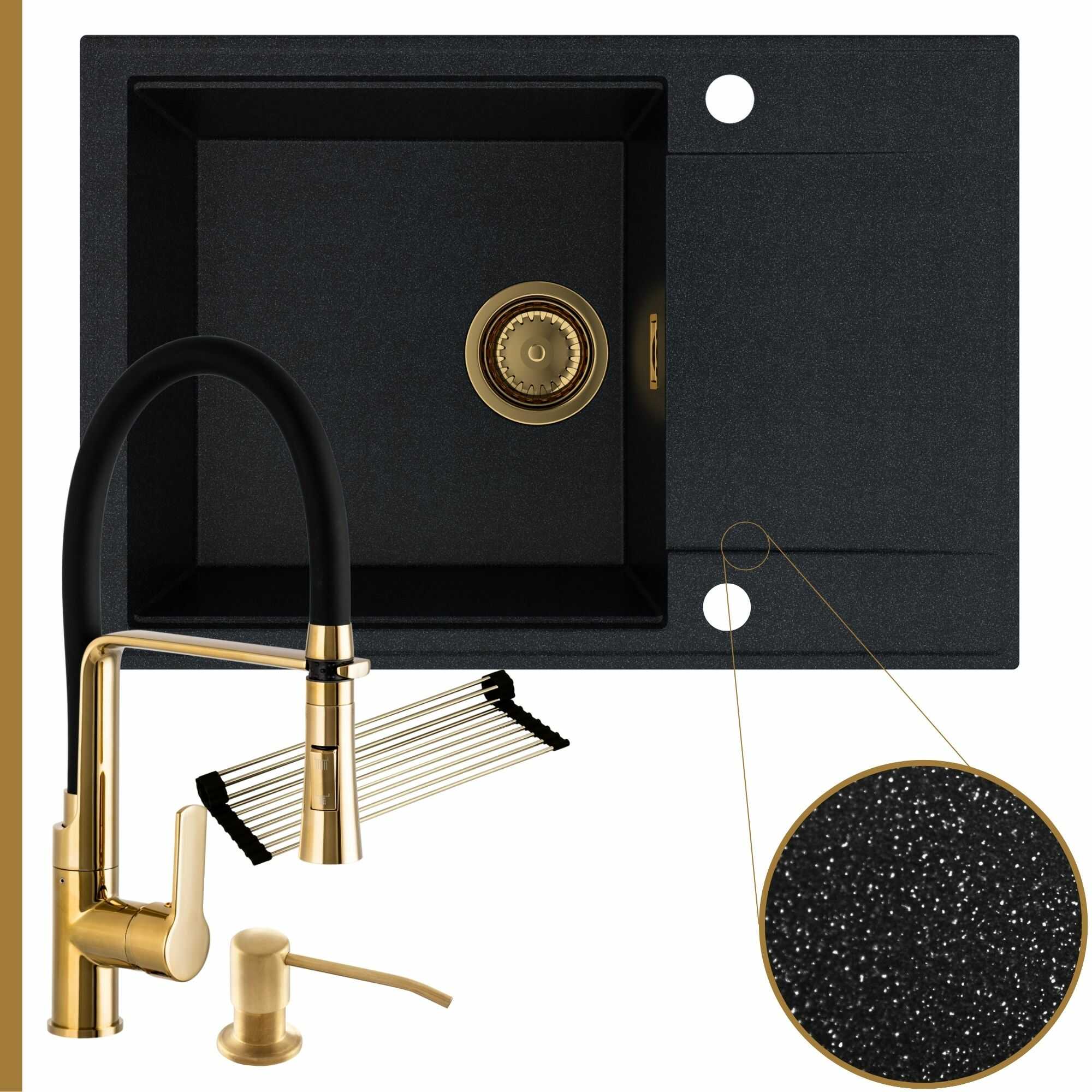 Designerska wysoka bateria kuchenna elastyczna w trzech kolorach: złotym, czarnym lub srebrnym idealnie pasuje kolorystycznie do zlewozmywaków granitowych. Mosiężny korpus połączony z satynowo gładką czarną sylikonową wylewką, tworzy nowoczesne i trwałe rozwiązanie do stylowej kuchni.