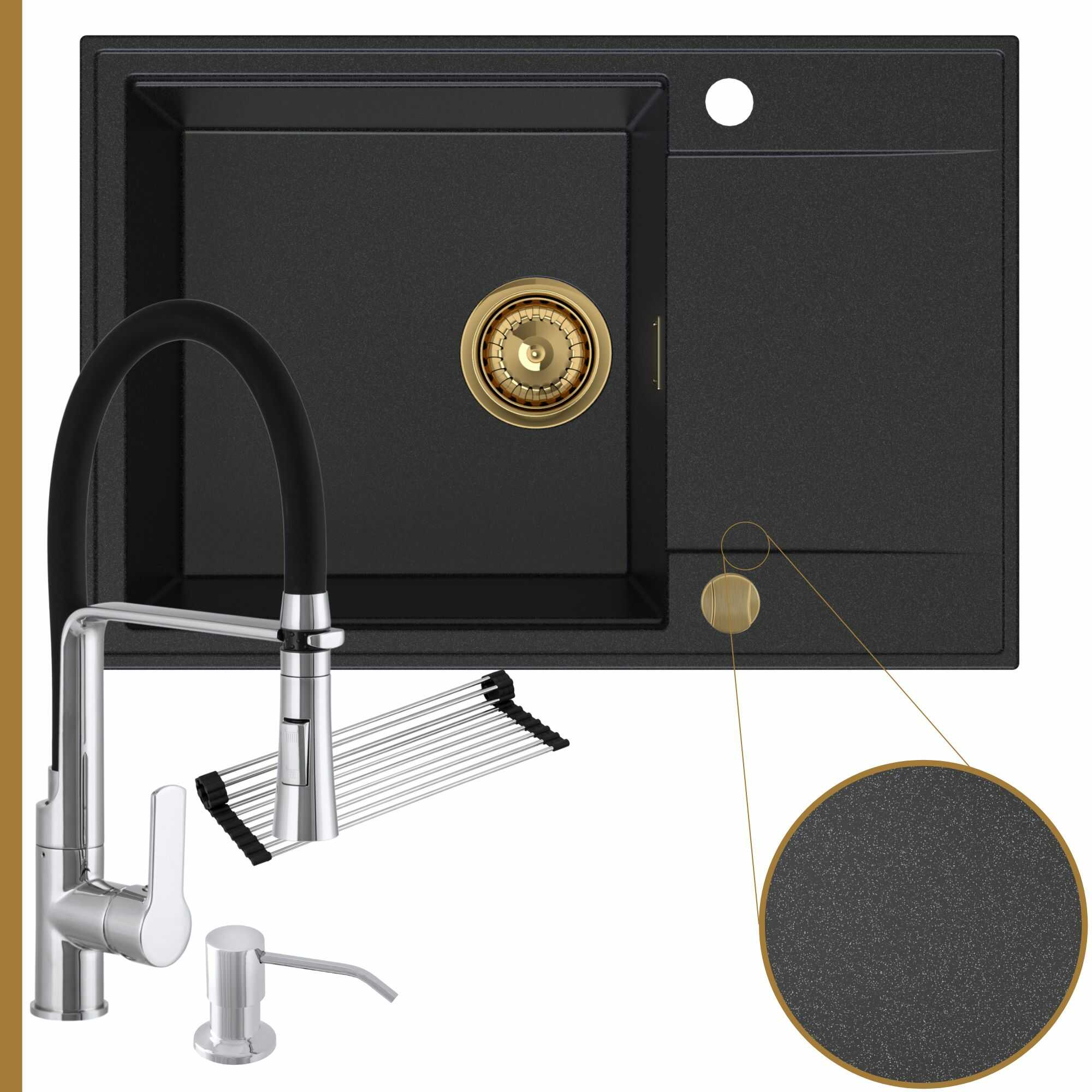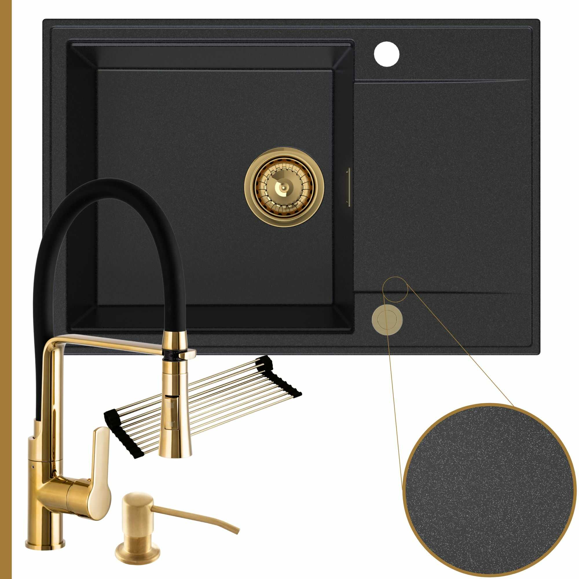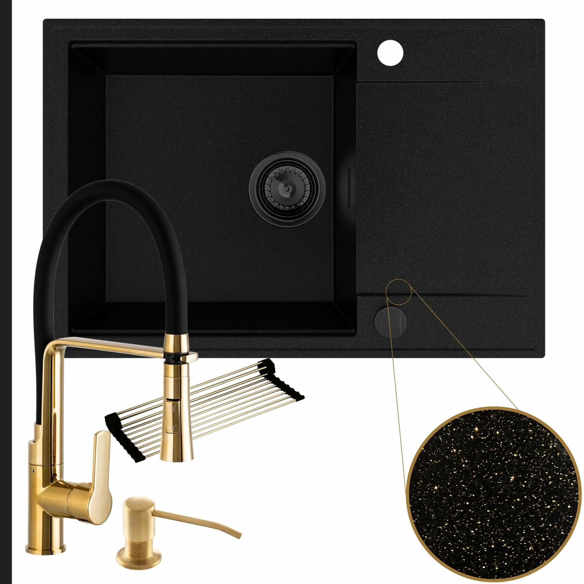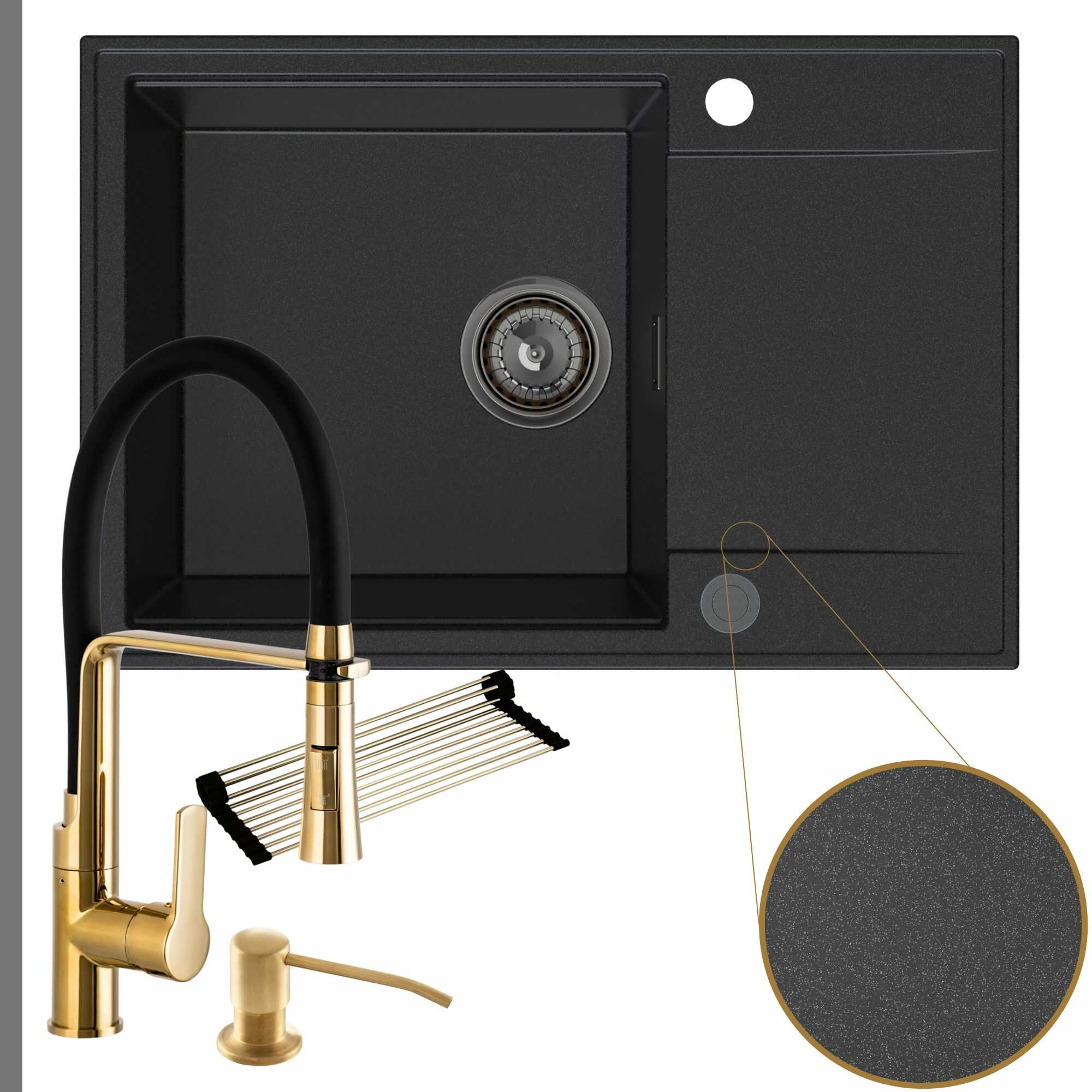 Designerska wysoka bateria kuchenna elastyczna w trzech kolorach: złotym, czarnym lub srebrnym idealnie pasuje kolorystycznie do zlewozmywaków granitowych. Mosiężny korpus połączony z satynowo gładką czarną sylikonową wylewką, tworzy nowoczesne i trwałe rozwiązanie do stylowej kuchni.