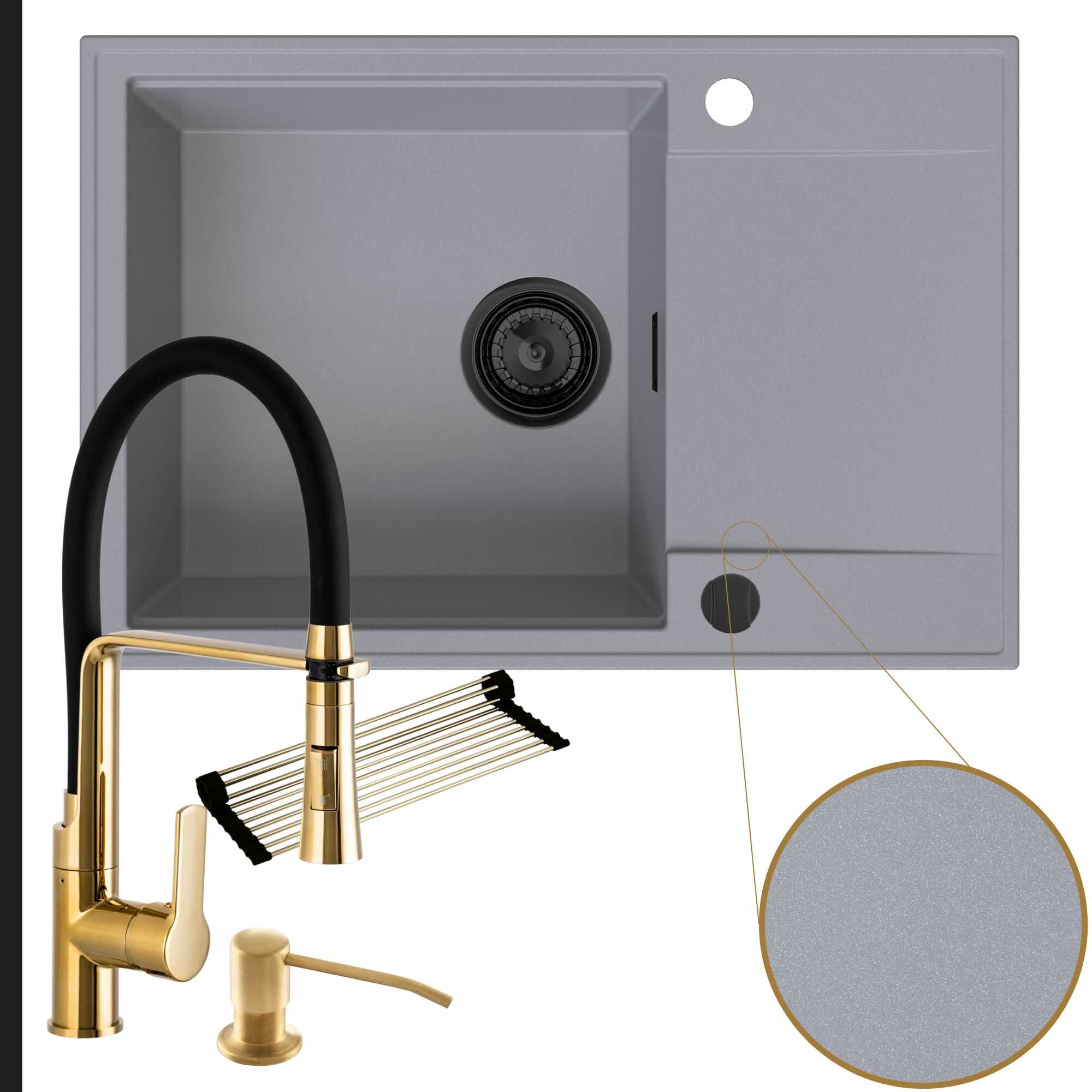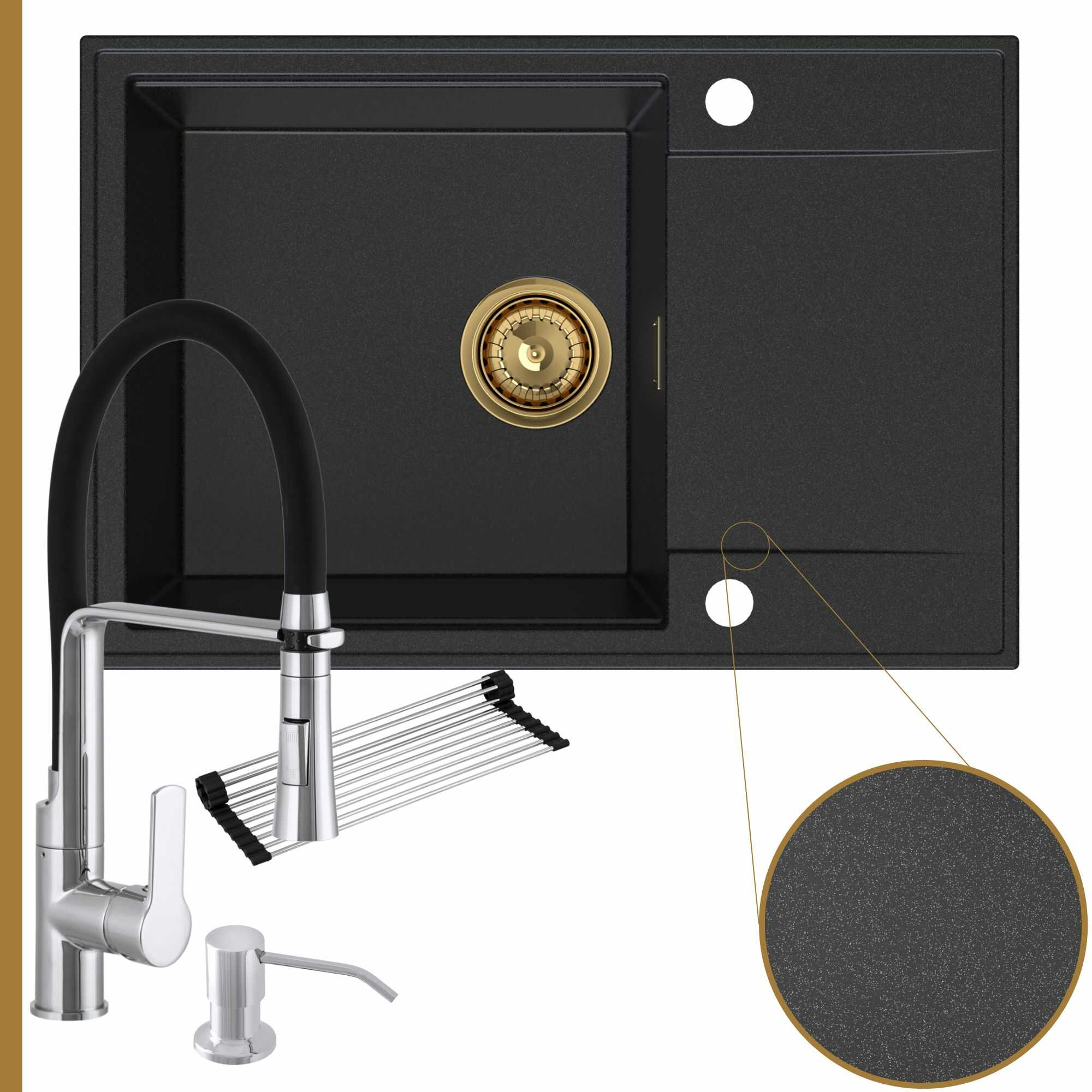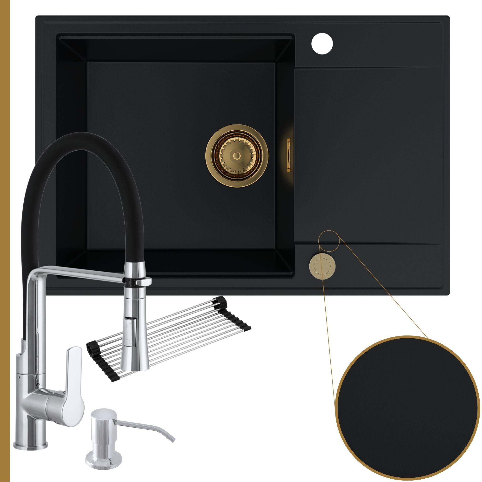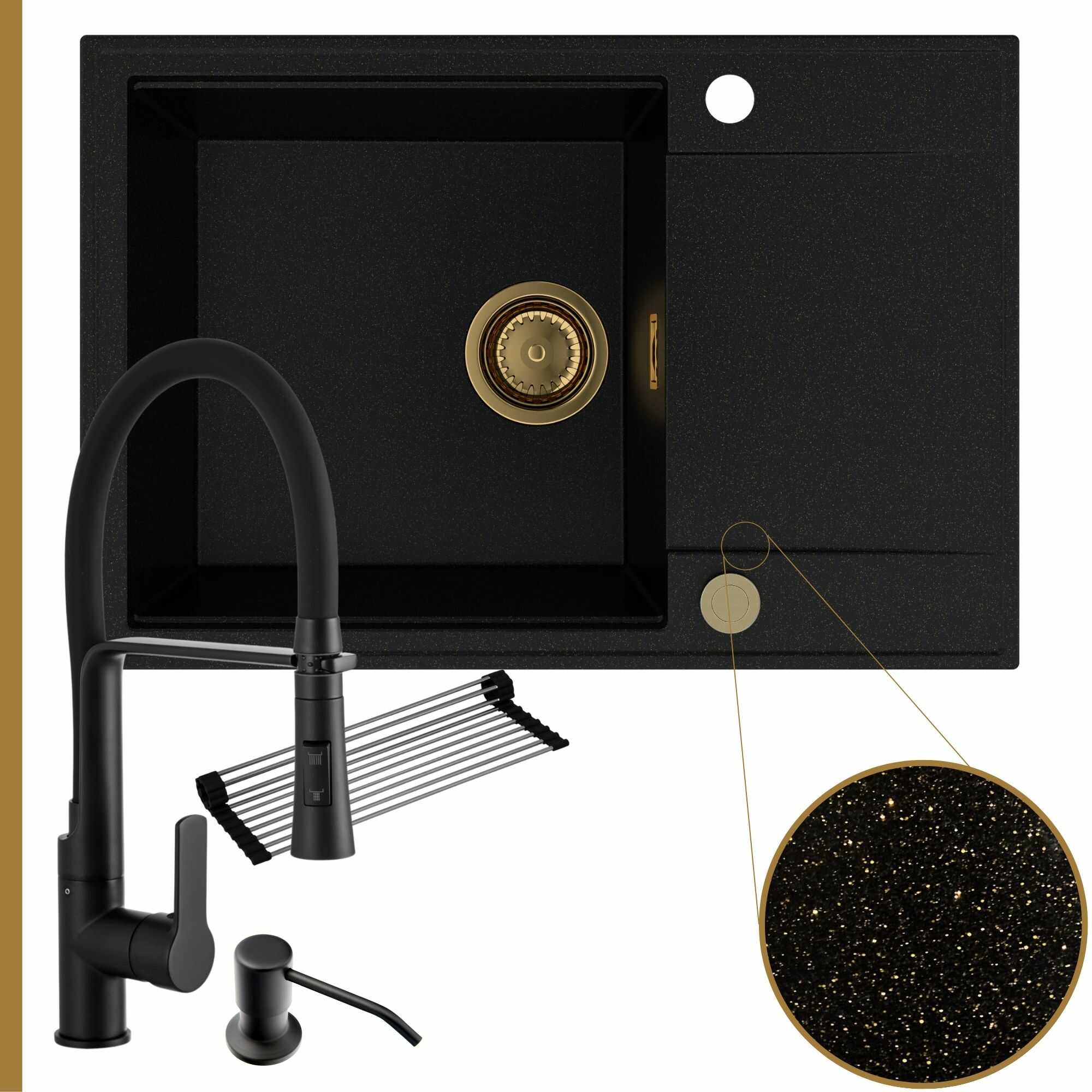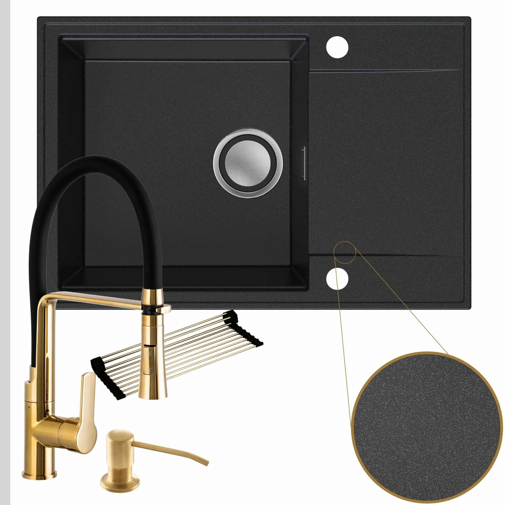 Designerska wysoka bateria kuchenna elastyczna w trzech kolorach: złotym, czarnym lub srebrnym idealnie pasuje kolorystycznie do zlewozmywaków granitowych. Mosiężny korpus połączony z satynowo gładką czarną sylikonową wylewką, tworzy nowoczesne i trwałe rozwiązanie do stylowej kuchni.