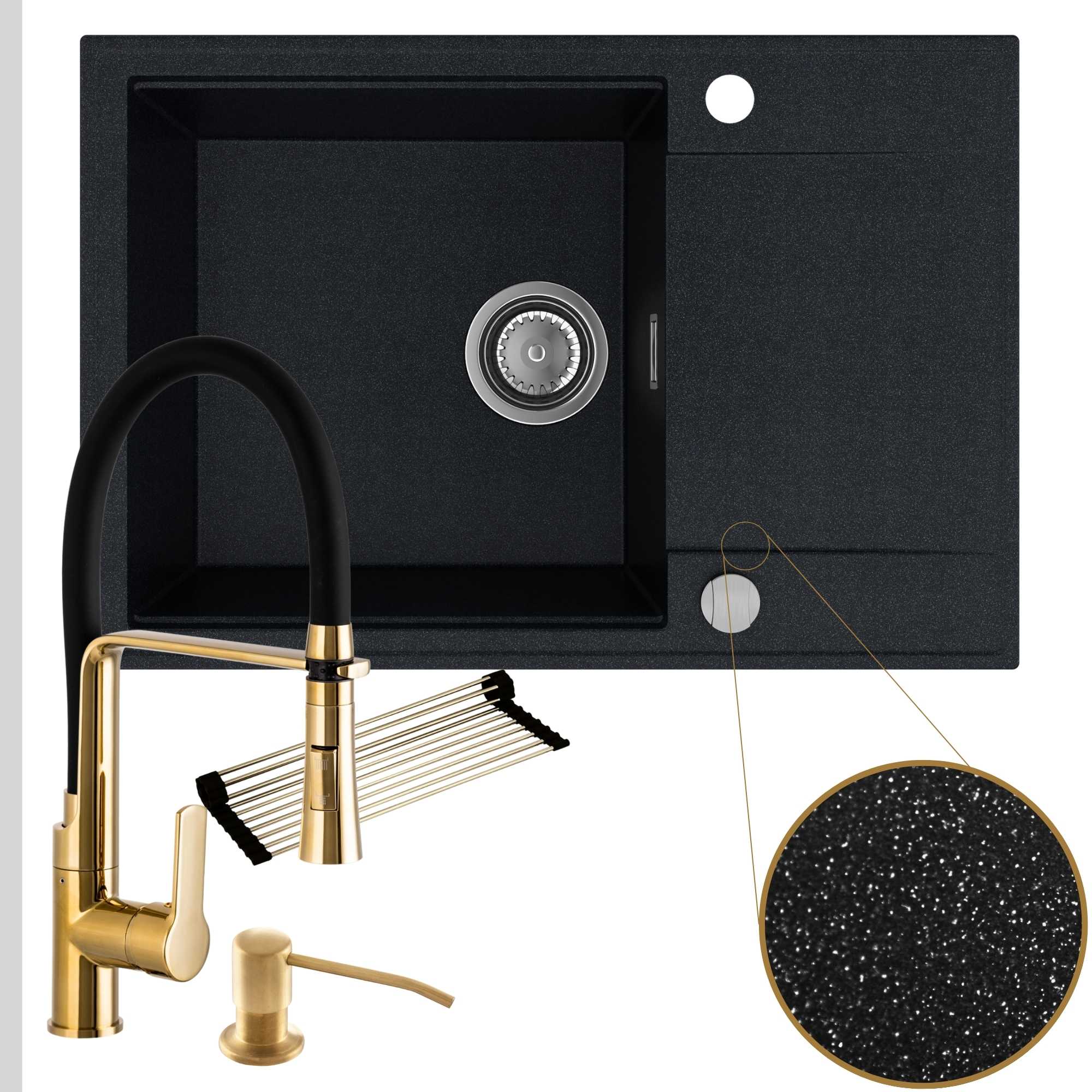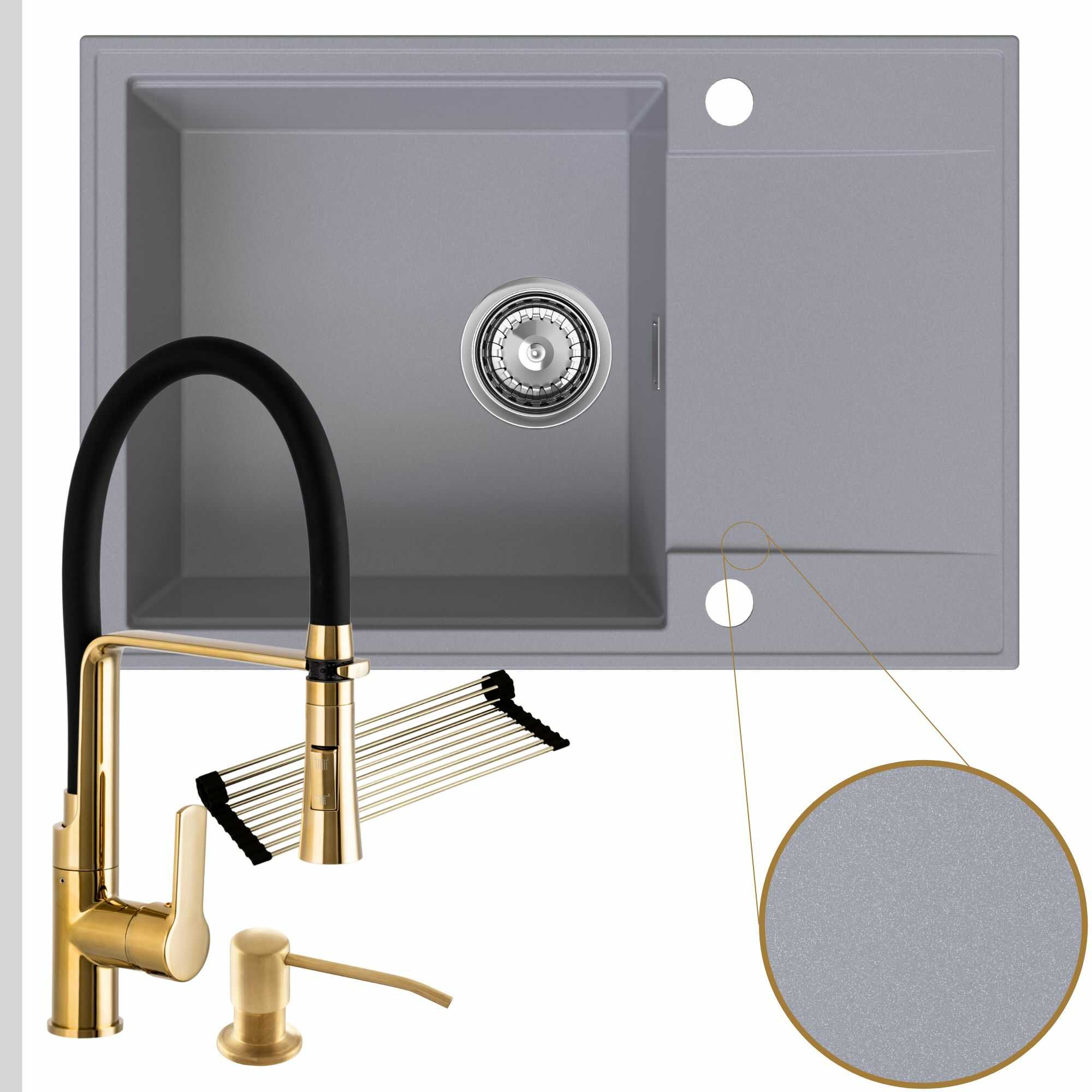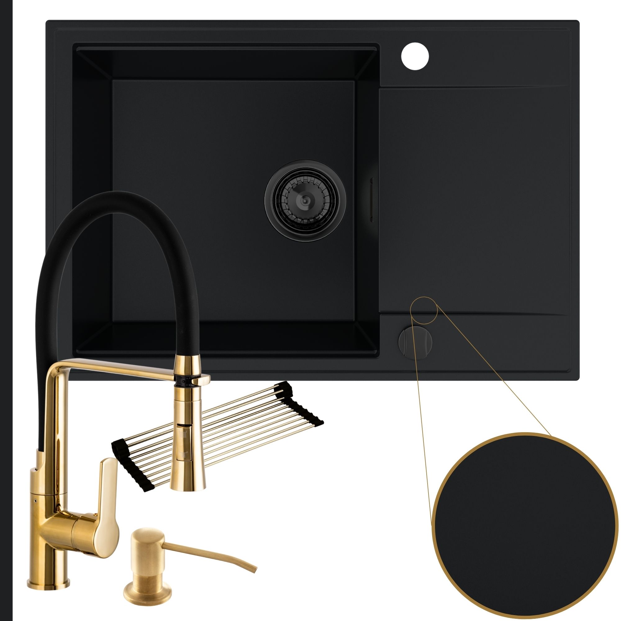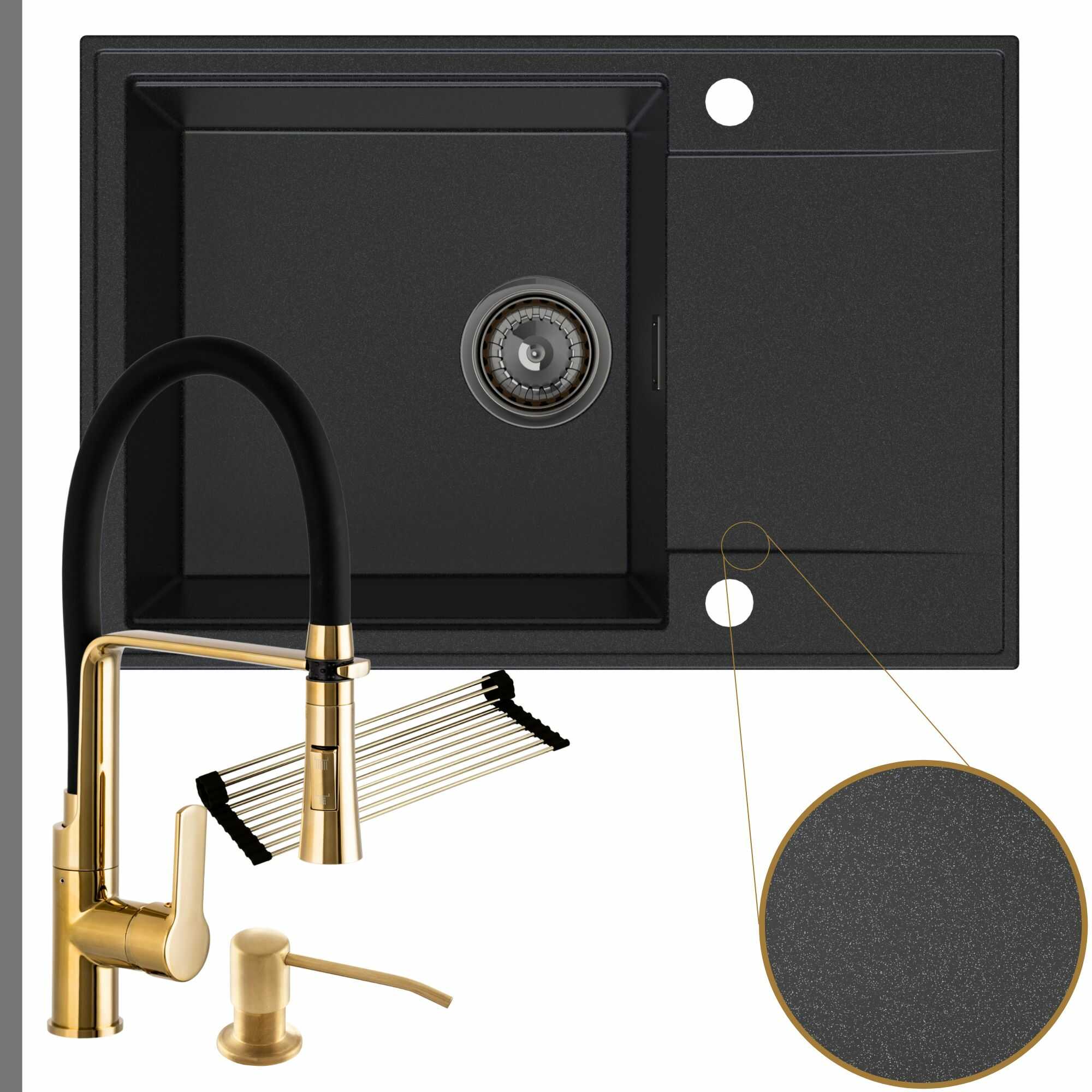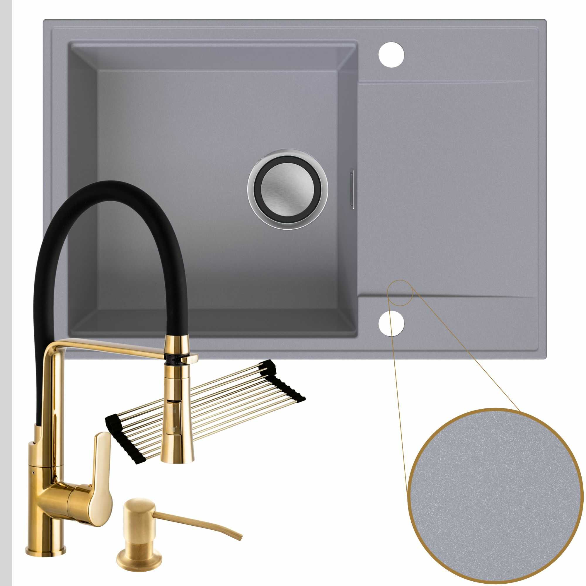 Designerska wysoka bateria kuchenna elastyczna w trzech kolorach: złotym, czarnym lub srebrnym idealnie pasuje kolorystycznie do zlewozmywaków granitowych. Mosiężny korpus połączony z satynowo gładką czarną sylikonową wylewką, tworzy nowoczesne i trwałe rozwiązanie do stylowej kuchni.
