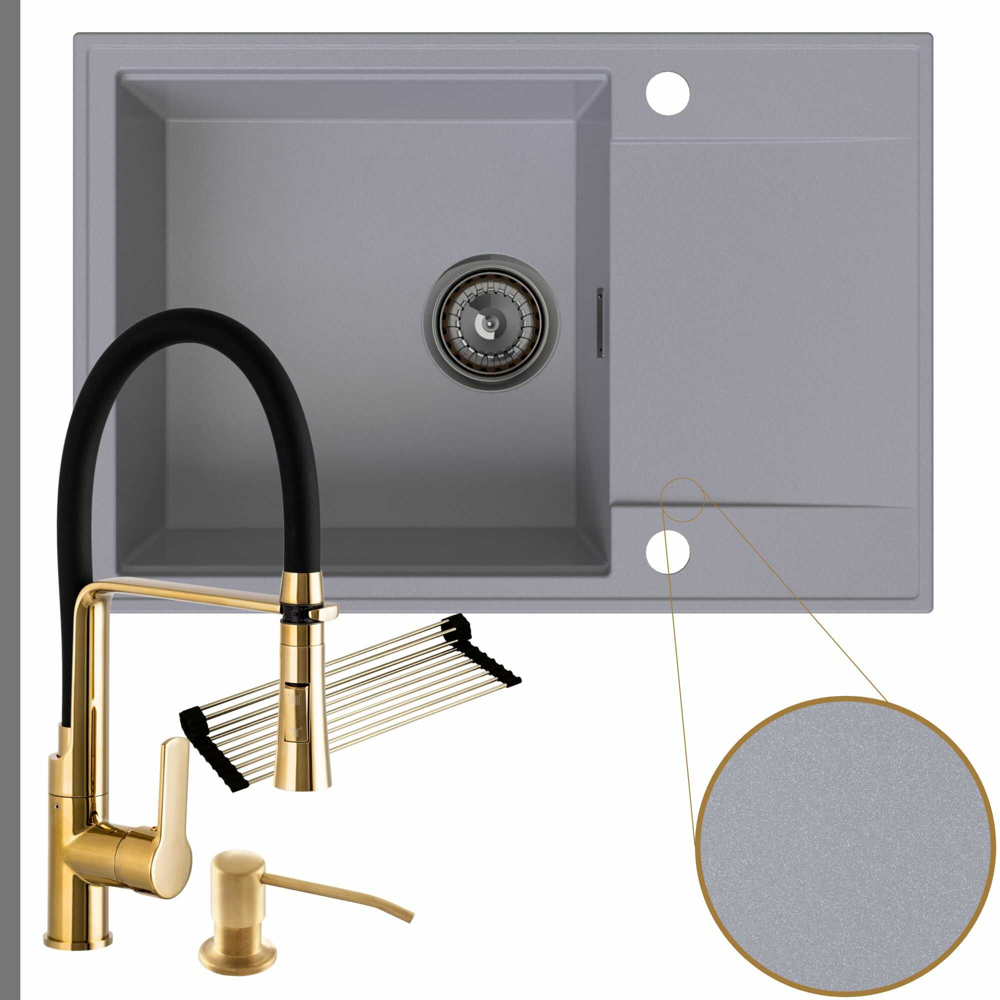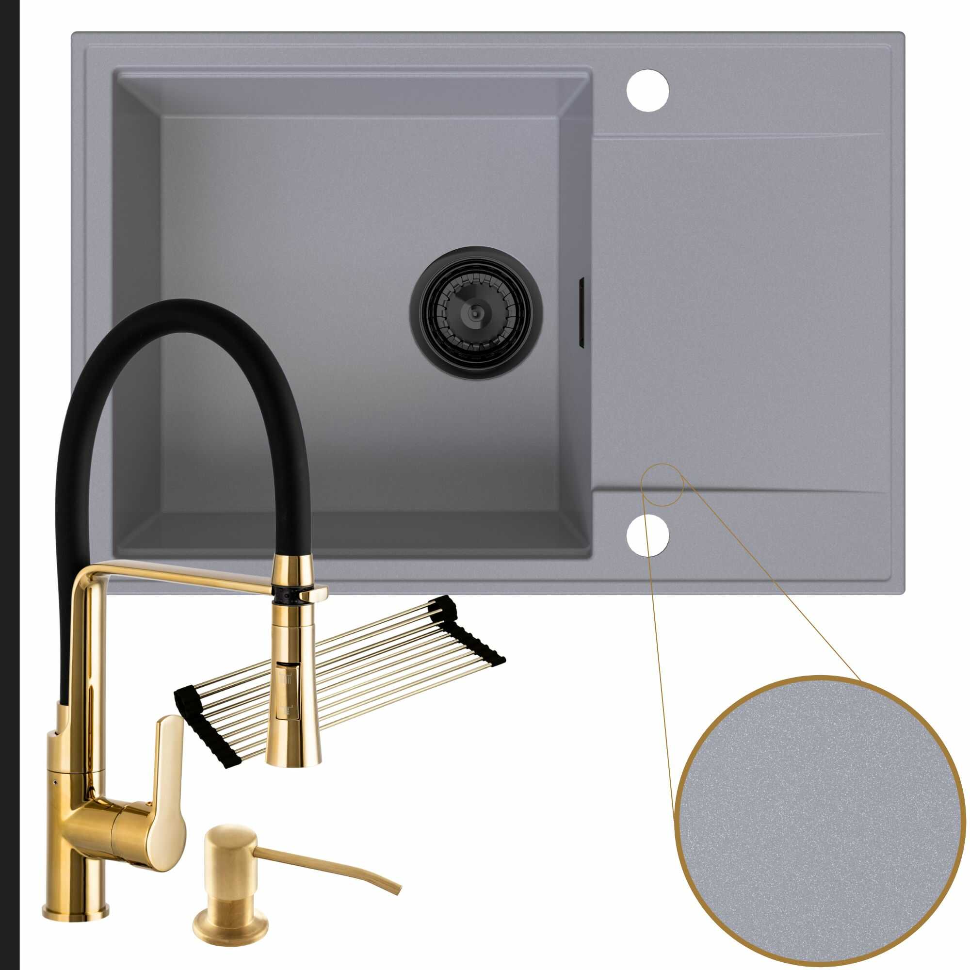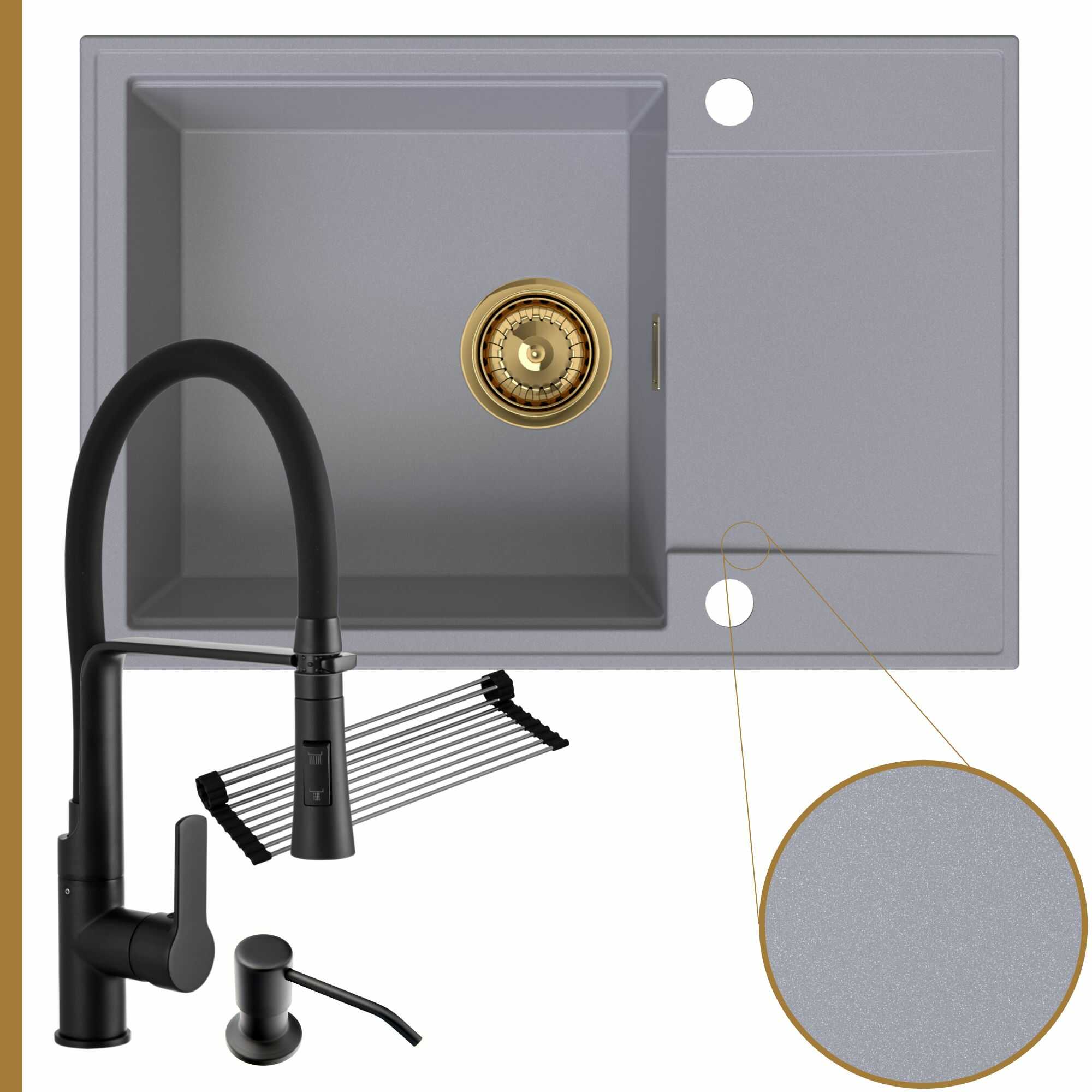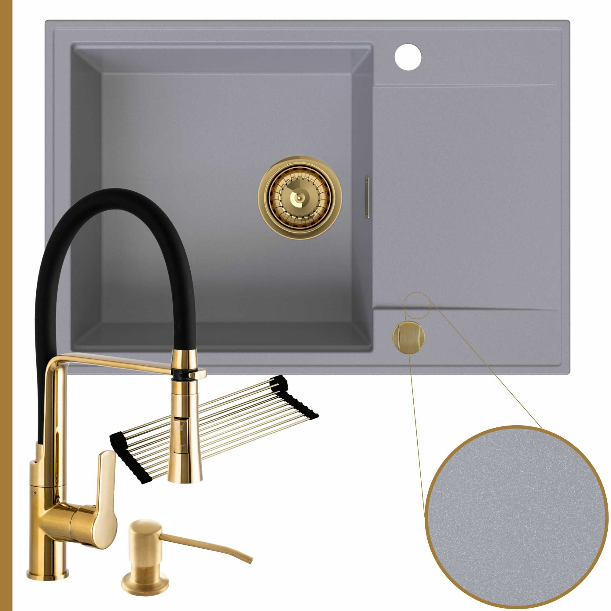 Designerska wysoka bateria kuchenna elastyczna w trzech kolorach: złotym, czarnym lub srebrnym idealnie pasuje kolorystycznie do zlewozmywaków granitowych. Mosiężny korpus połączony z satynowo gładką czarną sylikonową wylewką, tworzy nowoczesne i trwałe rozwiązanie do stylowej kuchni.