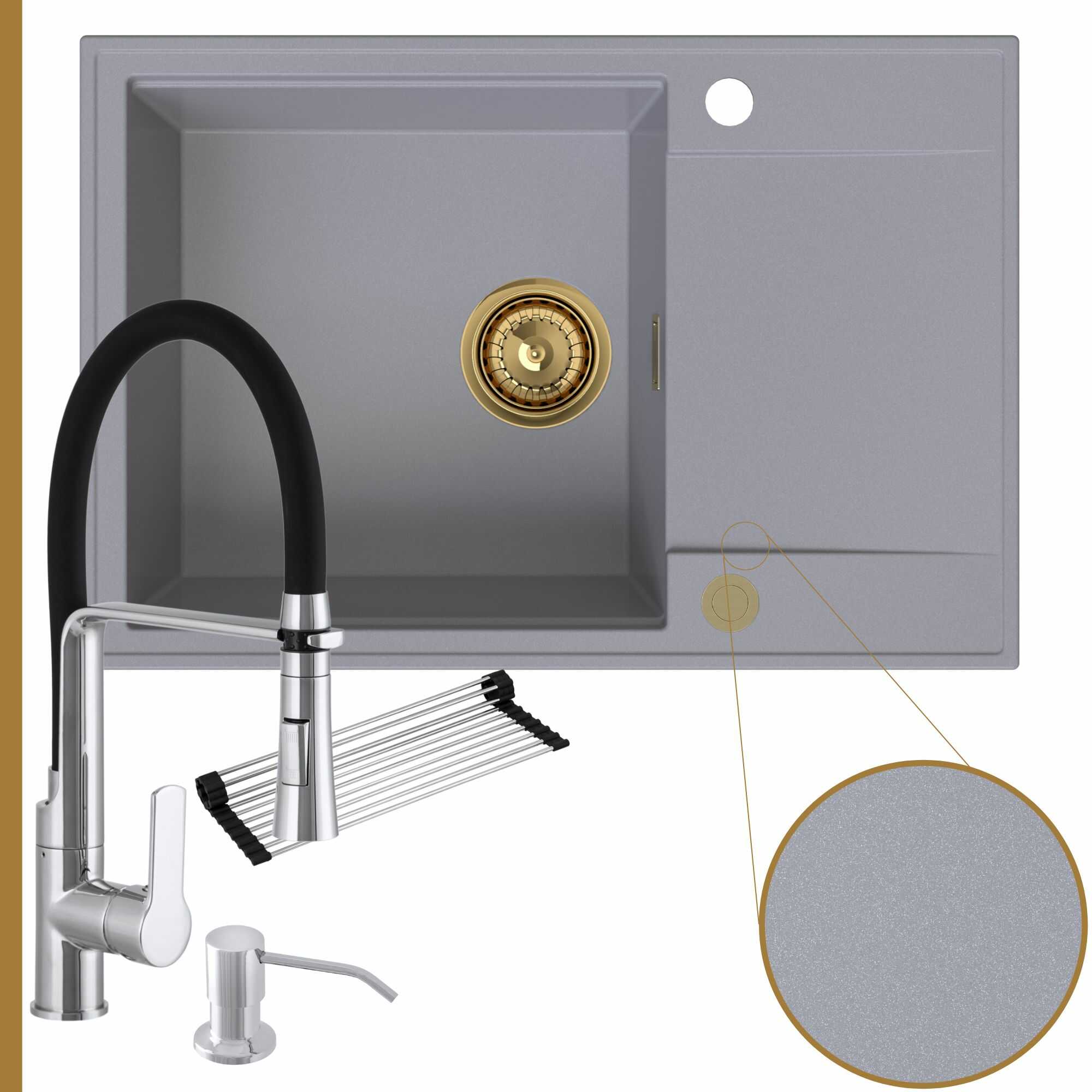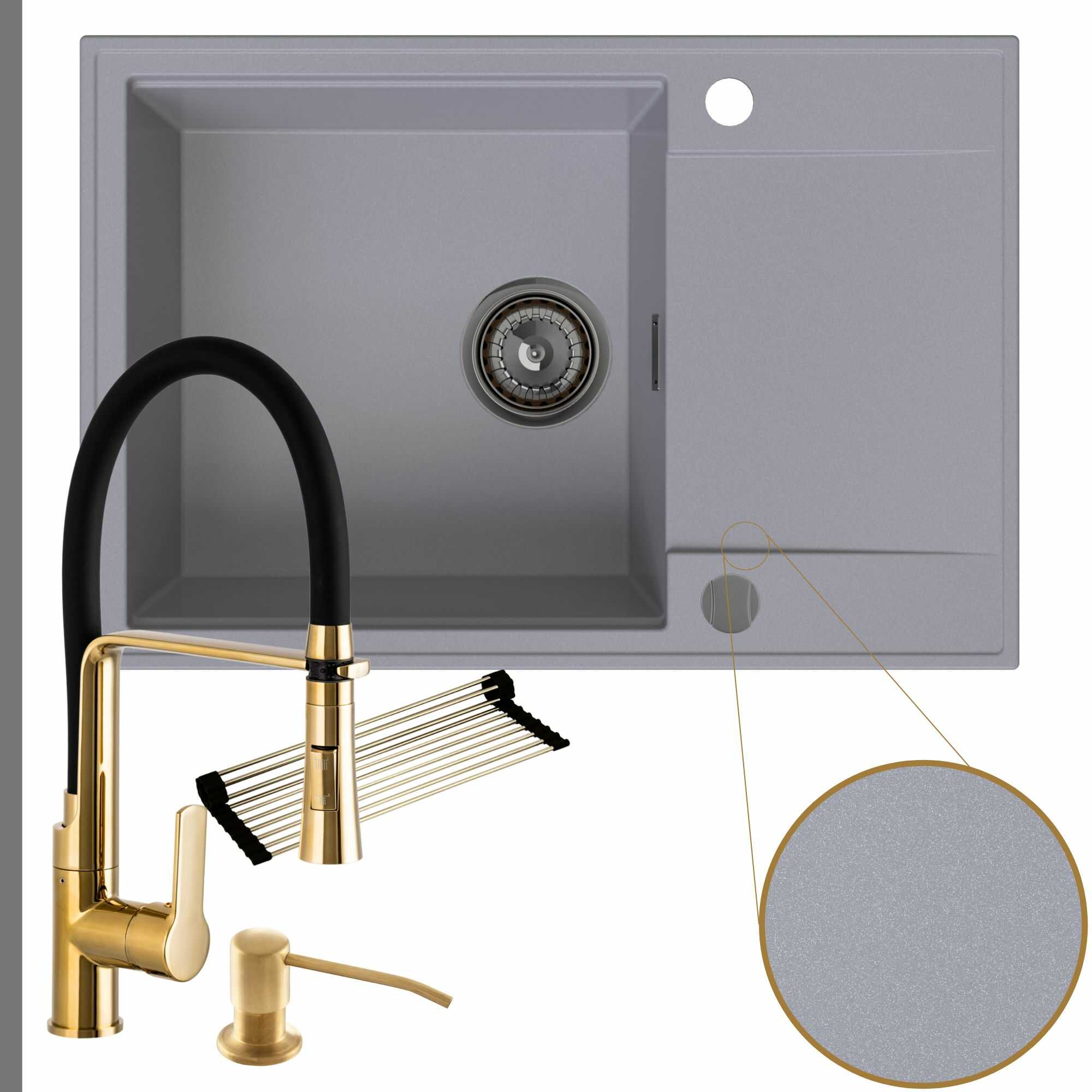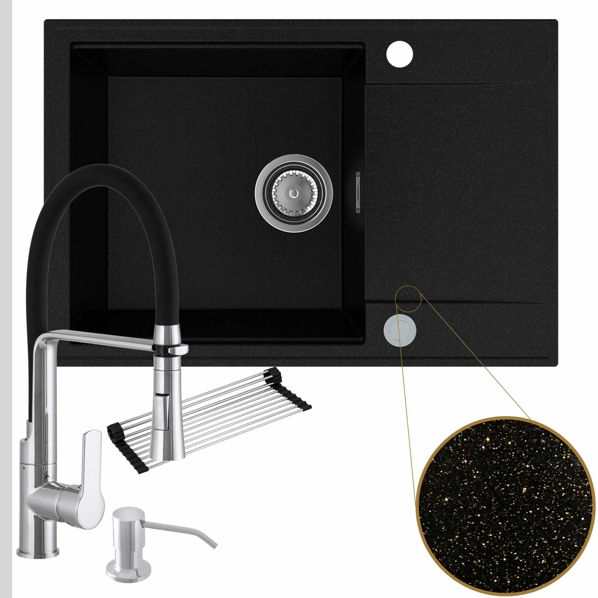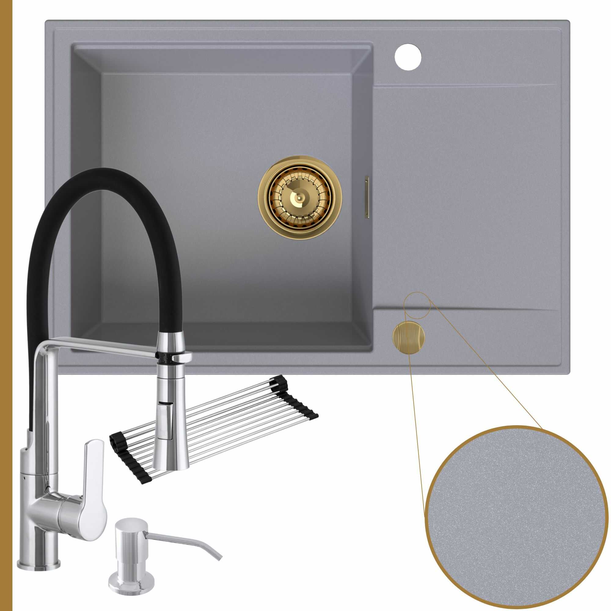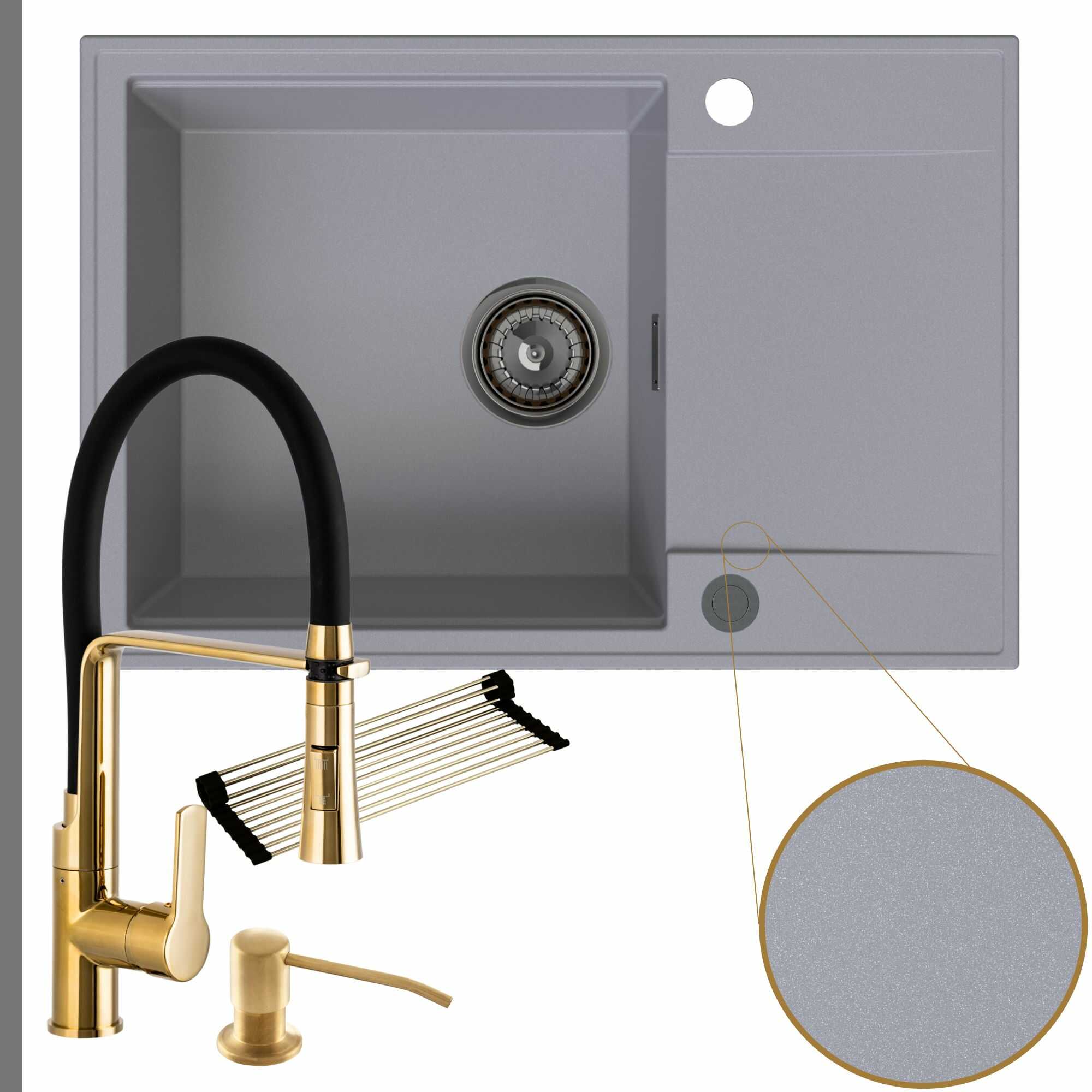 Designerska wysoka bateria kuchenna elastyczna w trzech kolorach: złotym, czarnym lub srebrnym idealnie pasuje kolorystycznie do zlewozmywaków granitowych. Mosiężny korpus połączony z satynowo gładką czarną sylikonową wylewką, tworzy nowoczesne i trwałe rozwiązanie do stylowej kuchni.